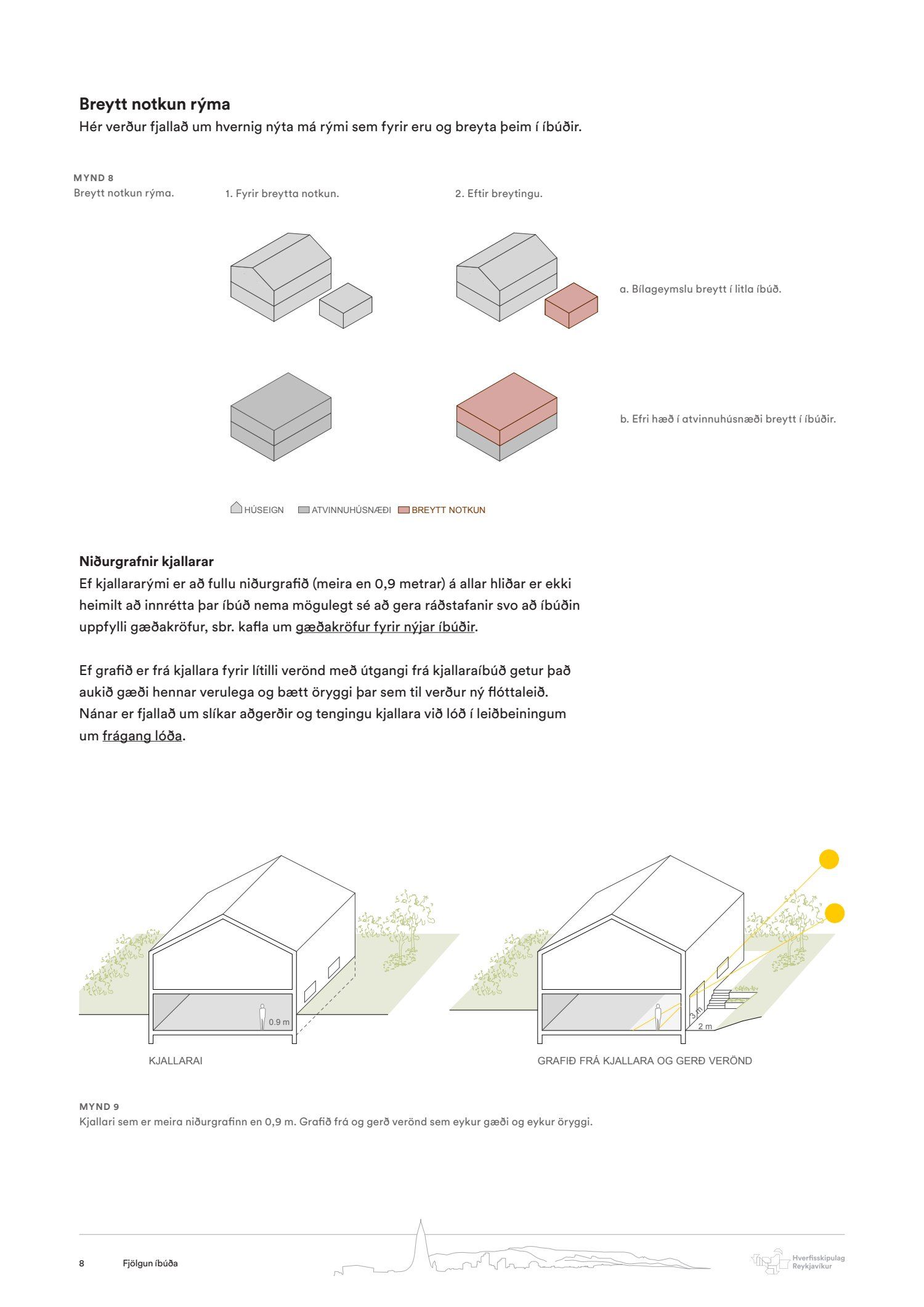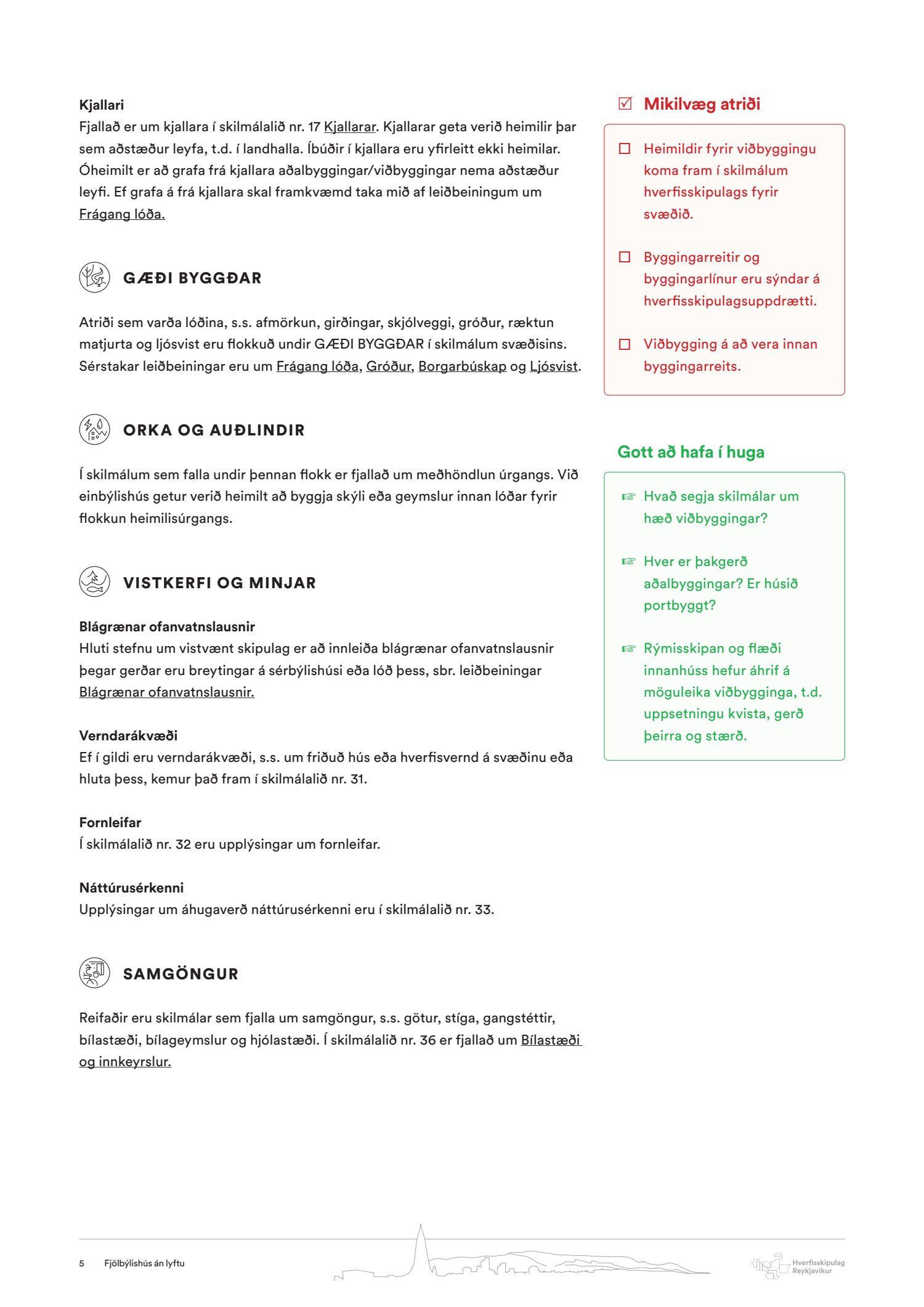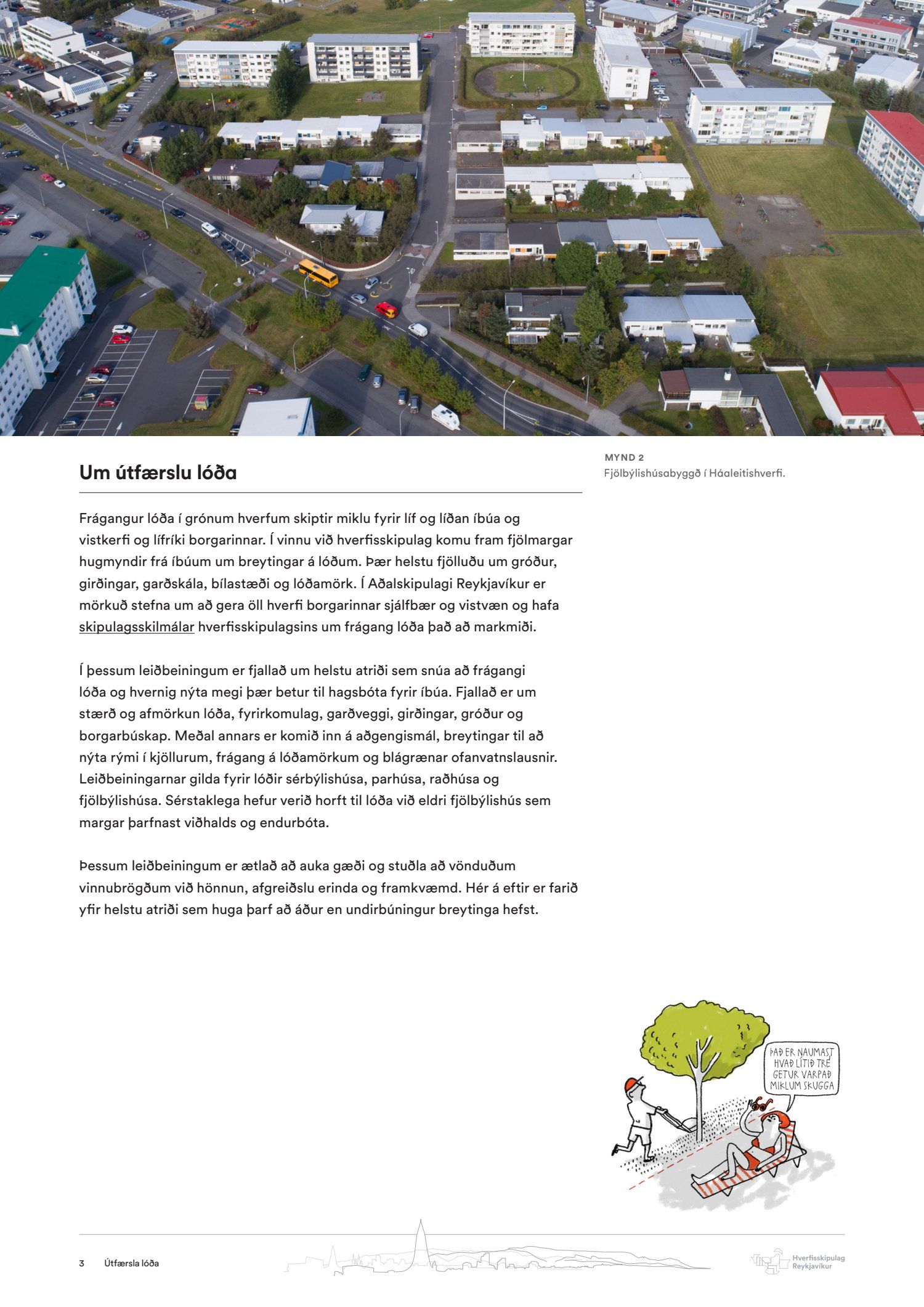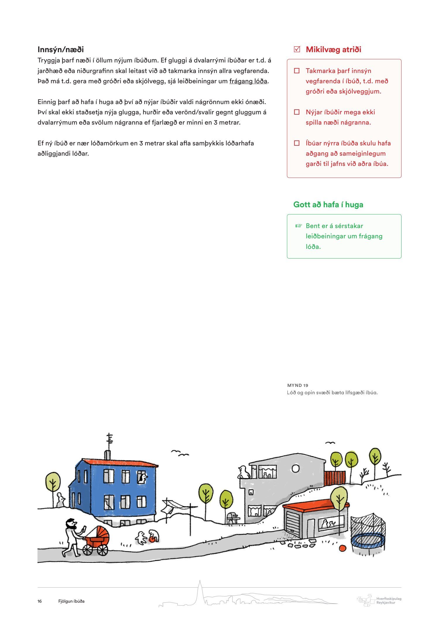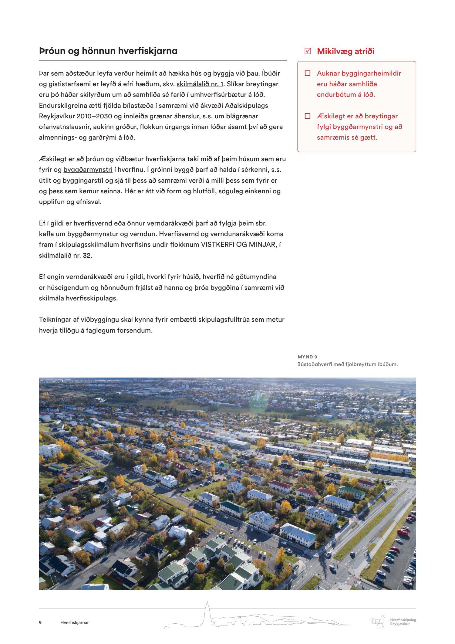 Lagðar fram leiðbeiningar um 1. Starfsemi í íbúðabyggð, 2. Fjölgun íbúða, 3. Viðbyggingar við einbýlishús, 4. Parhús og raðhús, 5. Fjölbýlishús án lyftu, 6. Borgarbúskapur, 7. Borgargötur, 8. Hverfiskjarnar, 9. Þakbreytingar, 10. svalir og útlitsbreytingar á húsum, 11. Almenningsrými, 12. Ljósvist, 13. Útfærsla lóða og 14. Blágrænar ofanvatnslausnir.