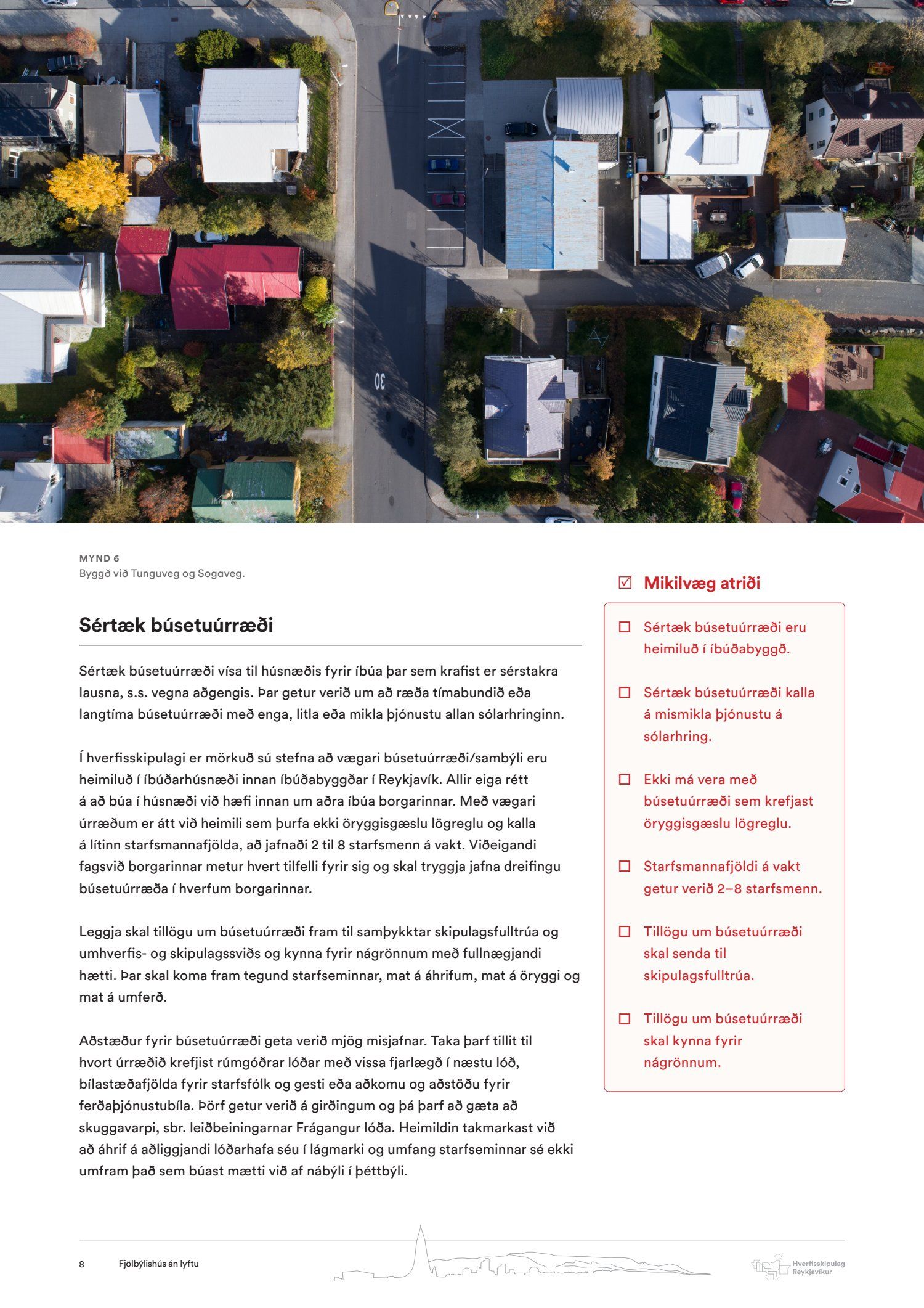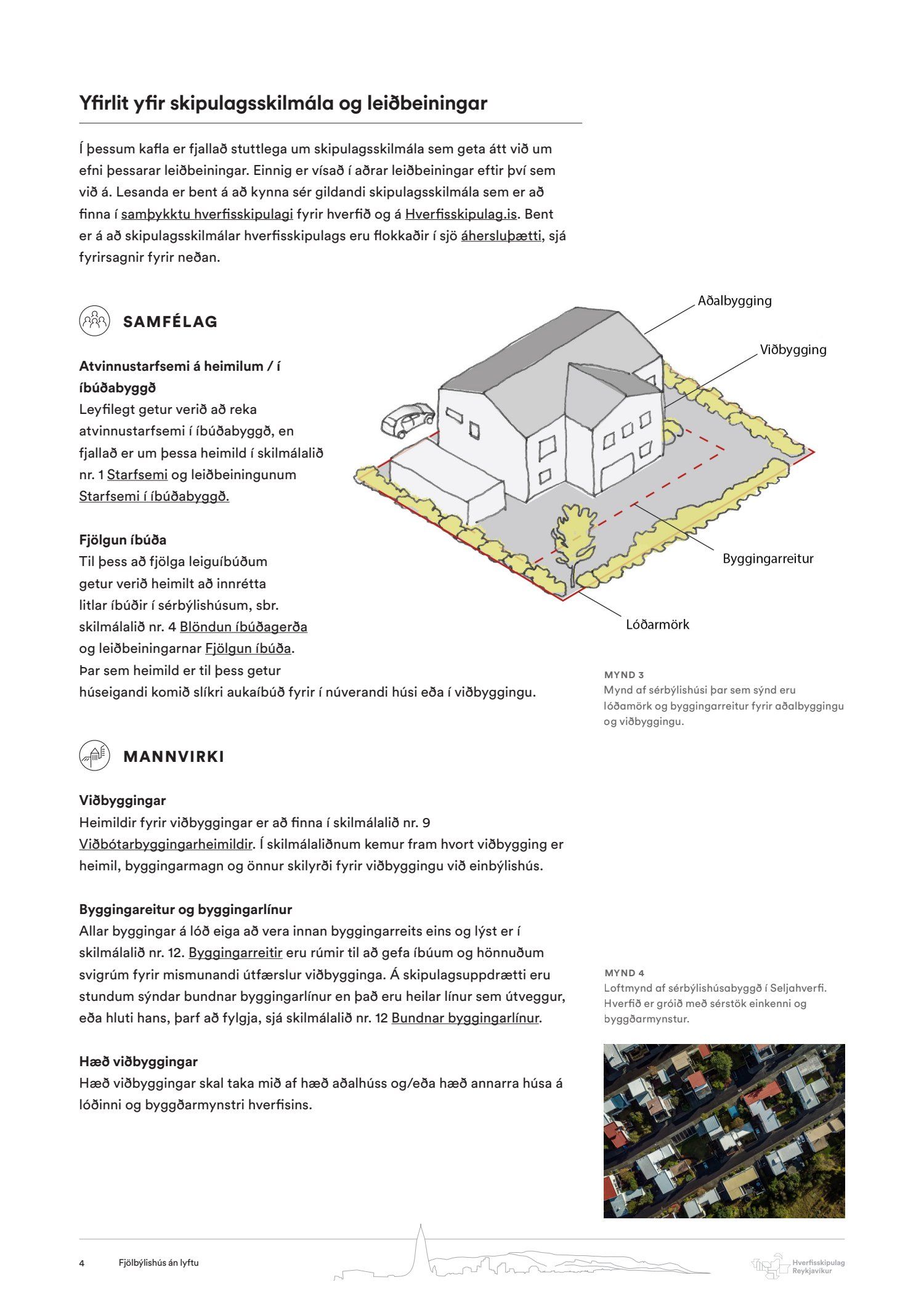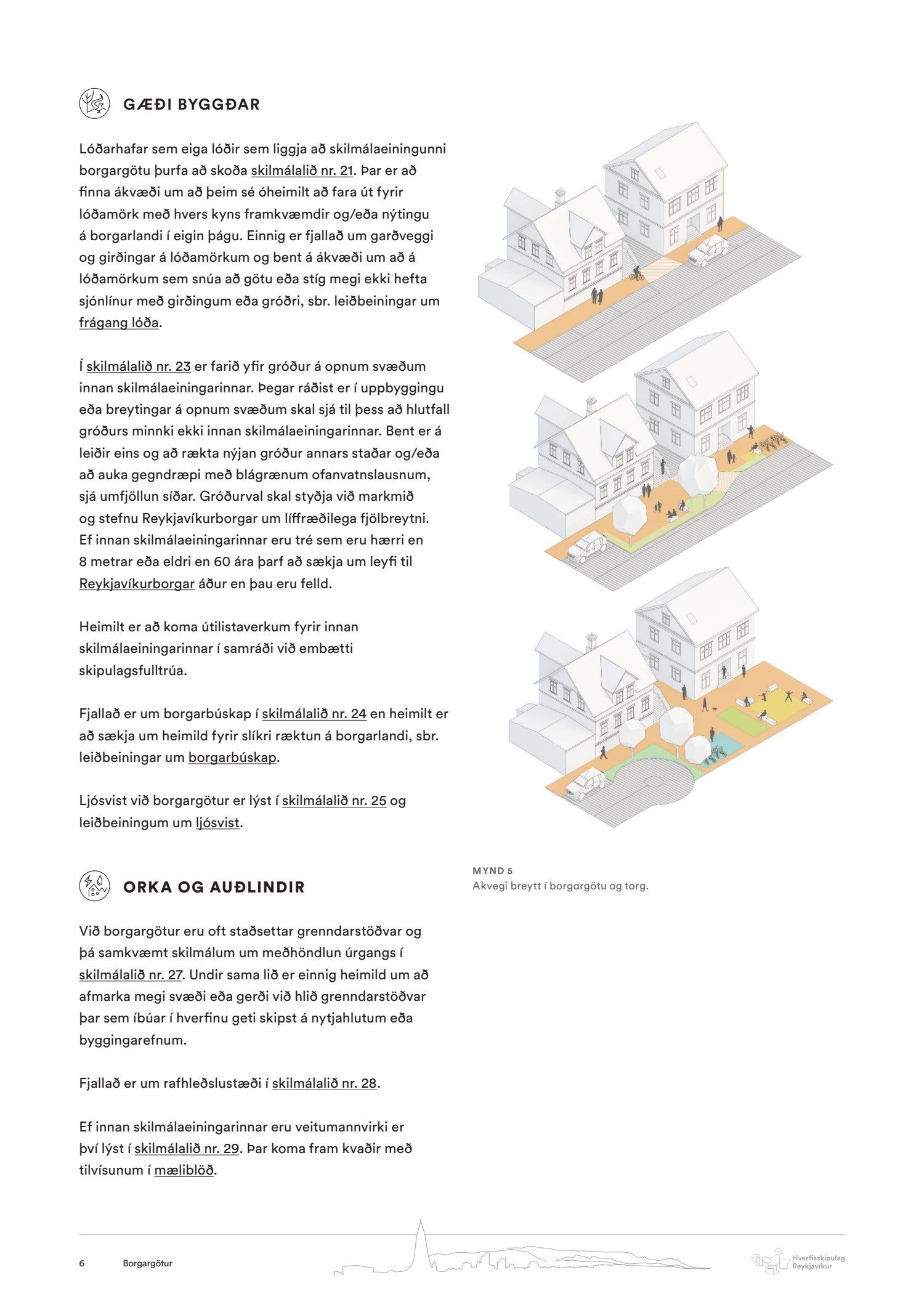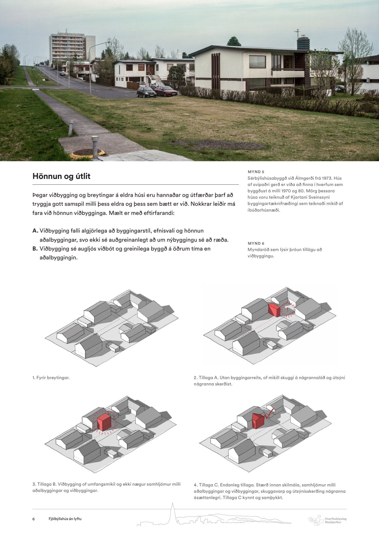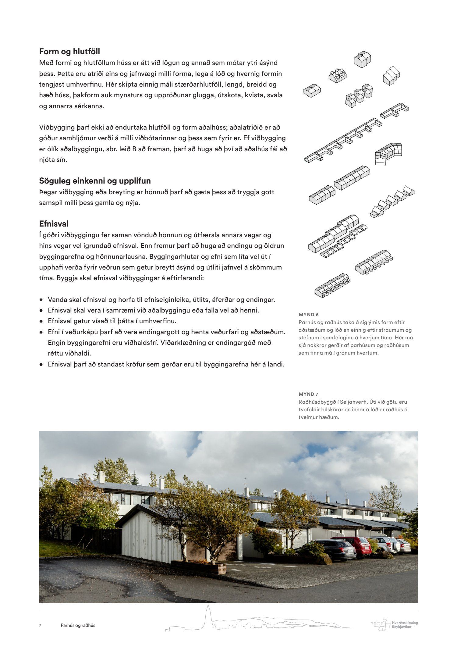Lagðar fram leiðbeiningar um 1. Starfsemi í íbúðabyggð, 2. Fjölgun íbúða, 3. Viðbyggingar við einbýlishús, 4. Parhús og raðhús, 5. Fjölbýlishús án lyftu, 6. Borgarbúskapur, 7. Borgargötur, 8. Hverfiskjarnar, 9. Þakbreytingar, 10. svalir og útlitsbreytingar á húsum, 11. Almenningsrými, 12. Ljósvist, 13. Útfærsla lóða og 14. Blágrænar ofanvatnslausnir.