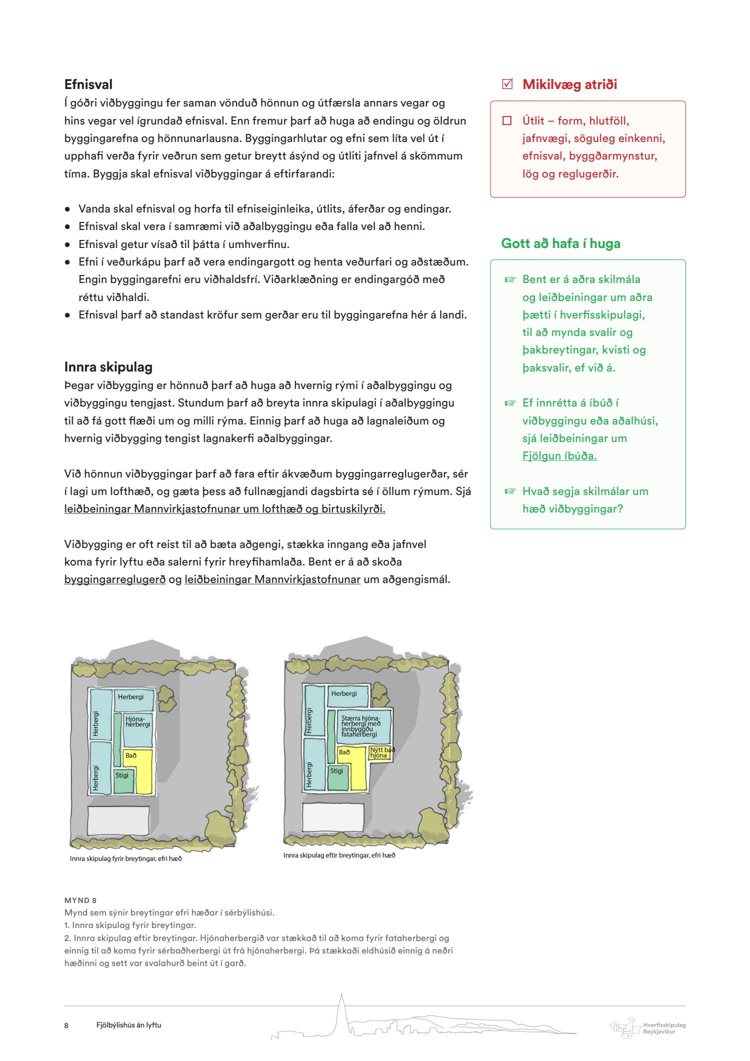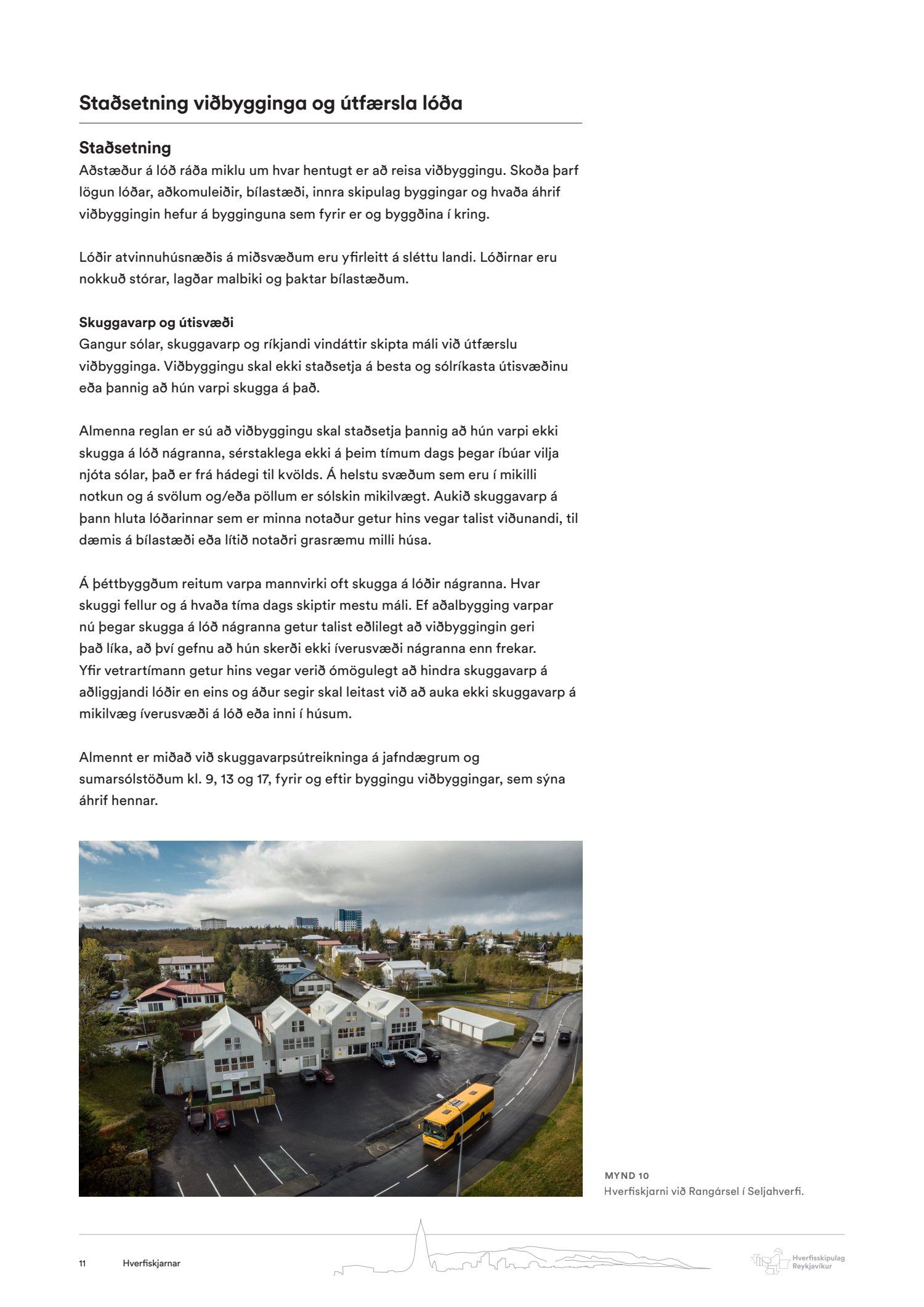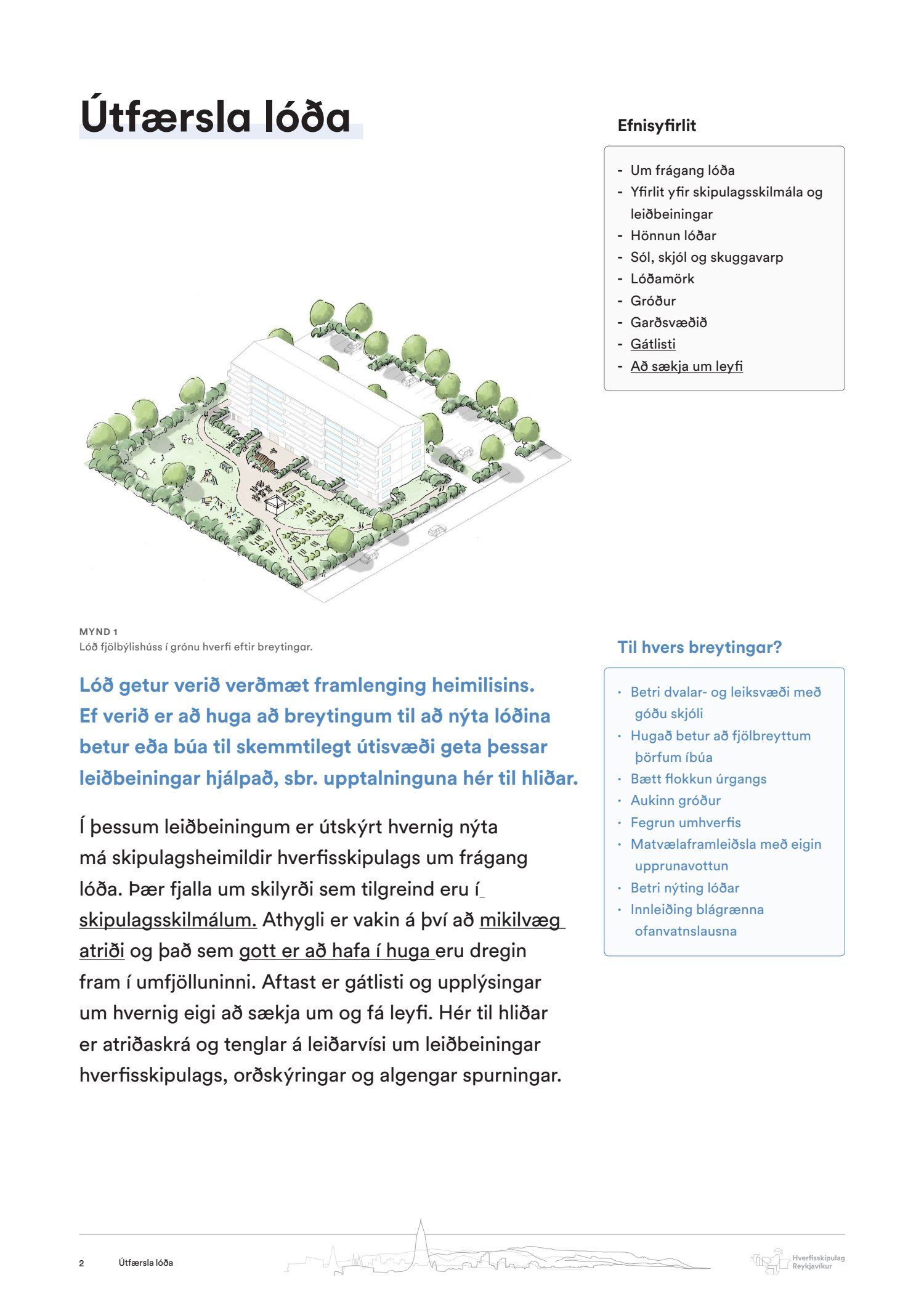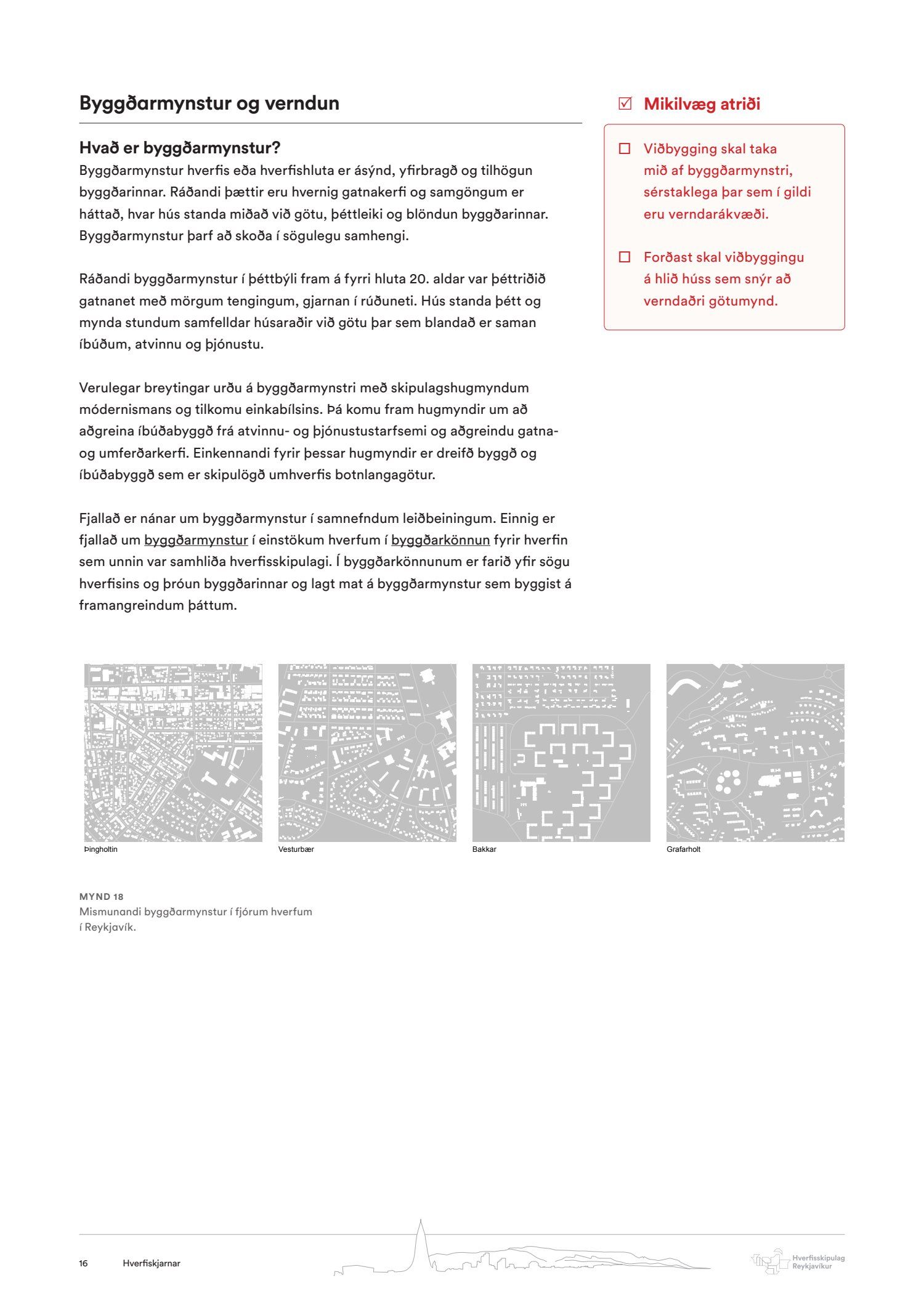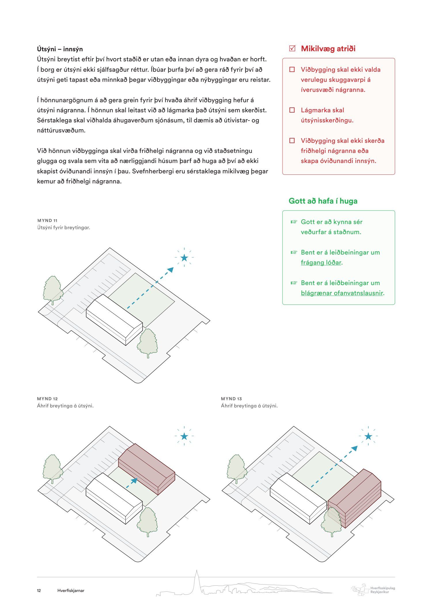 Lagðar fram leiðbeiningar um 1. Starfsemi í íbúðabyggð, 2. Fjölgun íbúða, 3. Viðbyggingar við einbýlishús, 4. Parhús og raðhús, 5. Fjölbýlishús án lyftu, 6. Borgarbúskapur, 7. Borgargötur, 8. Hverfiskjarnar, 9. Þakbreytingar, 10. svalir og útlitsbreytingar á húsum, 11. Almenningsrými, 12. Ljósvist, 13. Útfærsla lóða og 14. Blágrænar ofanvatnslausnir.