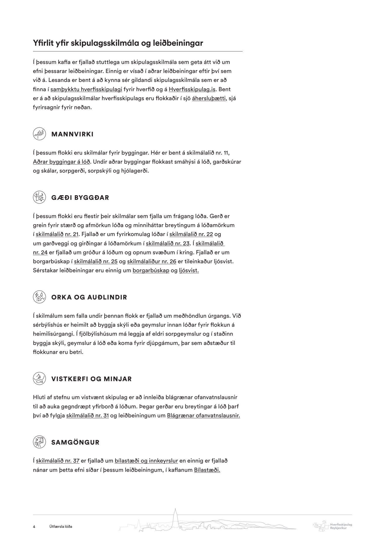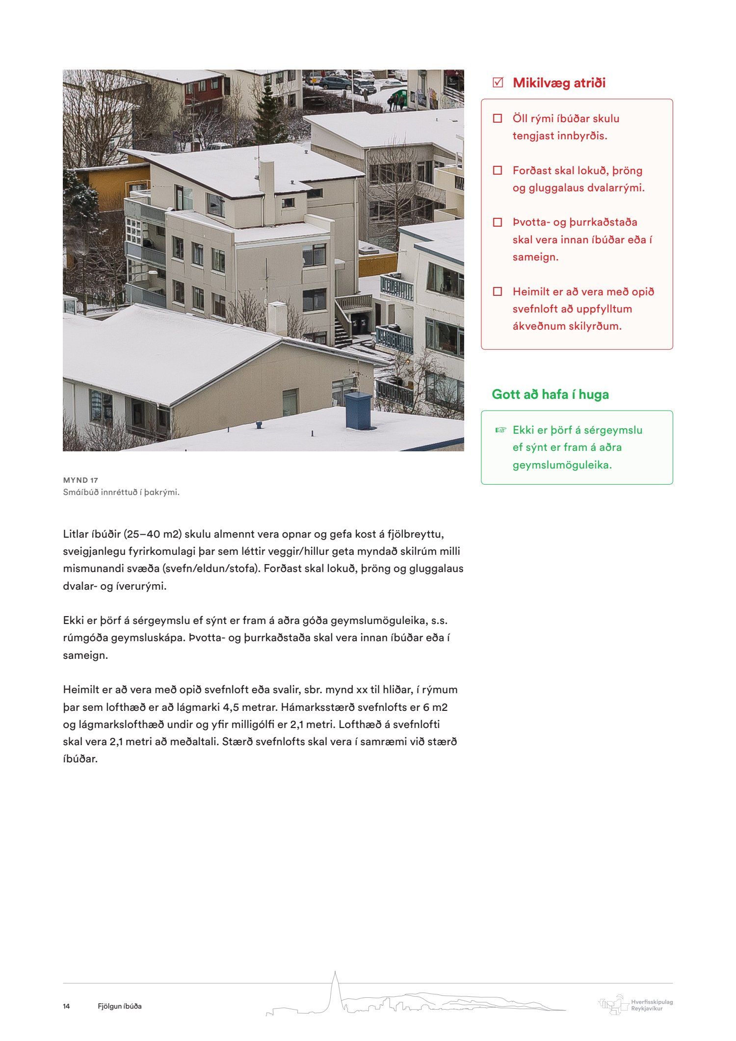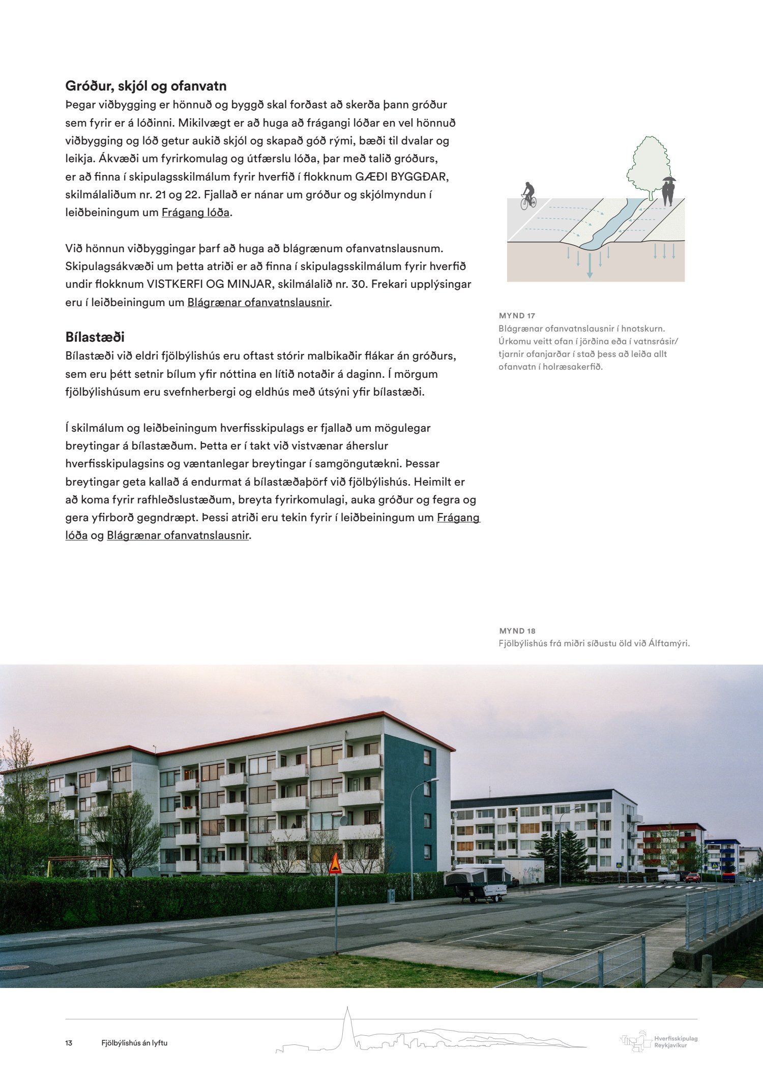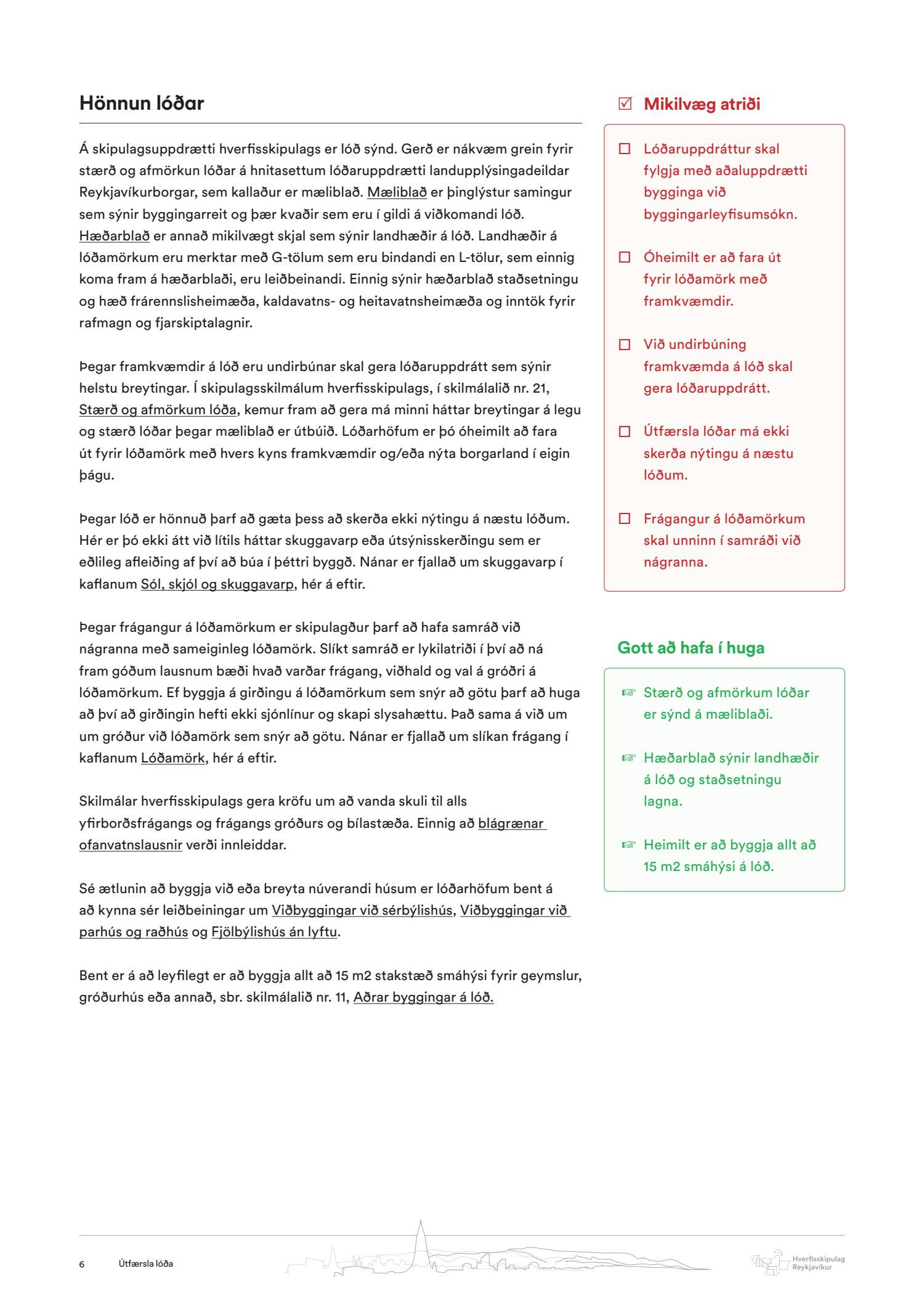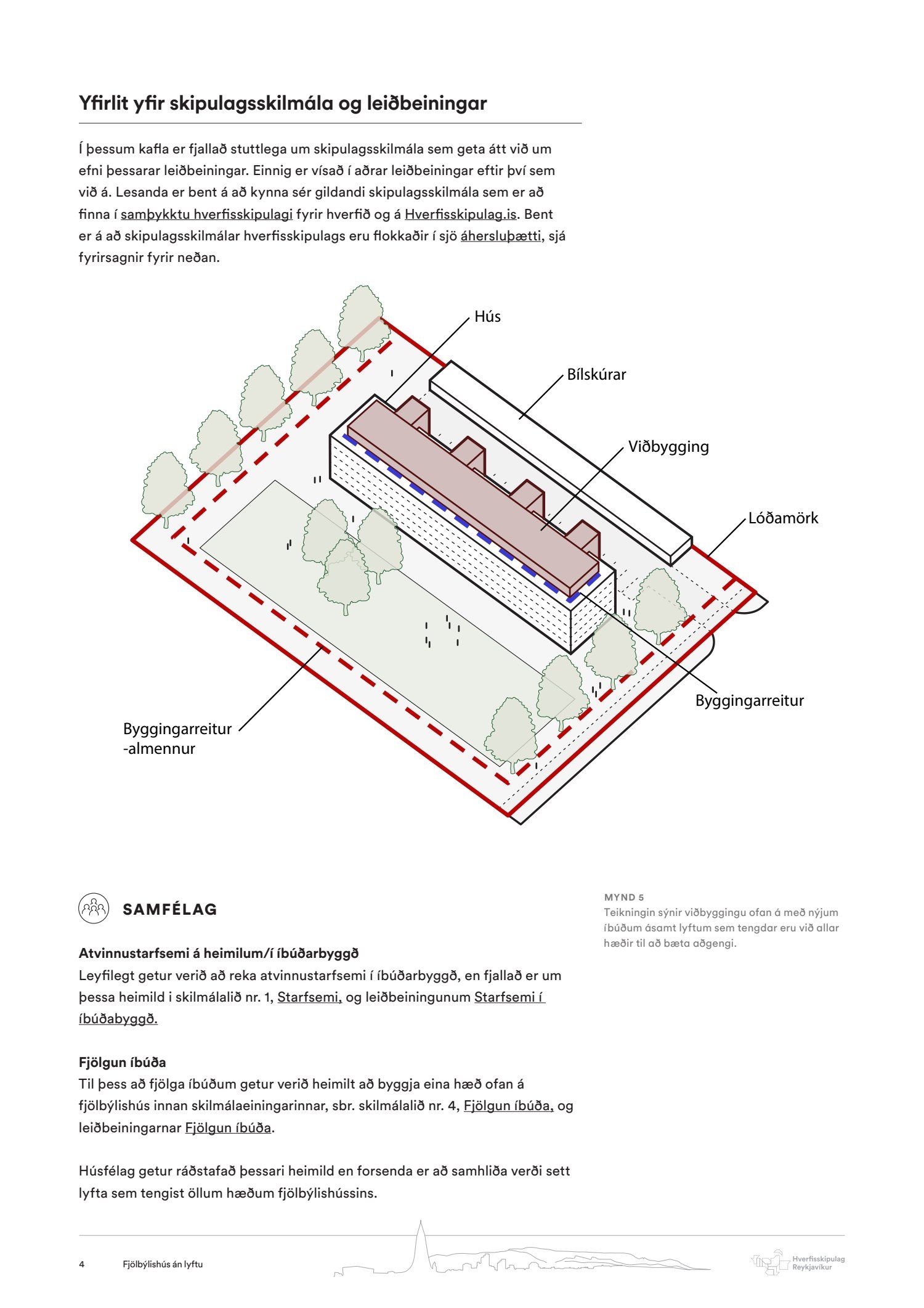 Lagðar fram leiðbeiningar um 1. Starfsemi í íbúðabyggð, 2. Fjölgun íbúða, 3. Viðbyggingar við einbýlishús, 4. Parhús og raðhús, 5. Fjölbýlishús án lyftu, 6. Borgarbúskapur, 7. Borgargötur, 8. Hverfiskjarnar, 9. Þakbreytingar, 10. svalir og útlitsbreytingar á húsum, 11. Almenningsrými, 12. Ljósvist, 13. Útfærsla lóða og 14. Blágrænar ofanvatnslausnir.