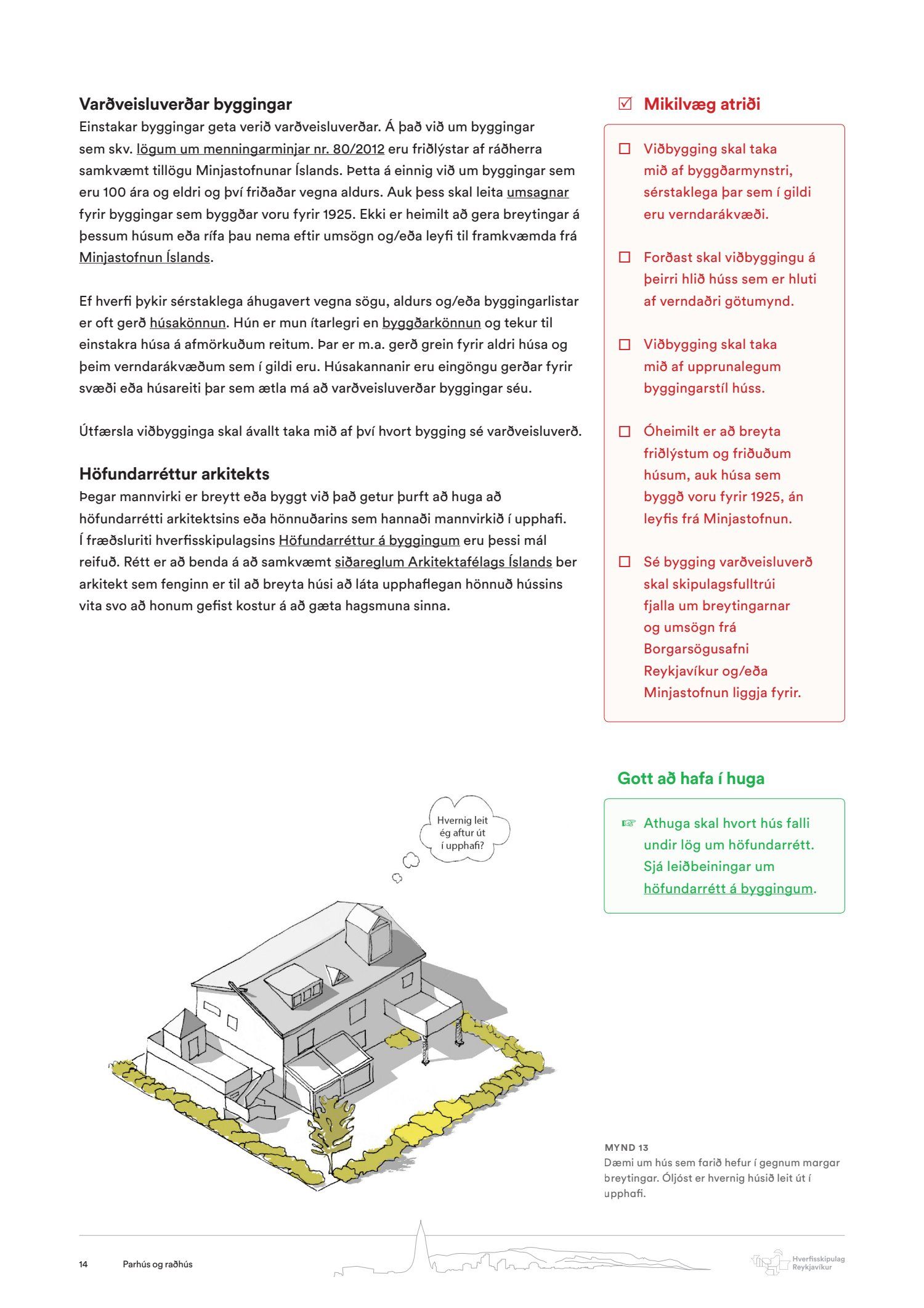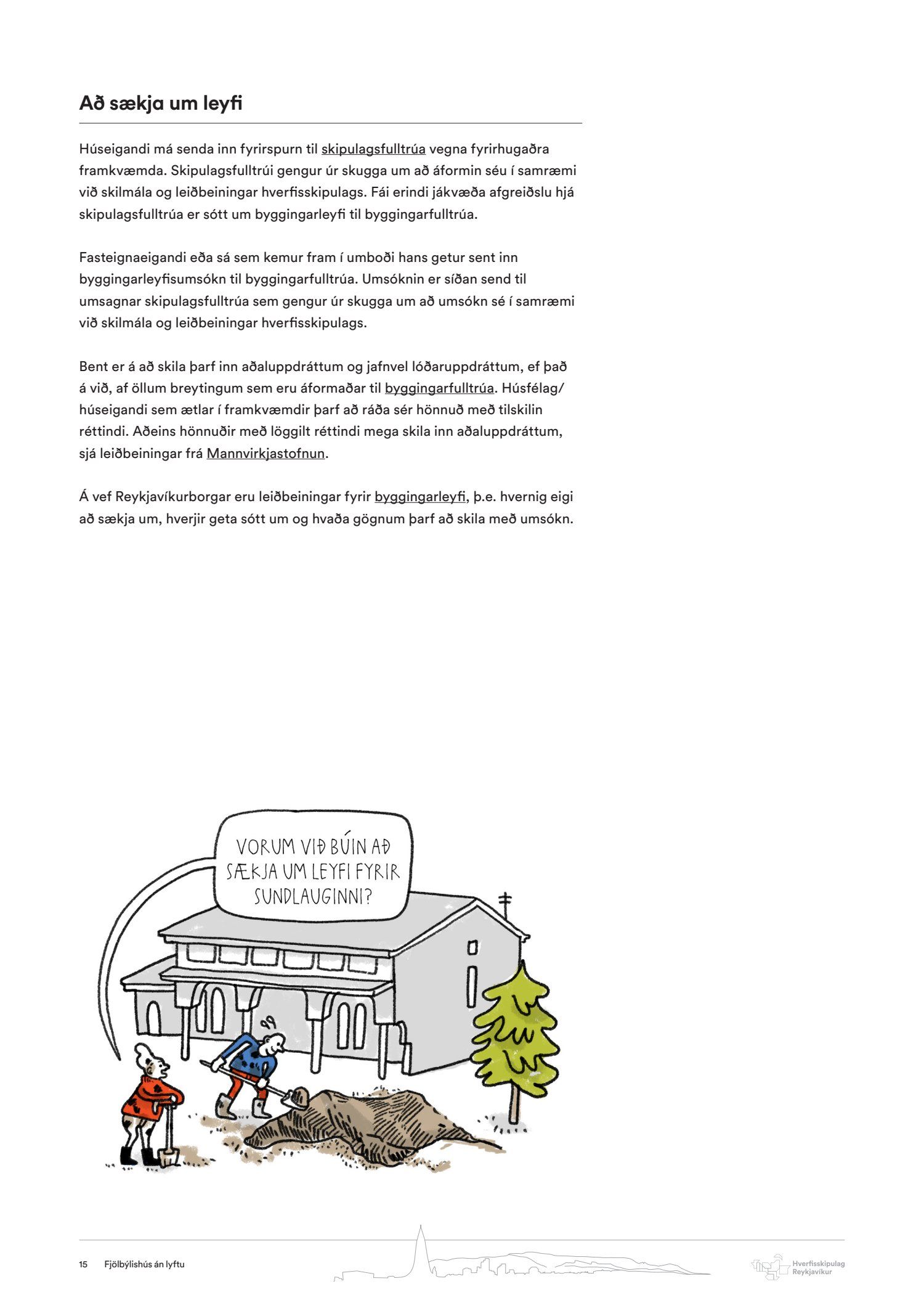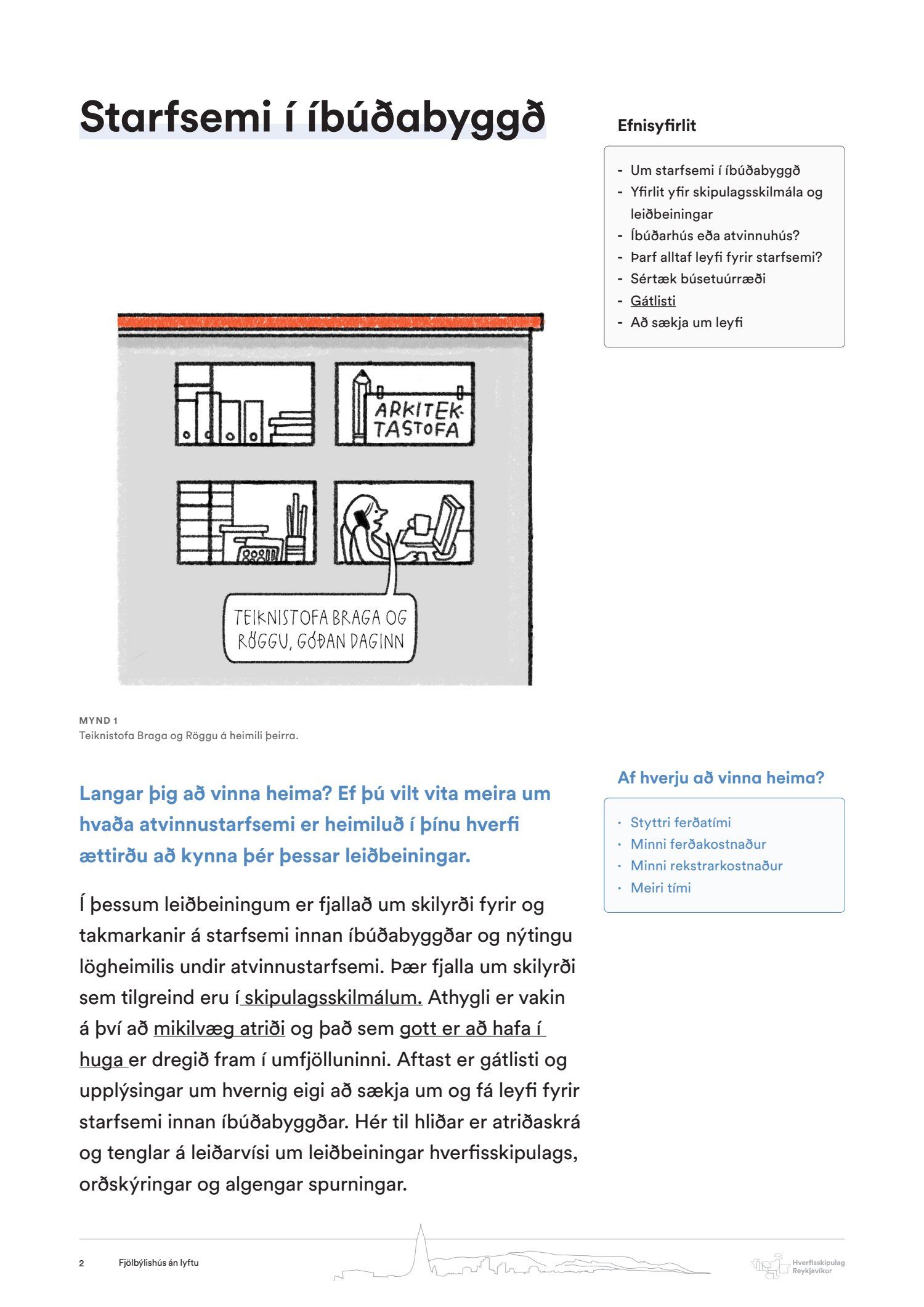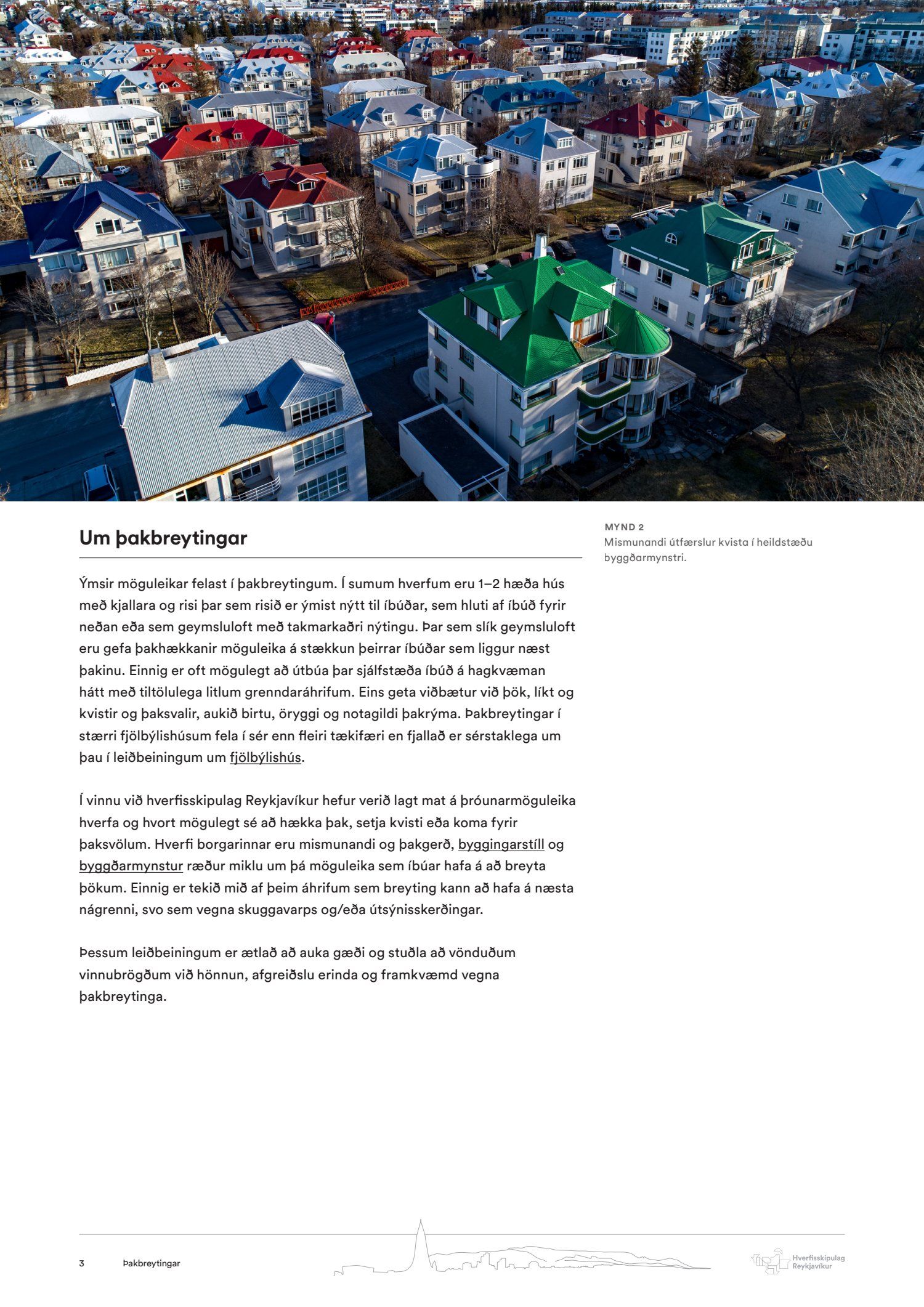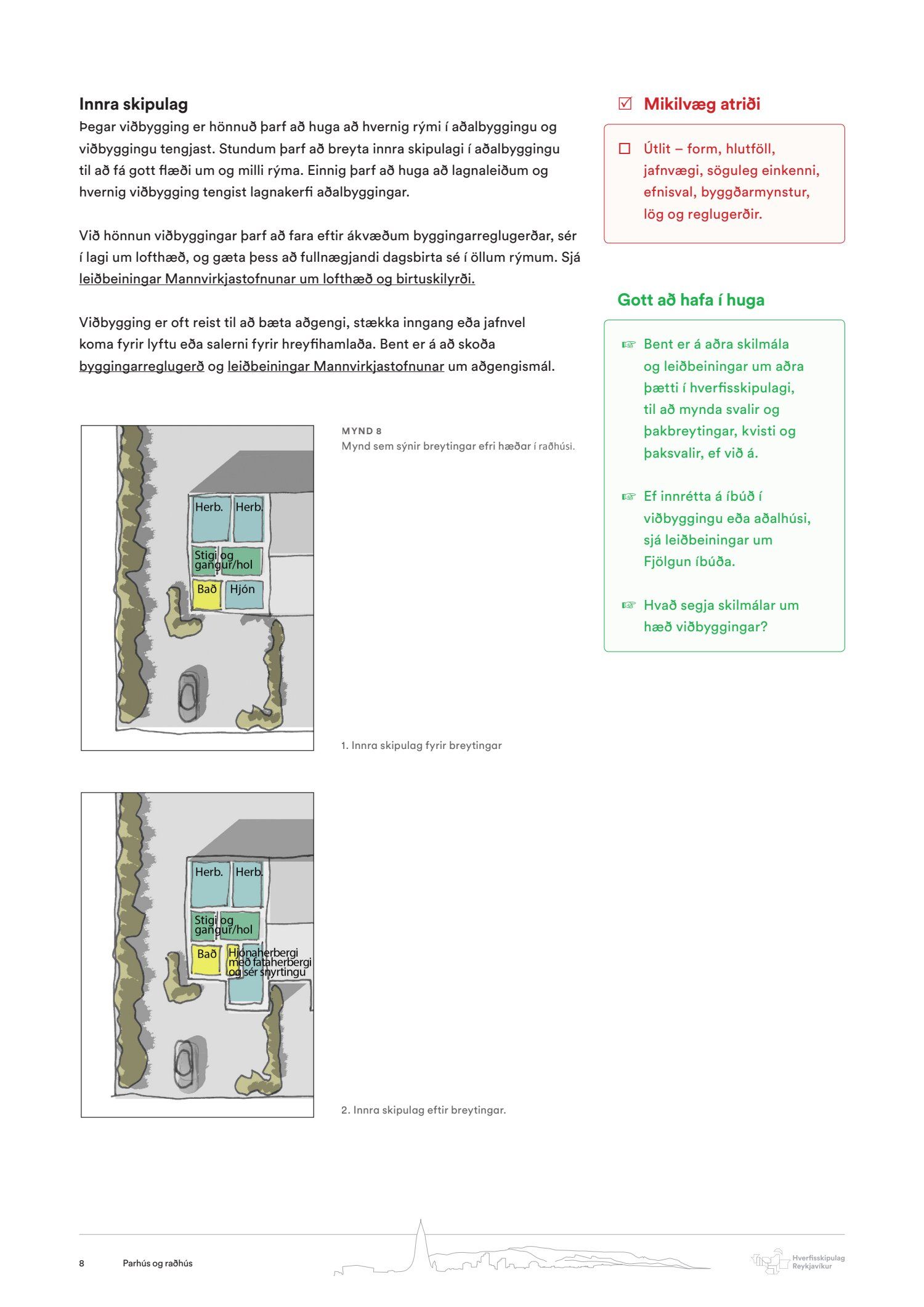 Lagðar fram leiðbeiningar um 1. Starfsemi í íbúðabyggð, 2. Fjölgun íbúða, 3. Viðbyggingar við einbýlishús, 4. Parhús og raðhús, 5. Fjölbýlishús án lyftu, 6. Borgarbúskapur, 7. Borgargötur, 8. Hverfiskjarnar, 9. Þakbreytingar, 10. svalir og útlitsbreytingar á húsum, 11. Almenningsrými, 12. Ljósvist, 13. Útfærsla lóða og 14. Blágrænar ofanvatnslausnir.
