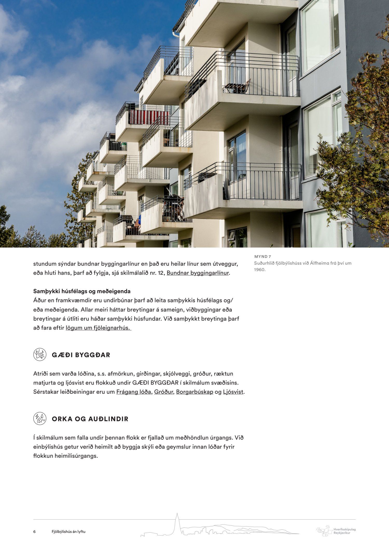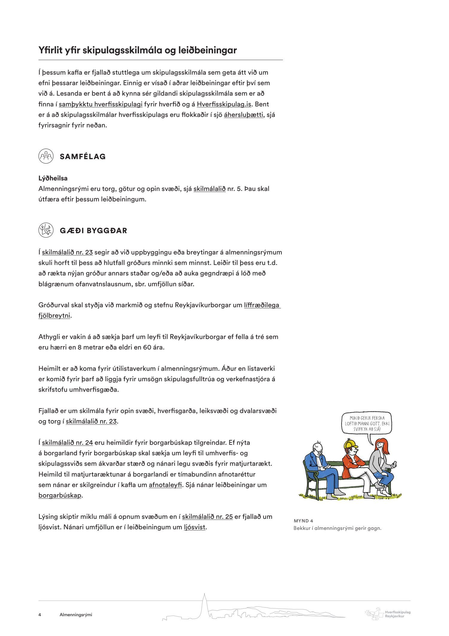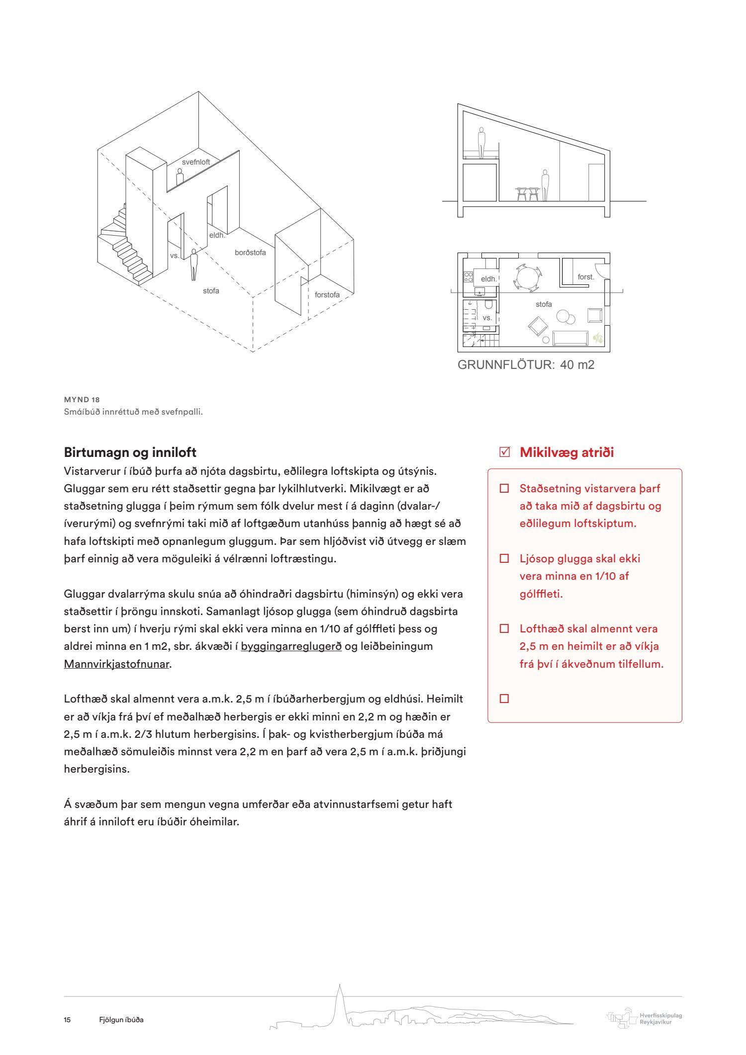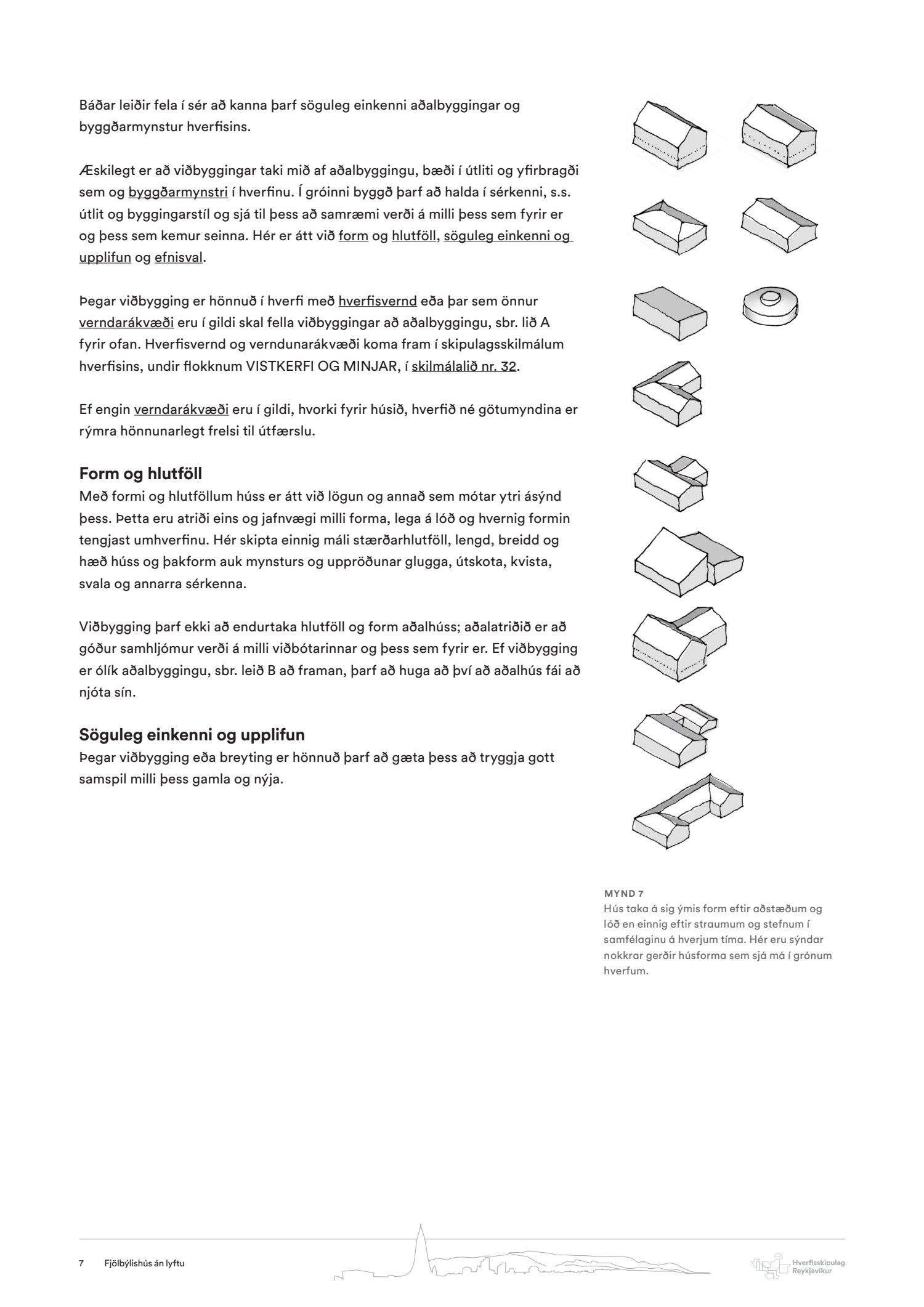 Lagðar fram leiðbeiningar um 1. Starfsemi í íbúðabyggð, 2. Fjölgun íbúða, 3. Viðbyggingar við einbýlishús, 4. Parhús og raðhús, 5. Fjölbýlishús án lyftu, 6. Borgarbúskapur, 7. Borgargötur, 8. Hverfiskjarnar, 9. Þakbreytingar, 10. svalir og útlitsbreytingar á húsum, 11. Almenningsrými, 12. Ljósvist, 13. Útfærsla lóða og 14. Blágrænar ofanvatnslausnir.