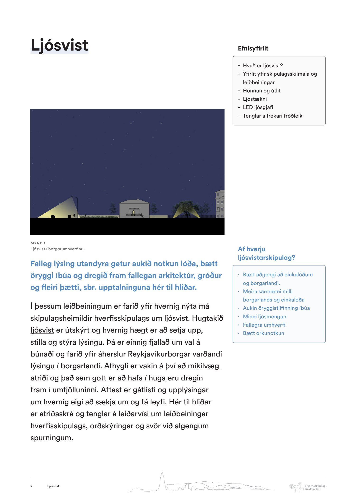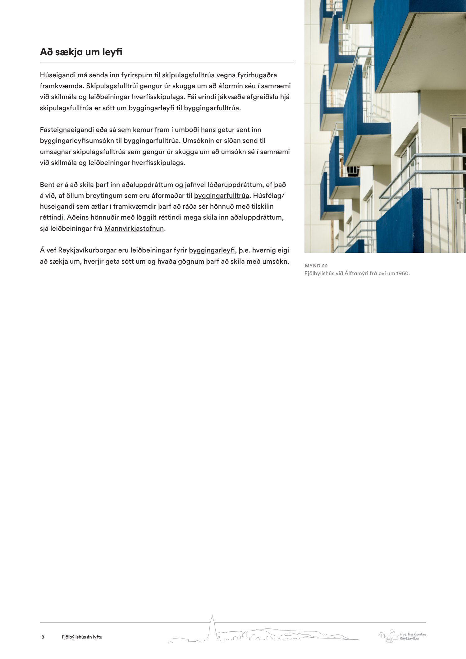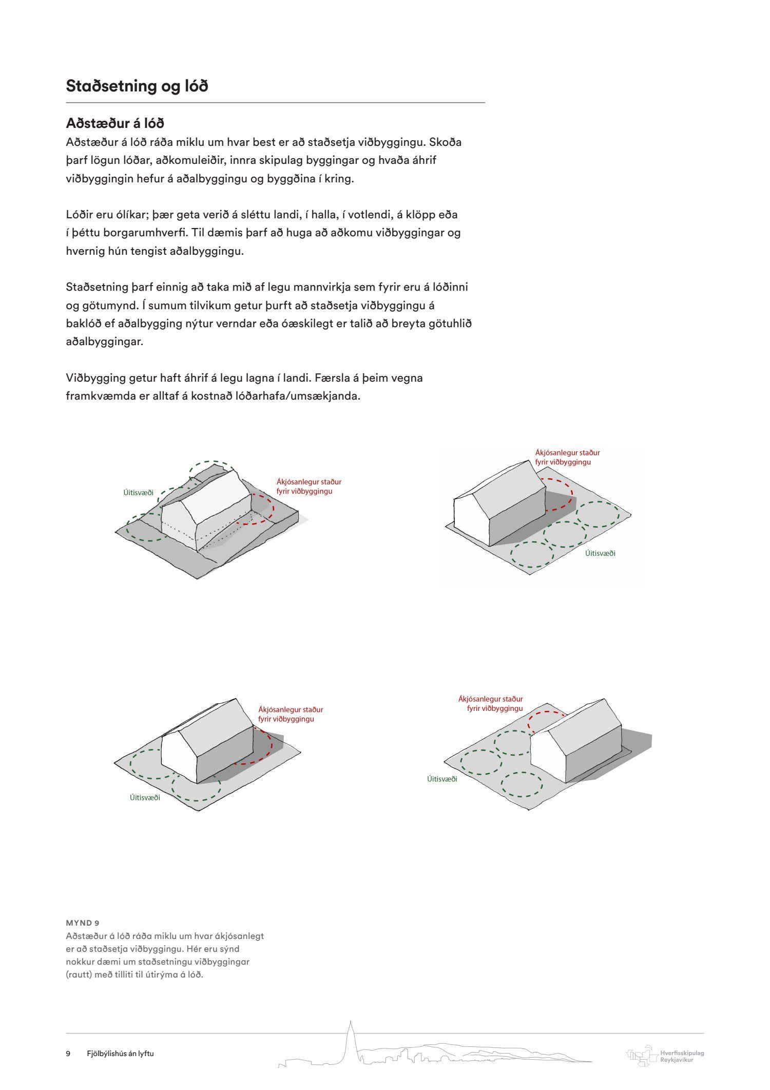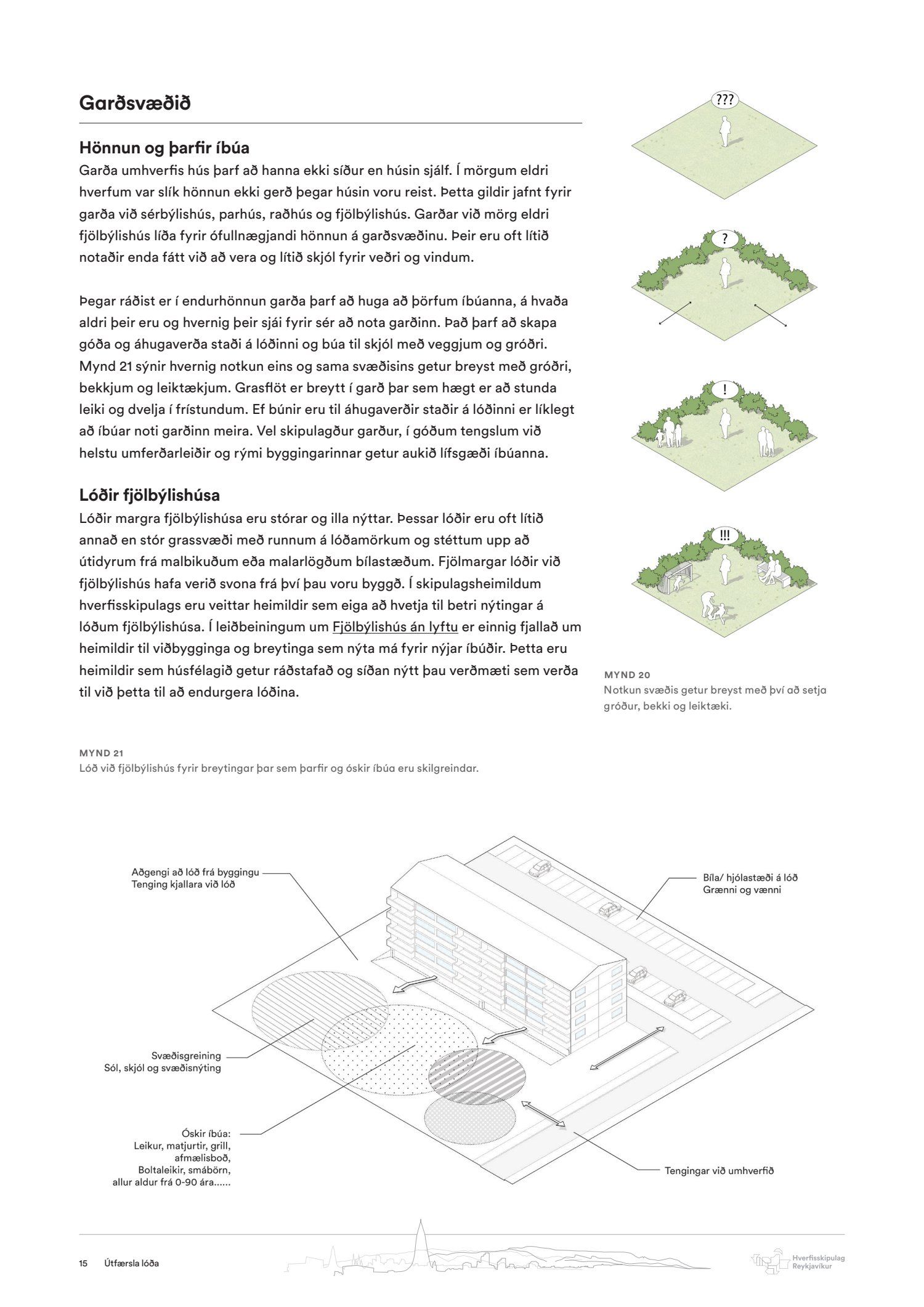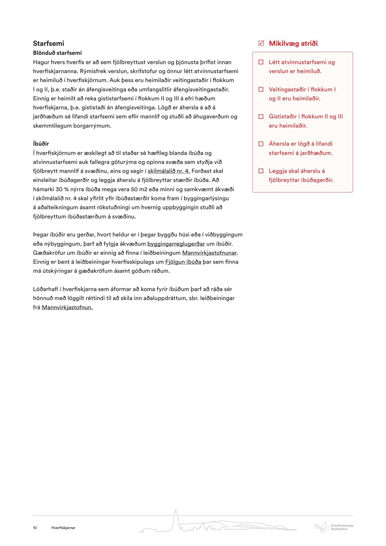 Lagðar fram leiðbeiningar um 1. Starfsemi í íbúðabyggð, 2. Fjölgun íbúða, 3. Viðbyggingar við einbýlishús, 4. Parhús og raðhús, 5. Fjölbýlishús án lyftu, 6. Borgarbúskapur, 7. Borgargötur, 8. Hverfiskjarnar, 9. Þakbreytingar, 10. svalir og útlitsbreytingar á húsum, 11. Almenningsrými, 12. Ljósvist, 13. Útfærsla lóða og 14. Blágrænar ofanvatnslausnir.