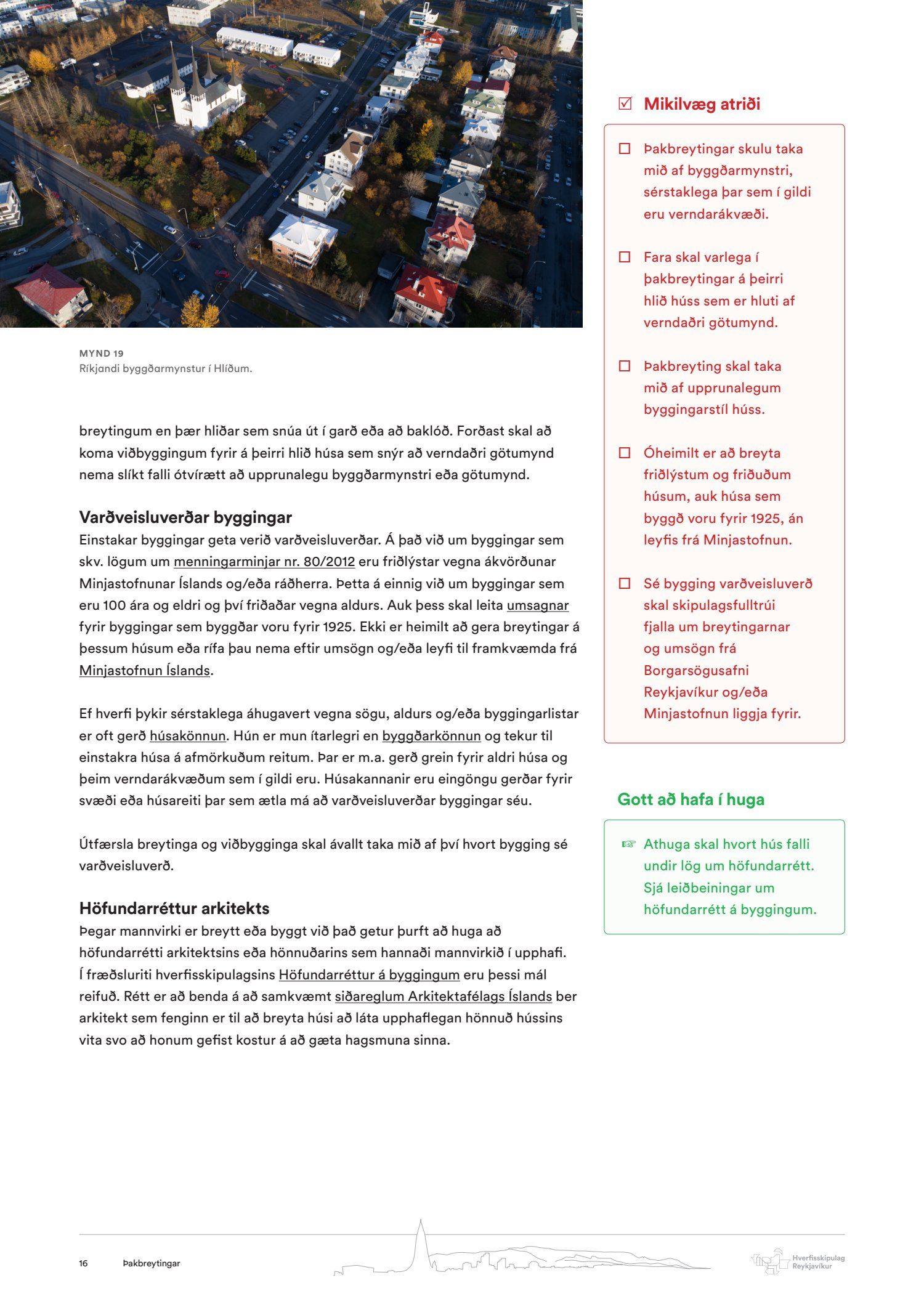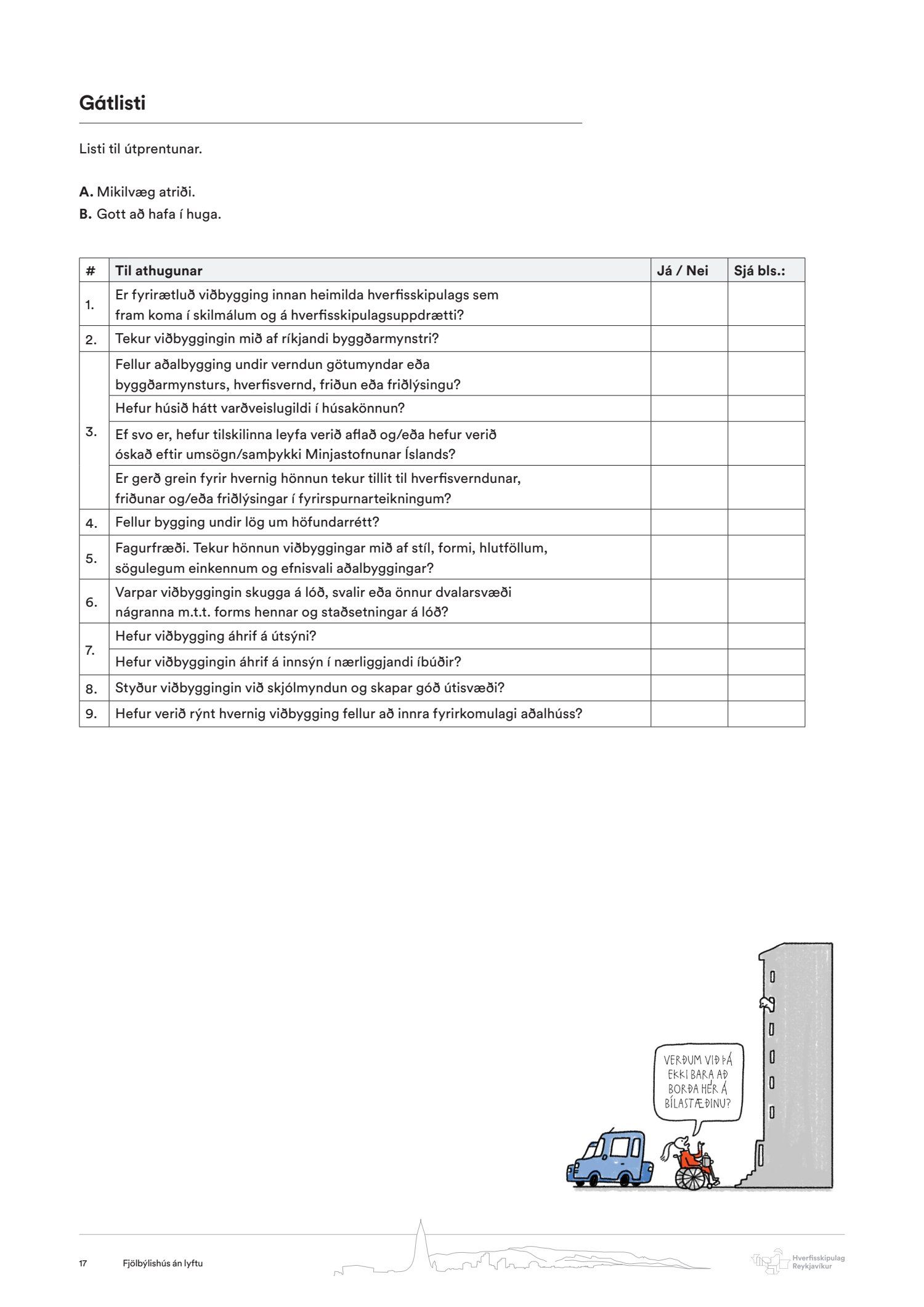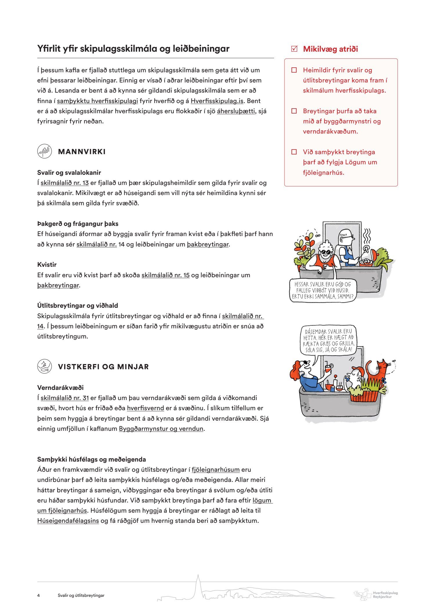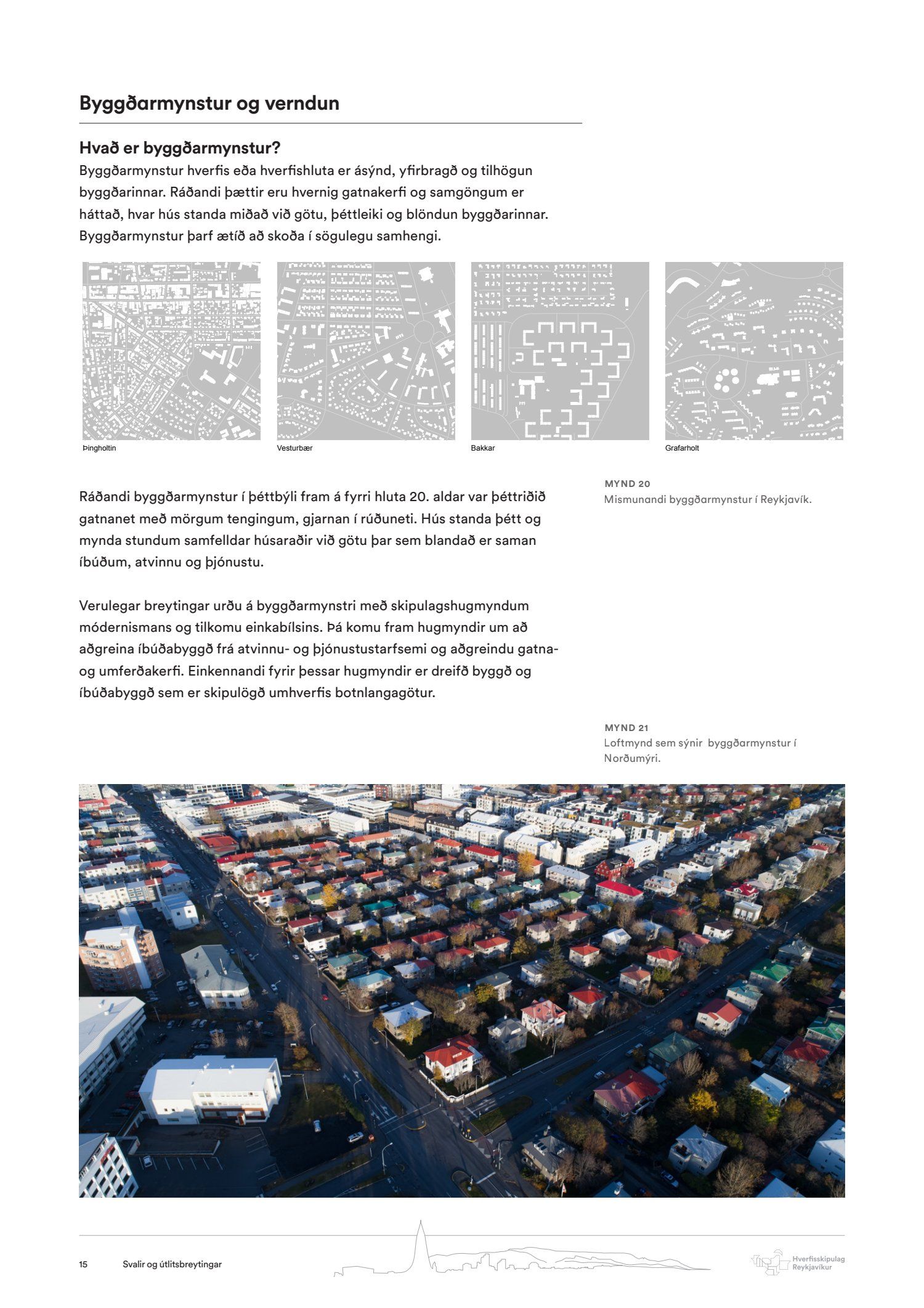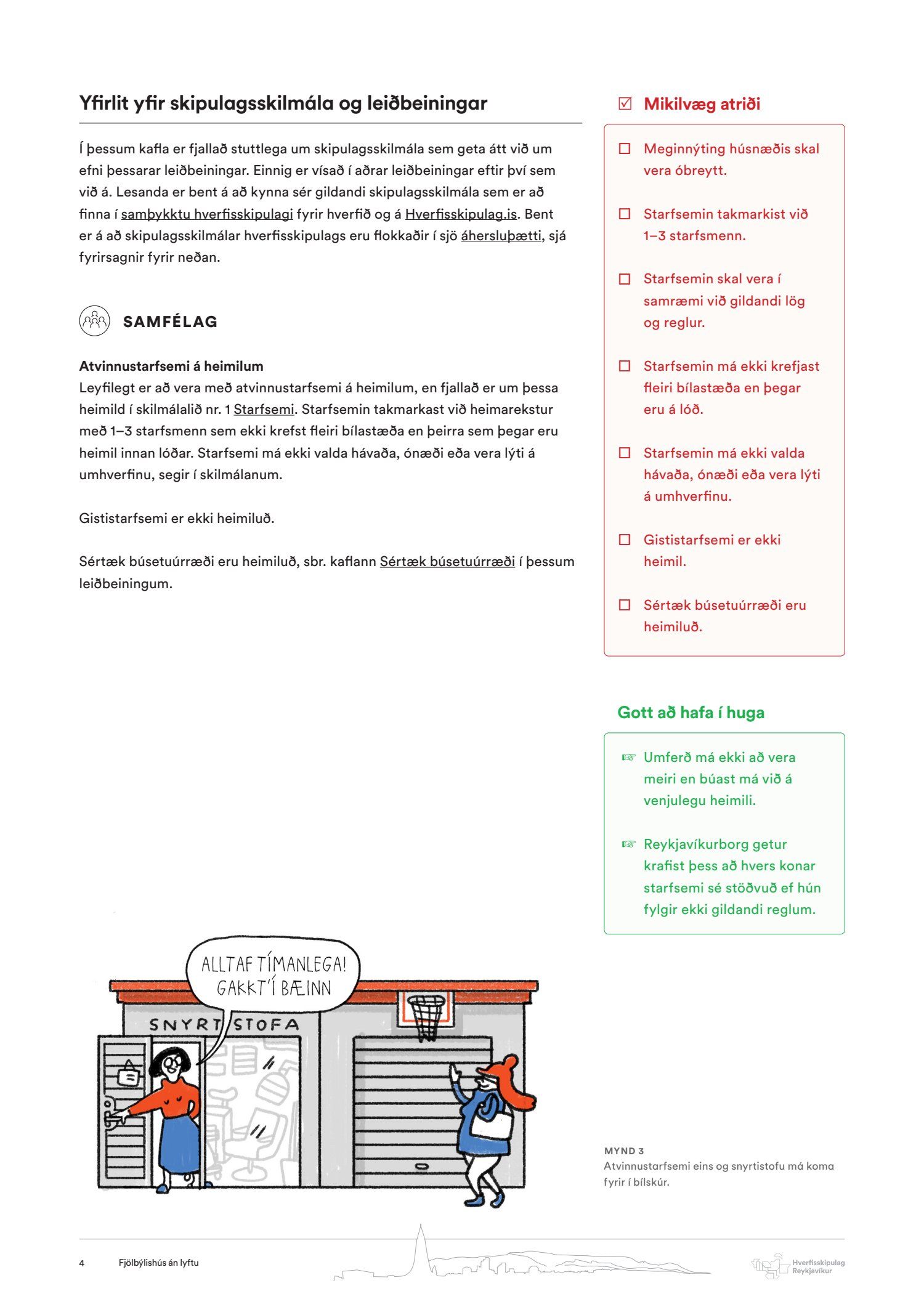Lagðar fram leiðbeiningar um 1. Starfsemi í íbúðabyggð, 2. Fjölgun íbúða, 3. Viðbyggingar við einbýlishús, 4. Parhús og raðhús, 5. Fjölbýlishús án lyftu, 6. Borgarbúskapur, 7. Borgargötur, 8. Hverfiskjarnar, 9. Þakbreytingar, 10. svalir og útlitsbreytingar á húsum, 11. Almenningsrými, 12. Ljósvist, 13. Útfærsla lóða og 14. Blágrænar ofanvatnslausnir.