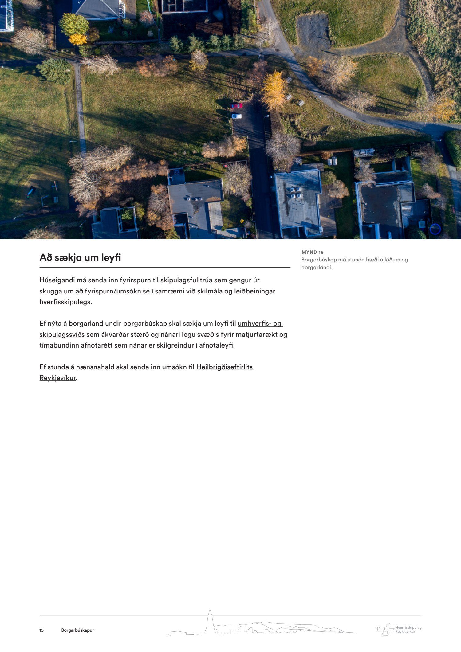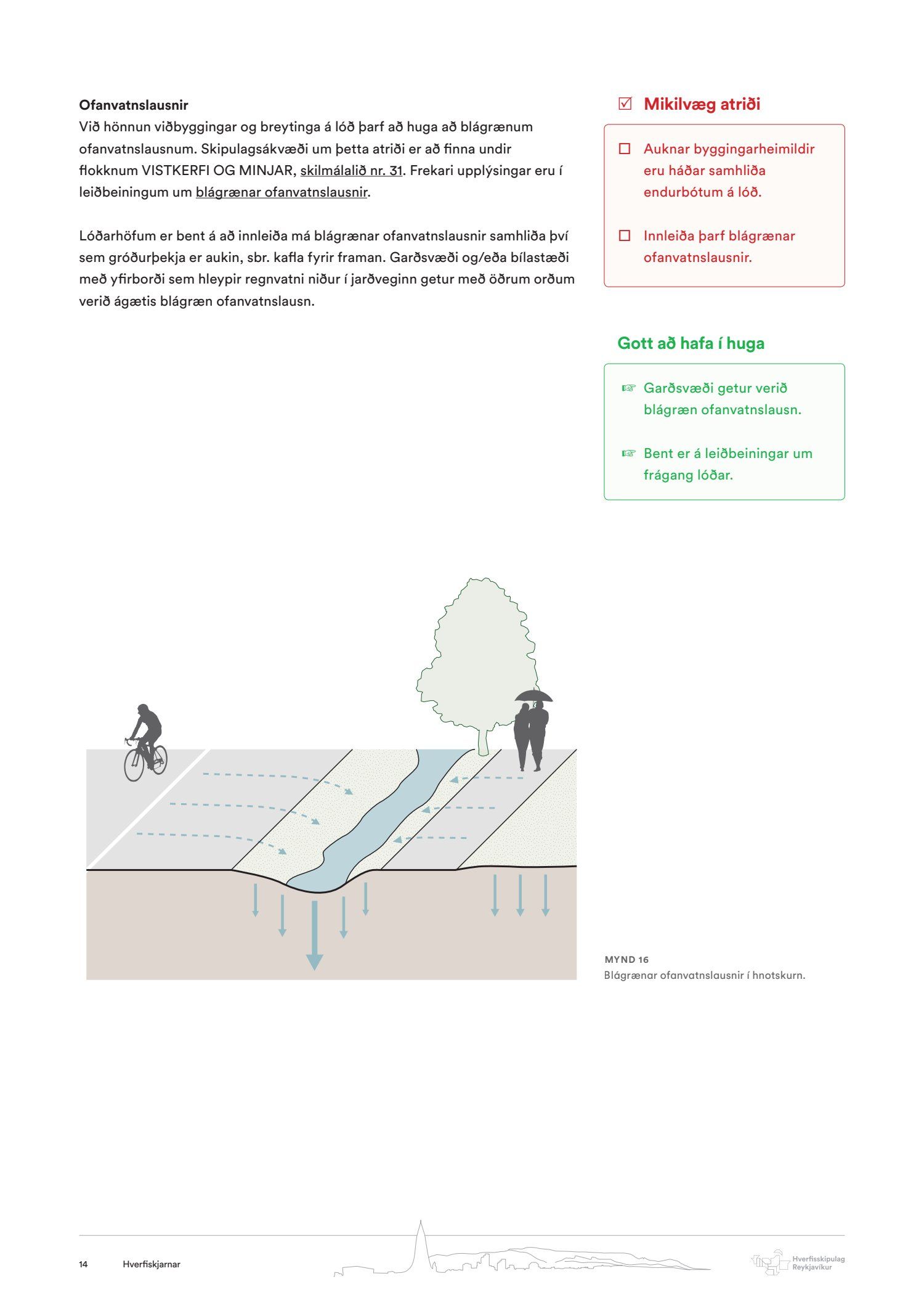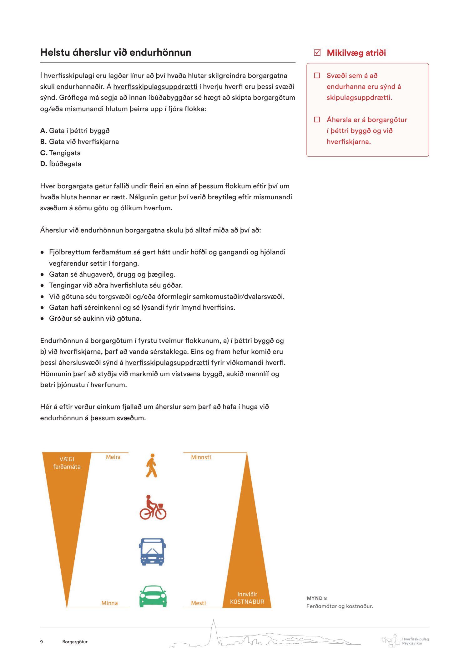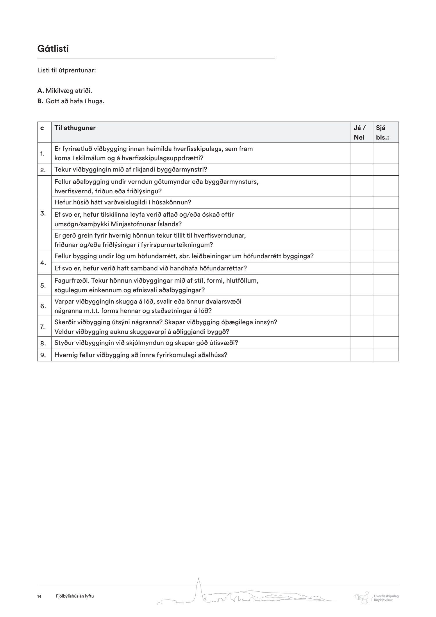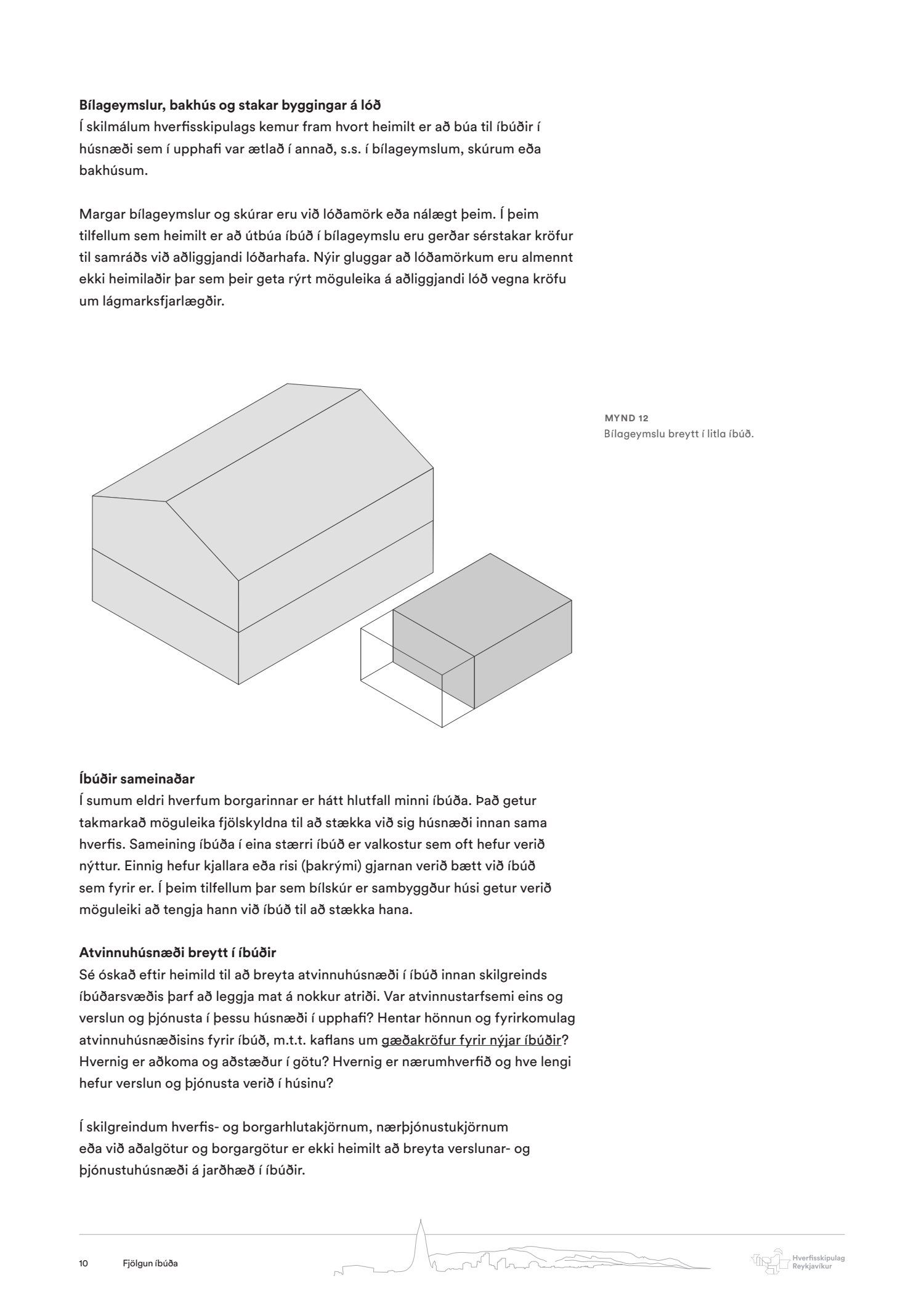 Lagðar fram leiðbeiningar um 1. Starfsemi í íbúðabyggð, 2. Fjölgun íbúða, 3. Viðbyggingar við einbýlishús, 4. Parhús og raðhús, 5. Fjölbýlishús án lyftu, 6. Borgarbúskapur, 7. Borgargötur, 8. Hverfiskjarnar, 9. Þakbreytingar, 10. svalir og útlitsbreytingar á húsum, 11. Almenningsrými, 12. Ljósvist, 13. Útfærsla lóða og 14. Blágrænar ofanvatnslausnir.