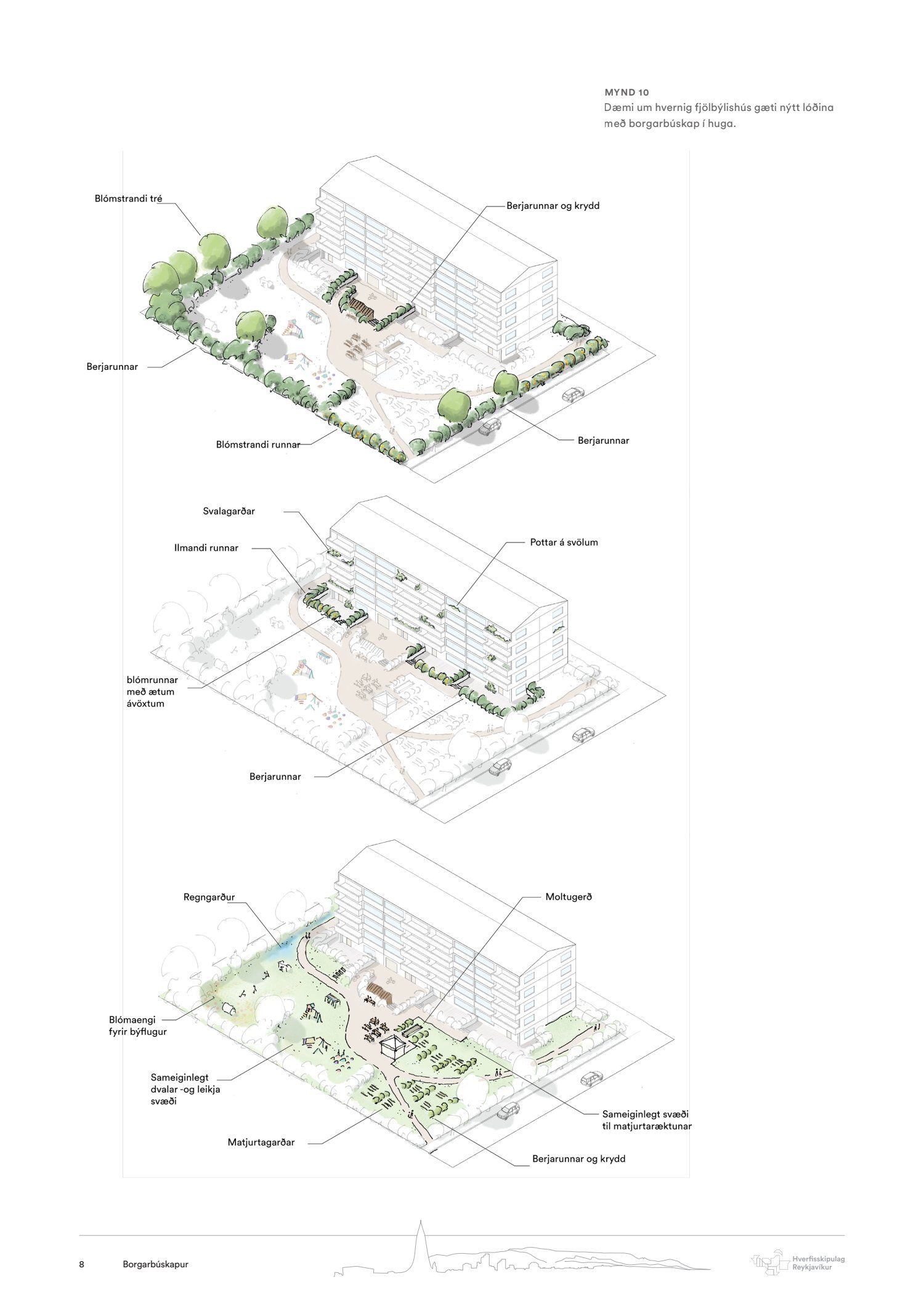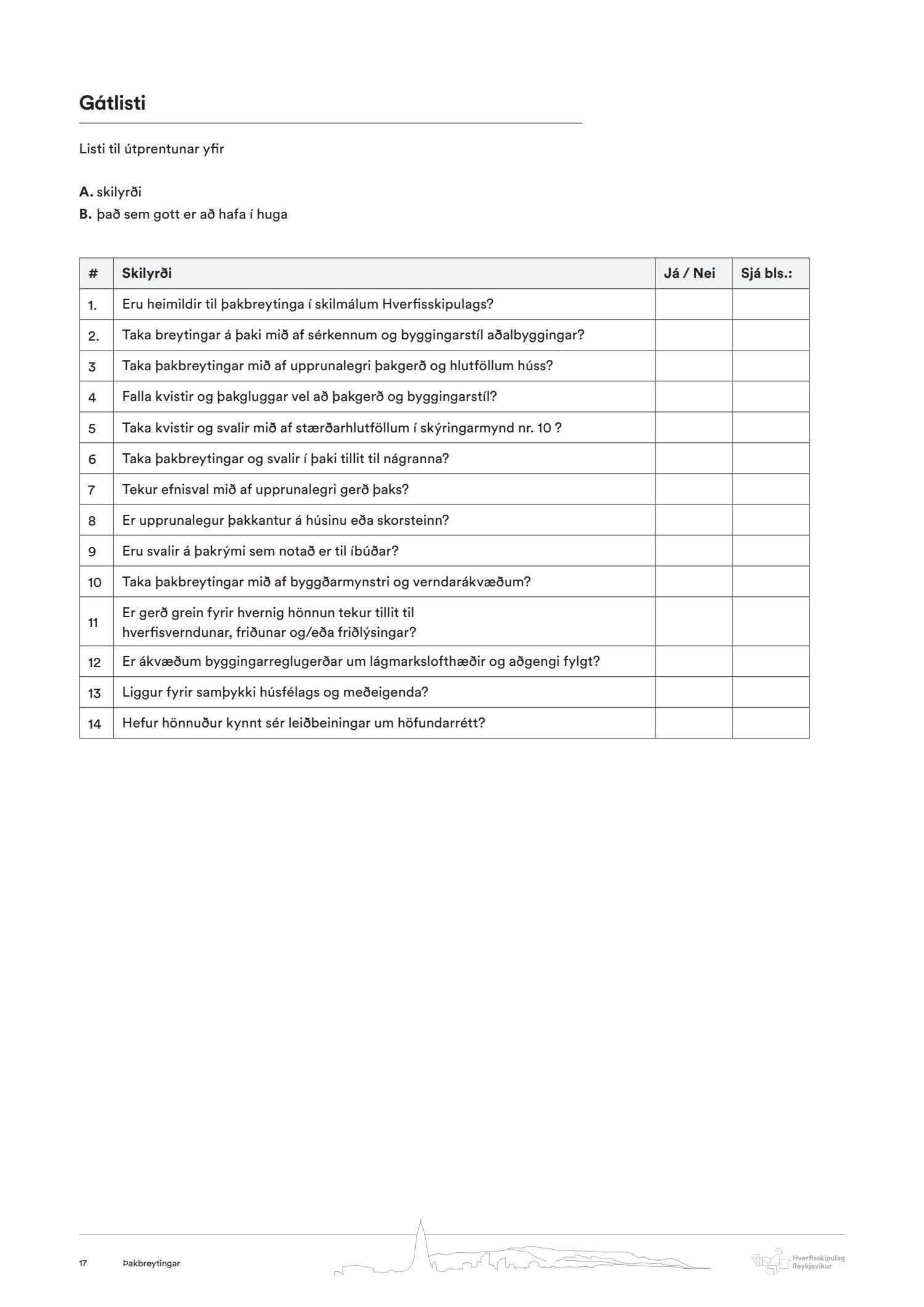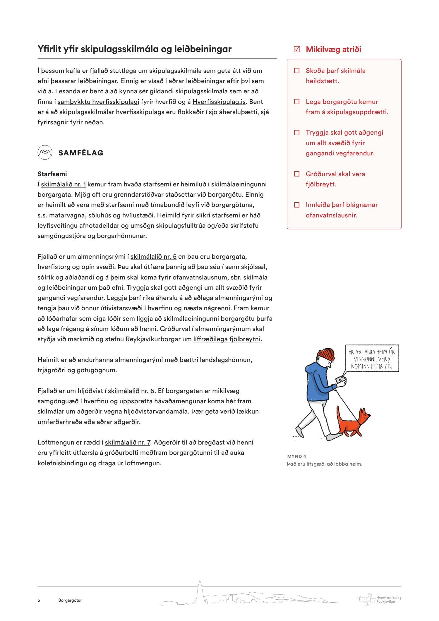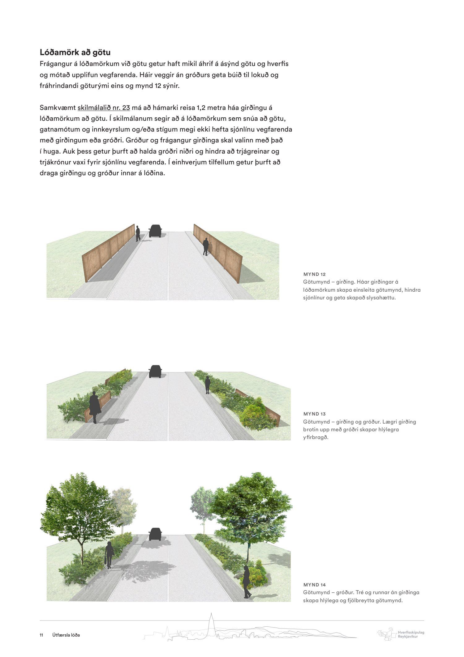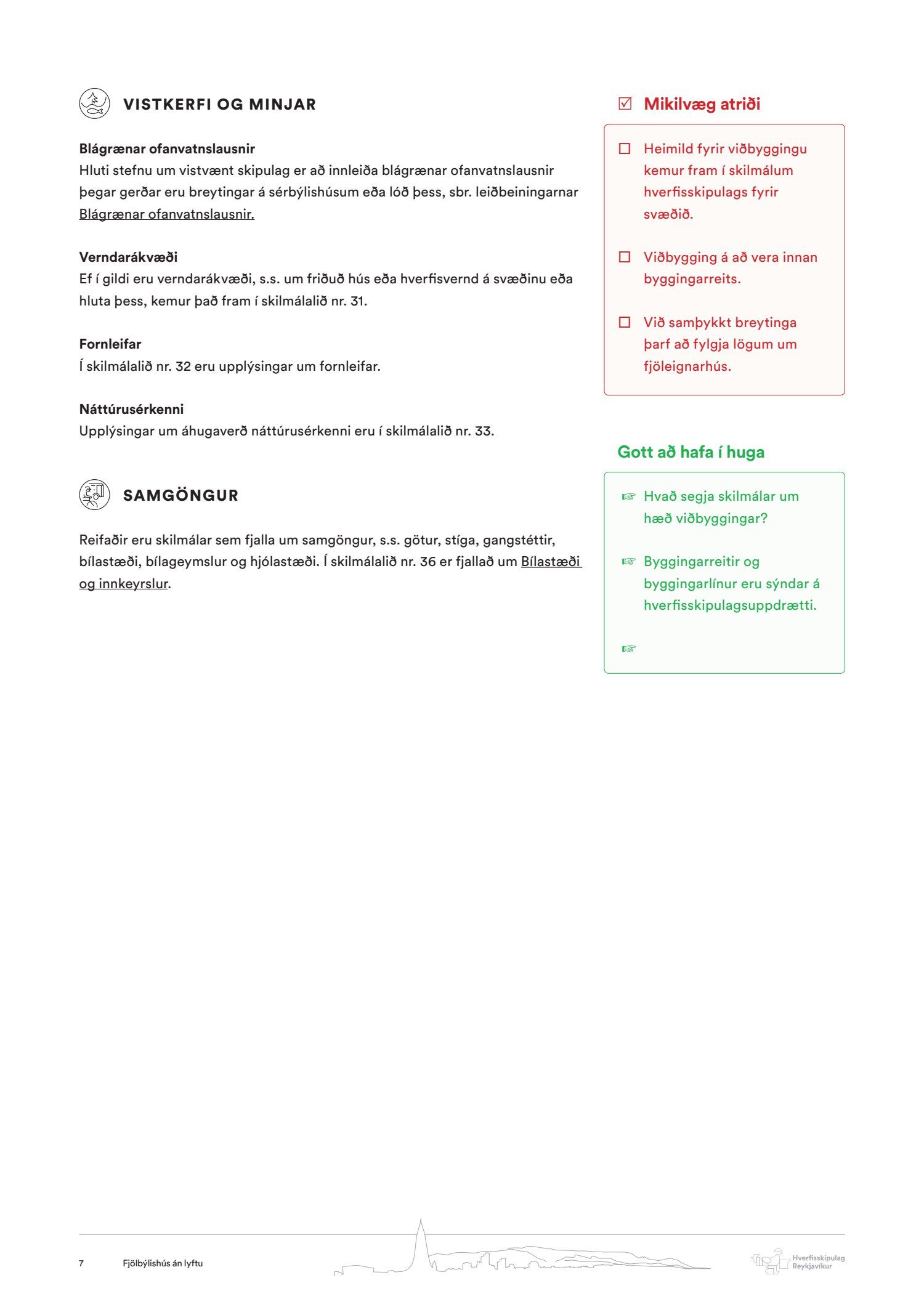 Lagðar fram leiðbeiningar um 1. Starfsemi í íbúðabyggð, 2. Fjölgun íbúða, 3. Viðbyggingar við einbýlishús, 4. Parhús og raðhús, 5. Fjölbýlishús án lyftu, 6. Borgarbúskapur, 7. Borgargötur, 8. Hverfiskjarnar, 9. Þakbreytingar, 10. svalir og útlitsbreytingar á húsum, 11. Almenningsrými, 12. Ljósvist, 13. Útfærsla lóða og 14. Blágrænar ofanvatnslausnir.