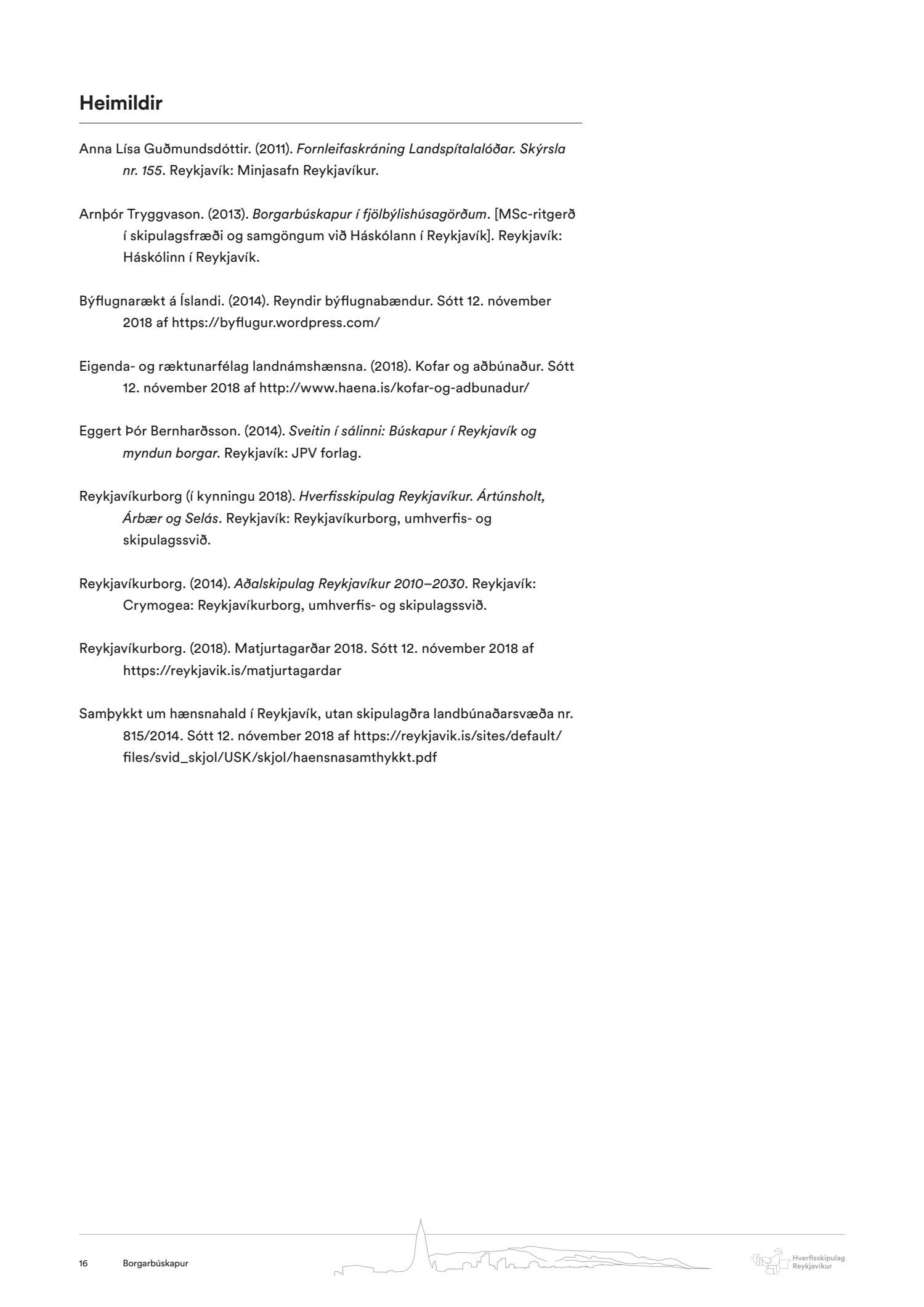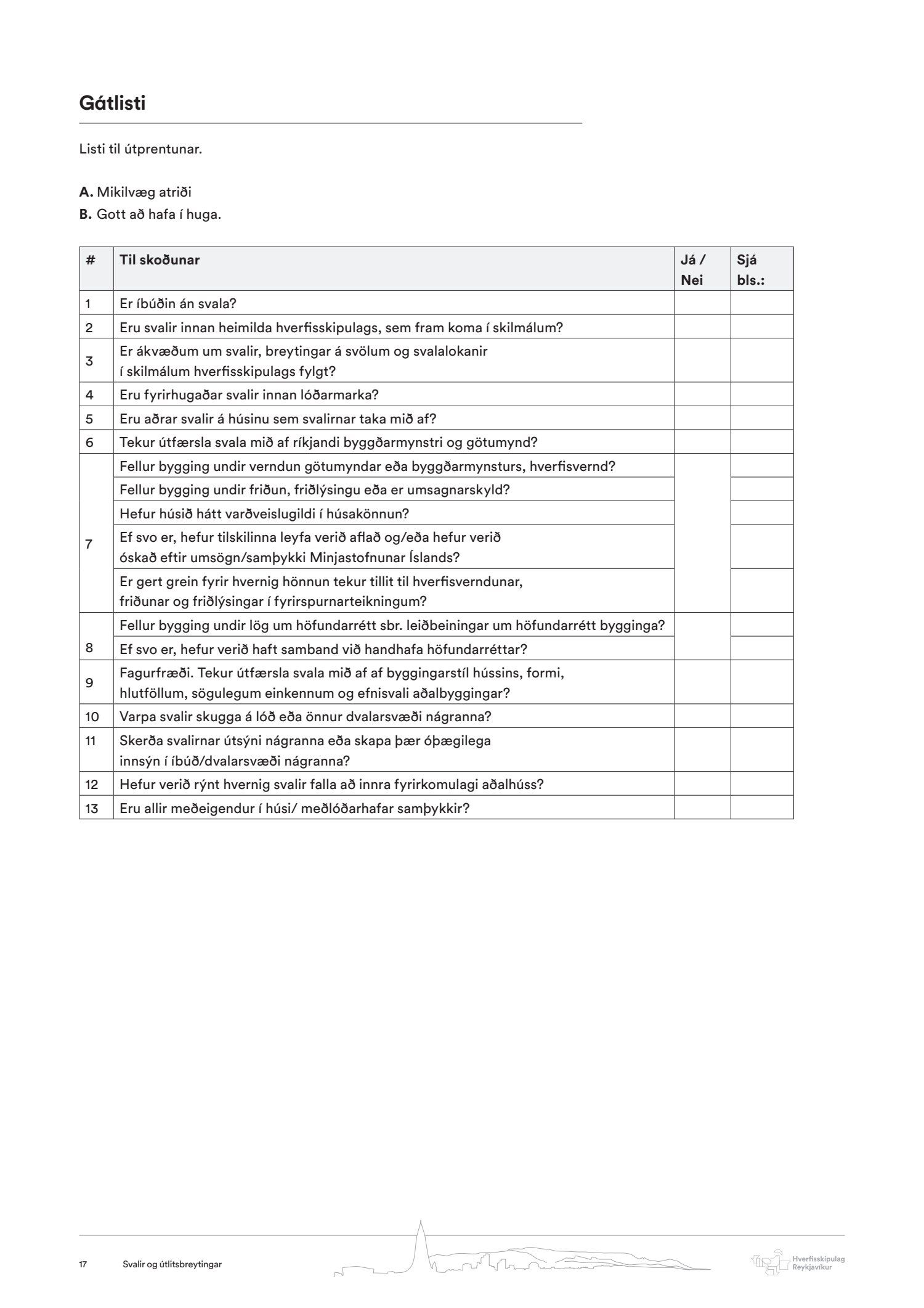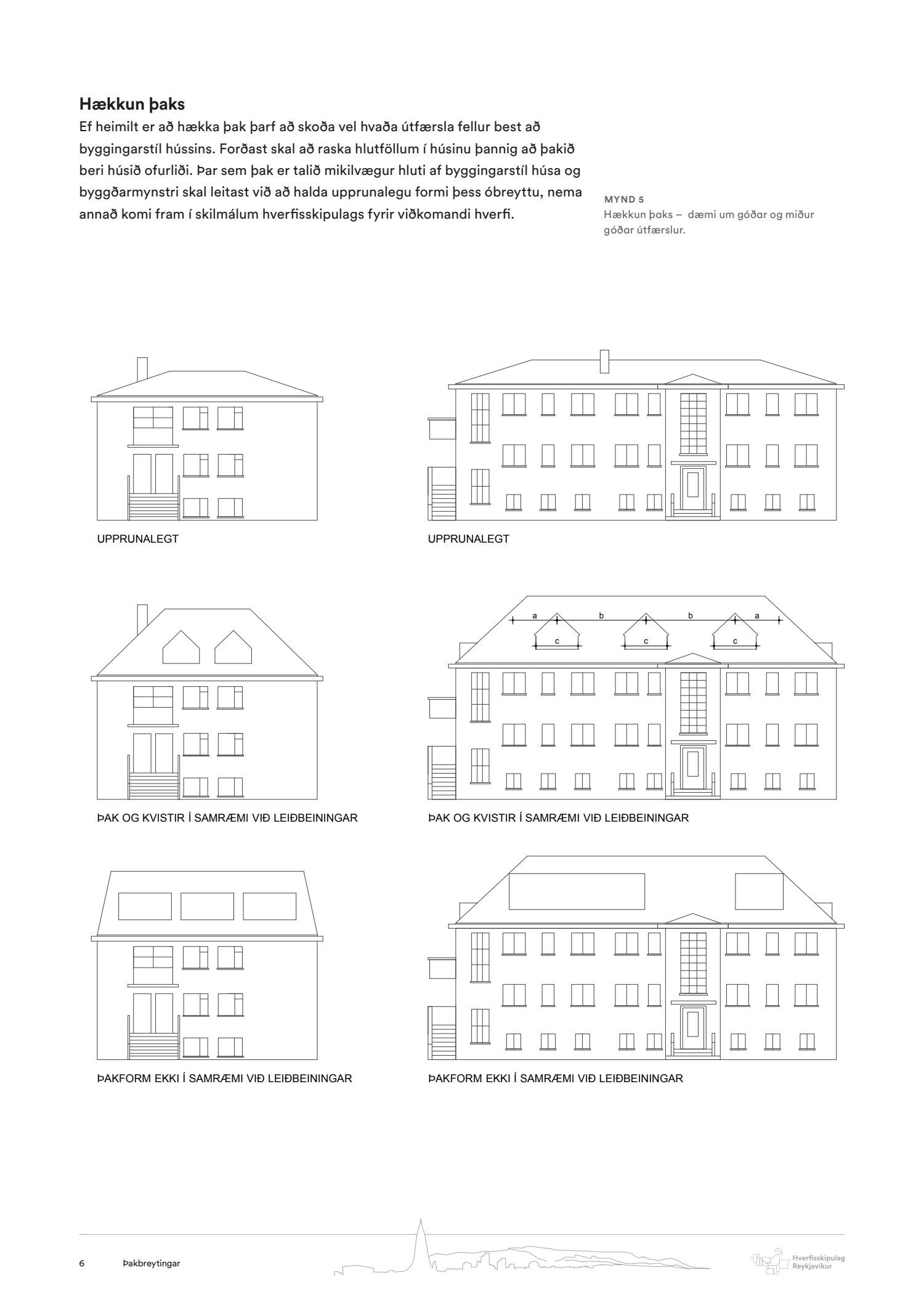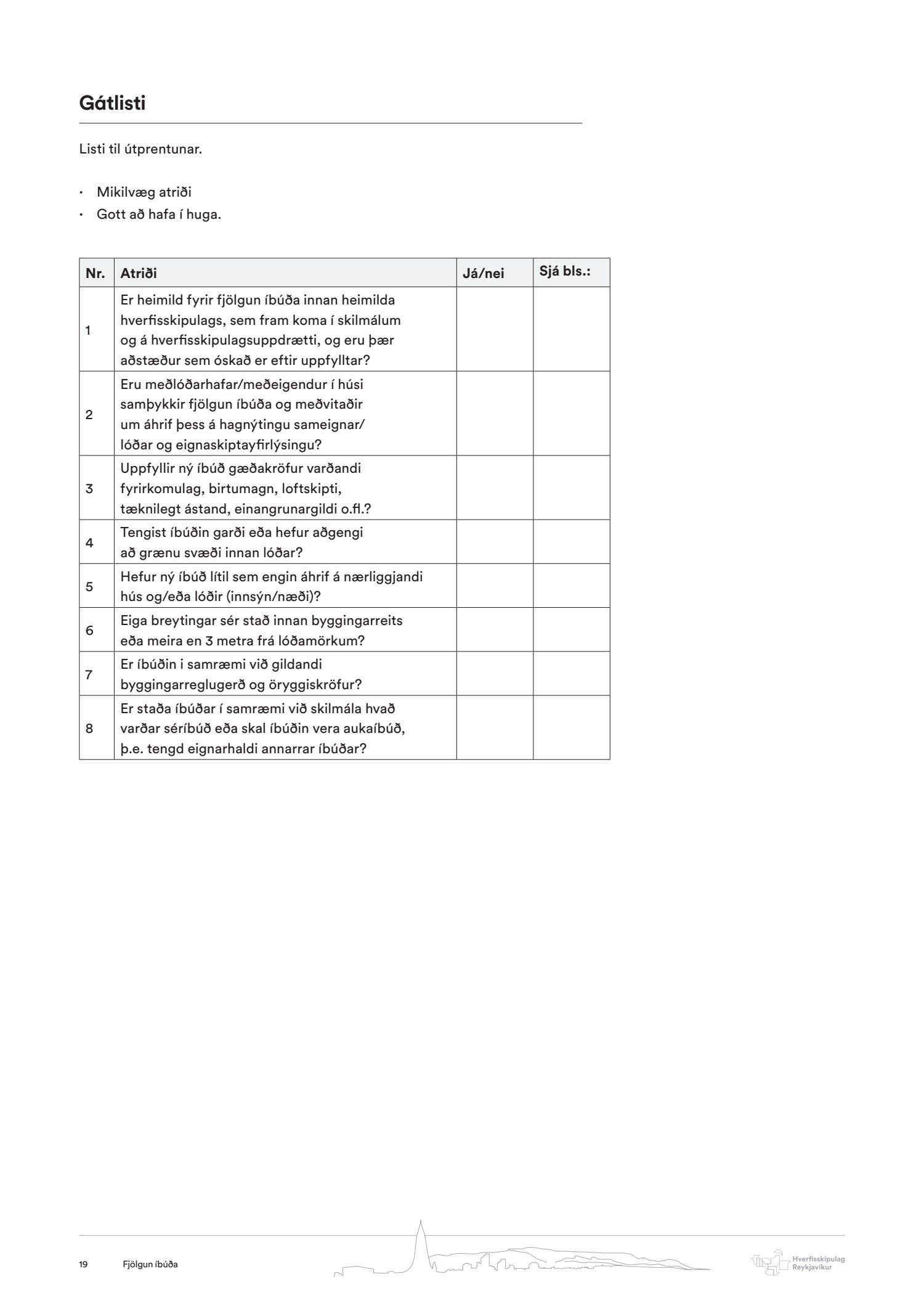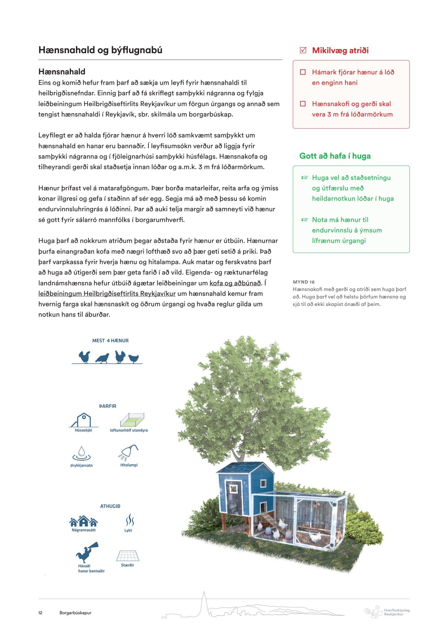Lagðar fram leiðbeiningar um 1. Starfsemi í íbúðabyggð, 2. Fjölgun íbúða, 3. Viðbyggingar við einbýlishús, 4. Parhús og raðhús, 5. Fjölbýlishús án lyftu, 6. Borgarbúskapur, 7. Borgargötur, 8. Hverfiskjarnar, 9. Þakbreytingar, 10. svalir og útlitsbreytingar á húsum, 11. Almenningsrými, 12. Ljósvist, 13. Útfærsla lóða og 14. Blágrænar ofanvatnslausnir.