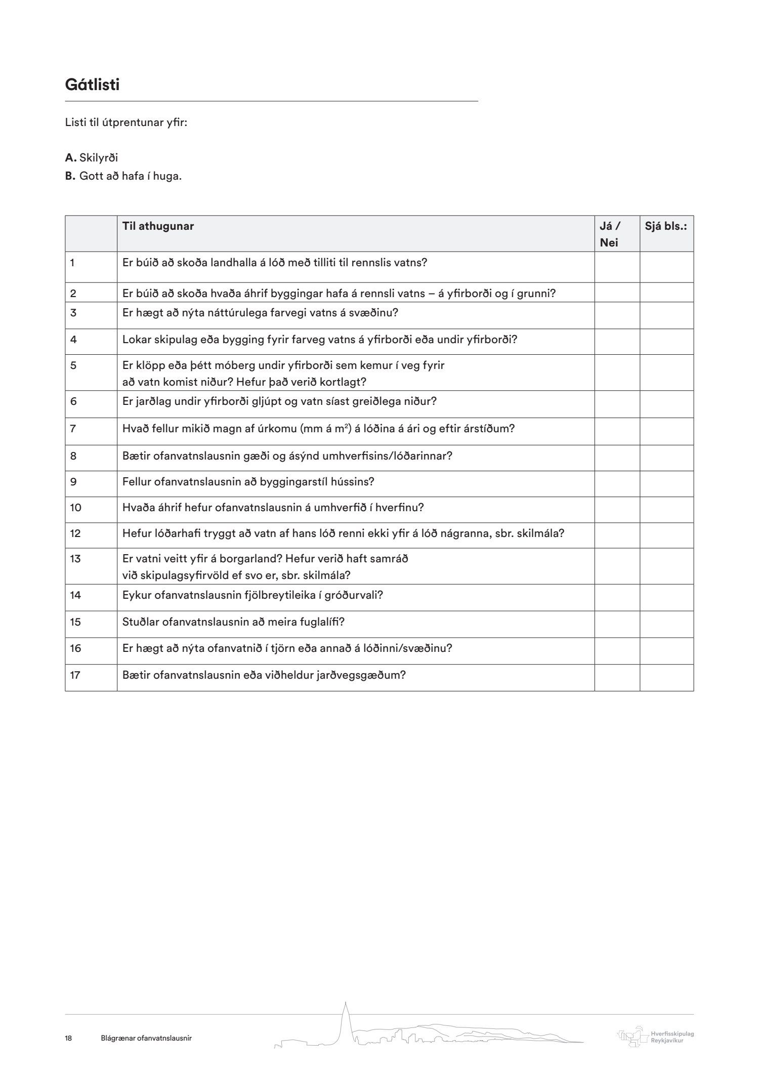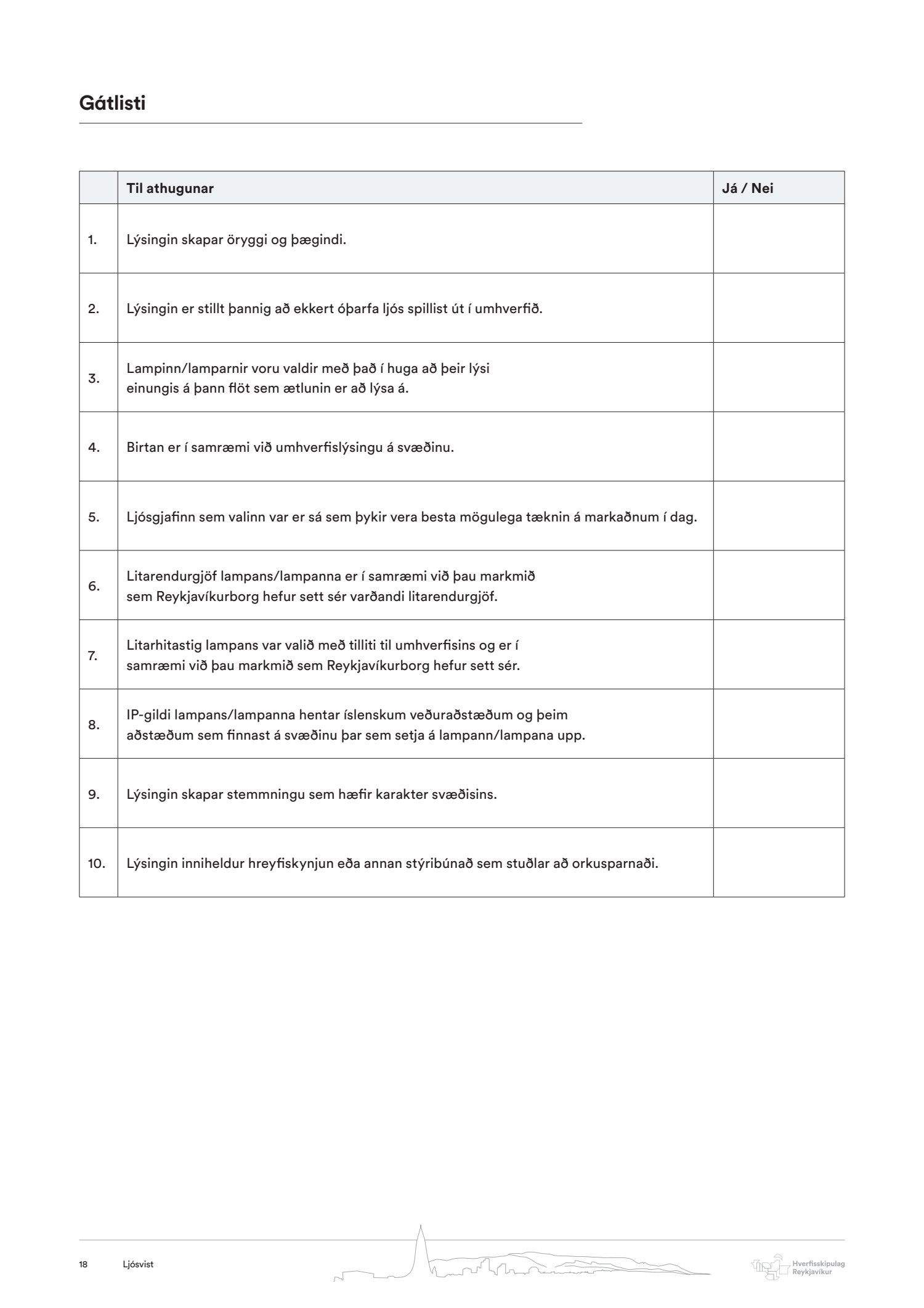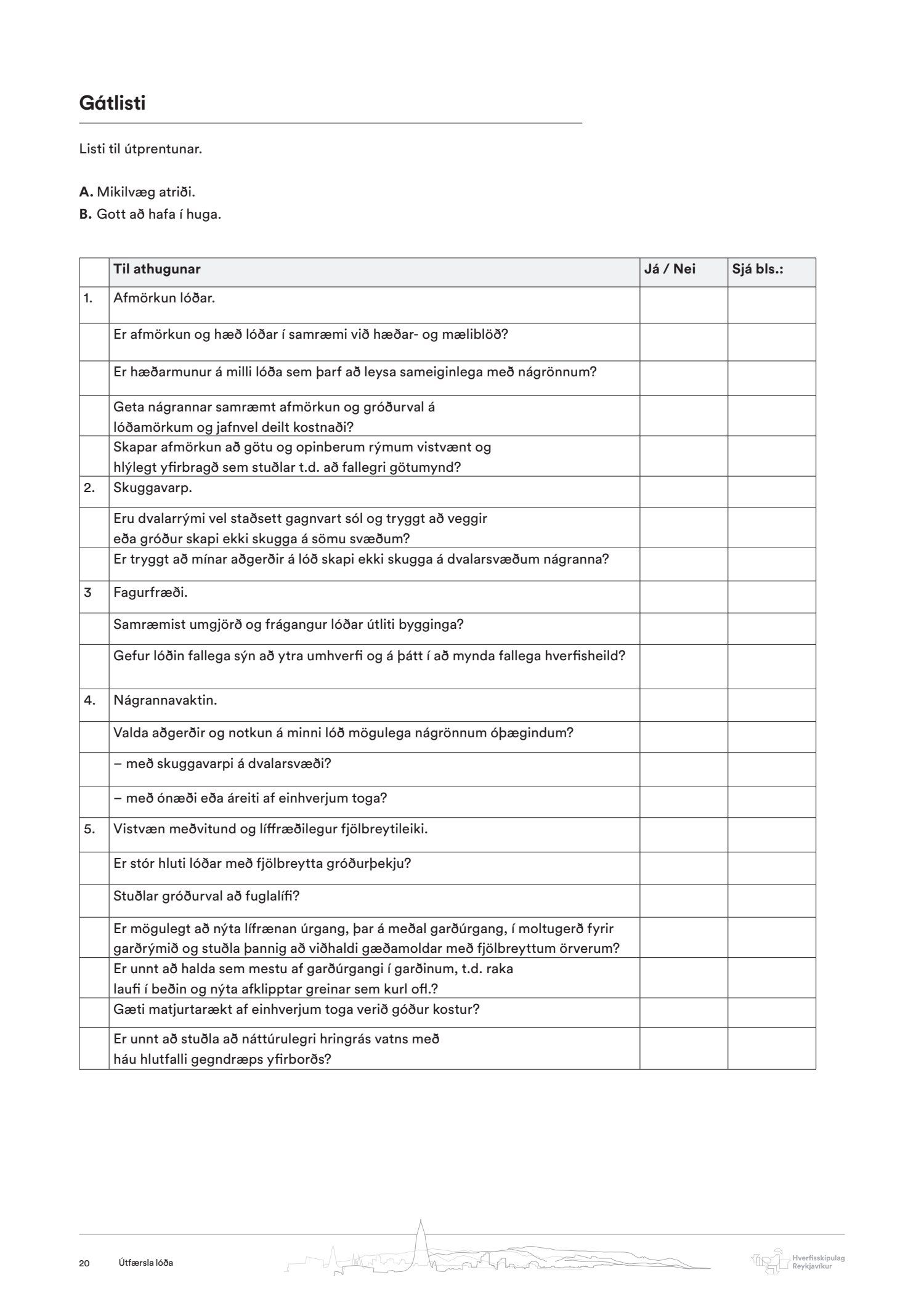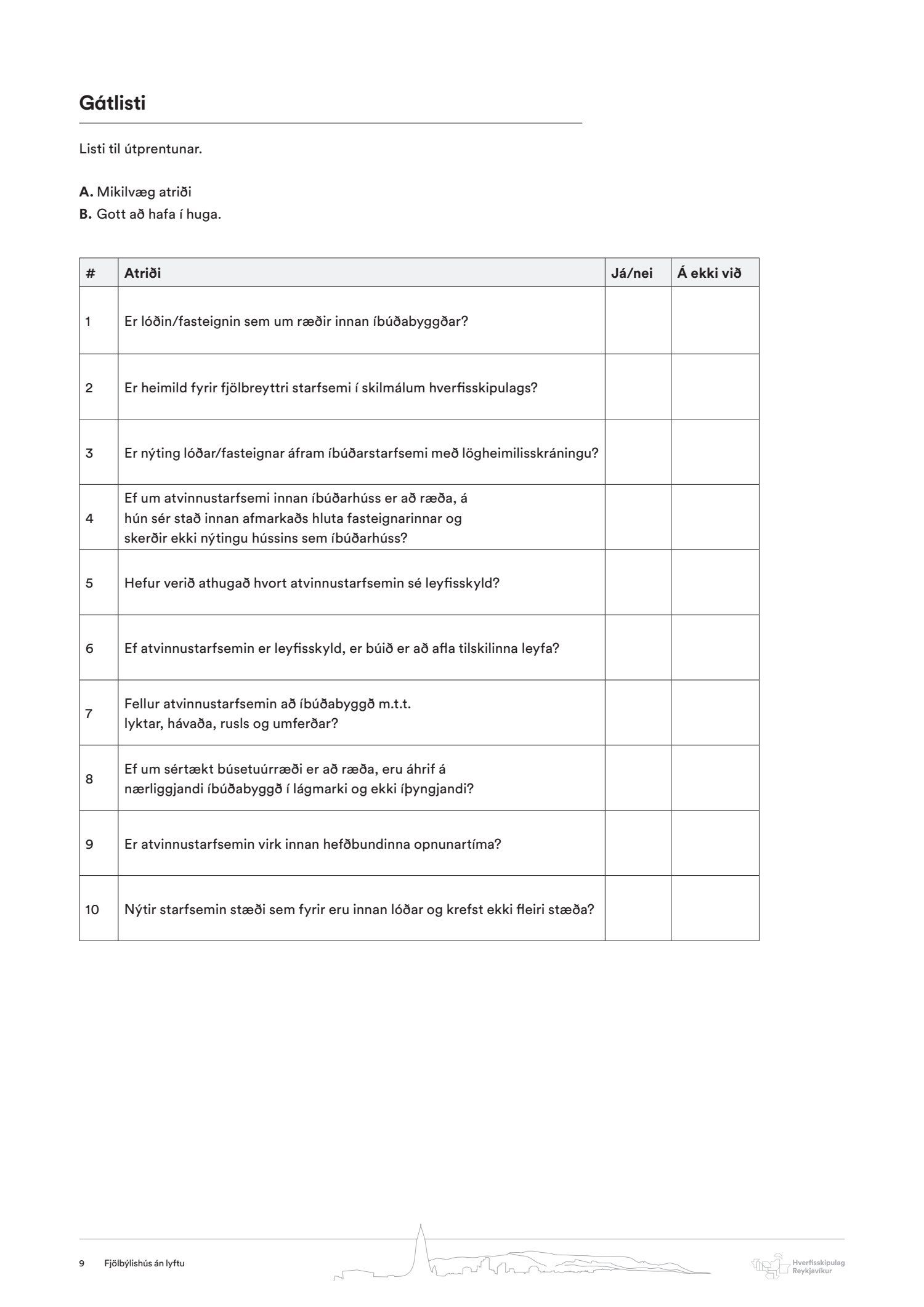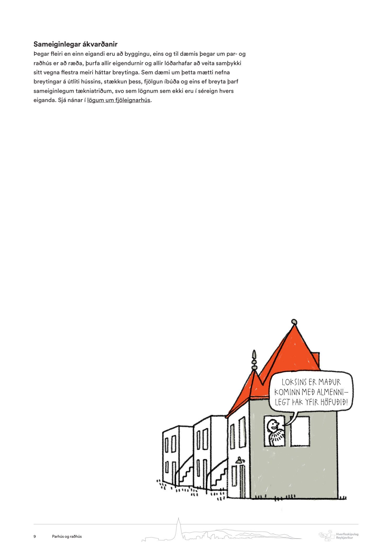 Lagðar fram leiðbeiningar um 1. Starfsemi í íbúðabyggð, 2. Fjölgun íbúða, 3. Viðbyggingar við einbýlishús, 4. Parhús og raðhús, 5. Fjölbýlishús án lyftu, 6. Borgarbúskapur, 7. Borgargötur, 8. Hverfiskjarnar, 9. Þakbreytingar, 10. svalir og útlitsbreytingar á húsum, 11. Almenningsrými, 12. Ljósvist, 13. Útfærsla lóða og 14. Blágrænar ofanvatnslausnir.