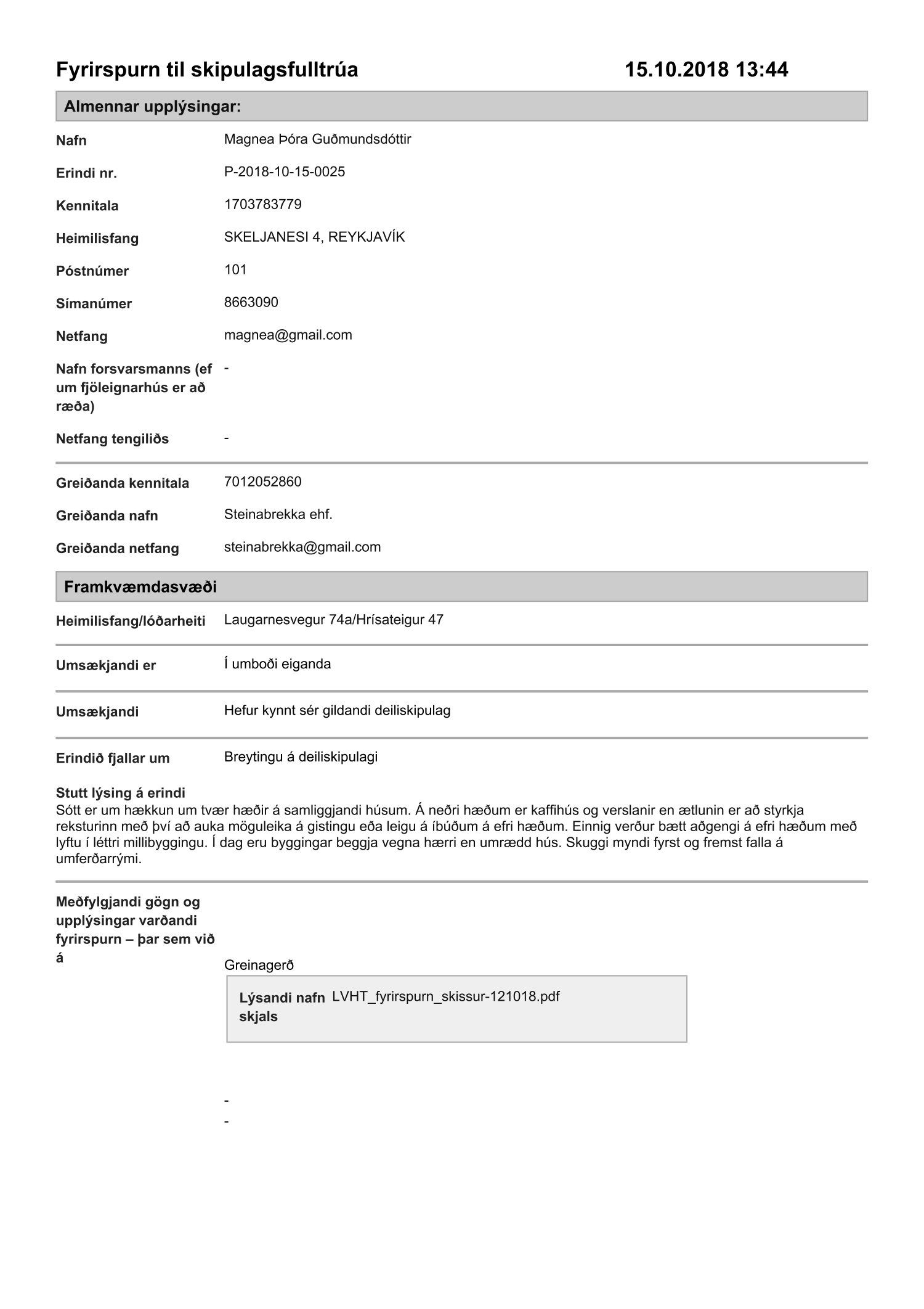 dags. 11. október 2018. Fyrirspurninni frestað, umsækjandi hafi samband við embættið, og er nú lögð fram að nýju ásamt nýrri tillögu