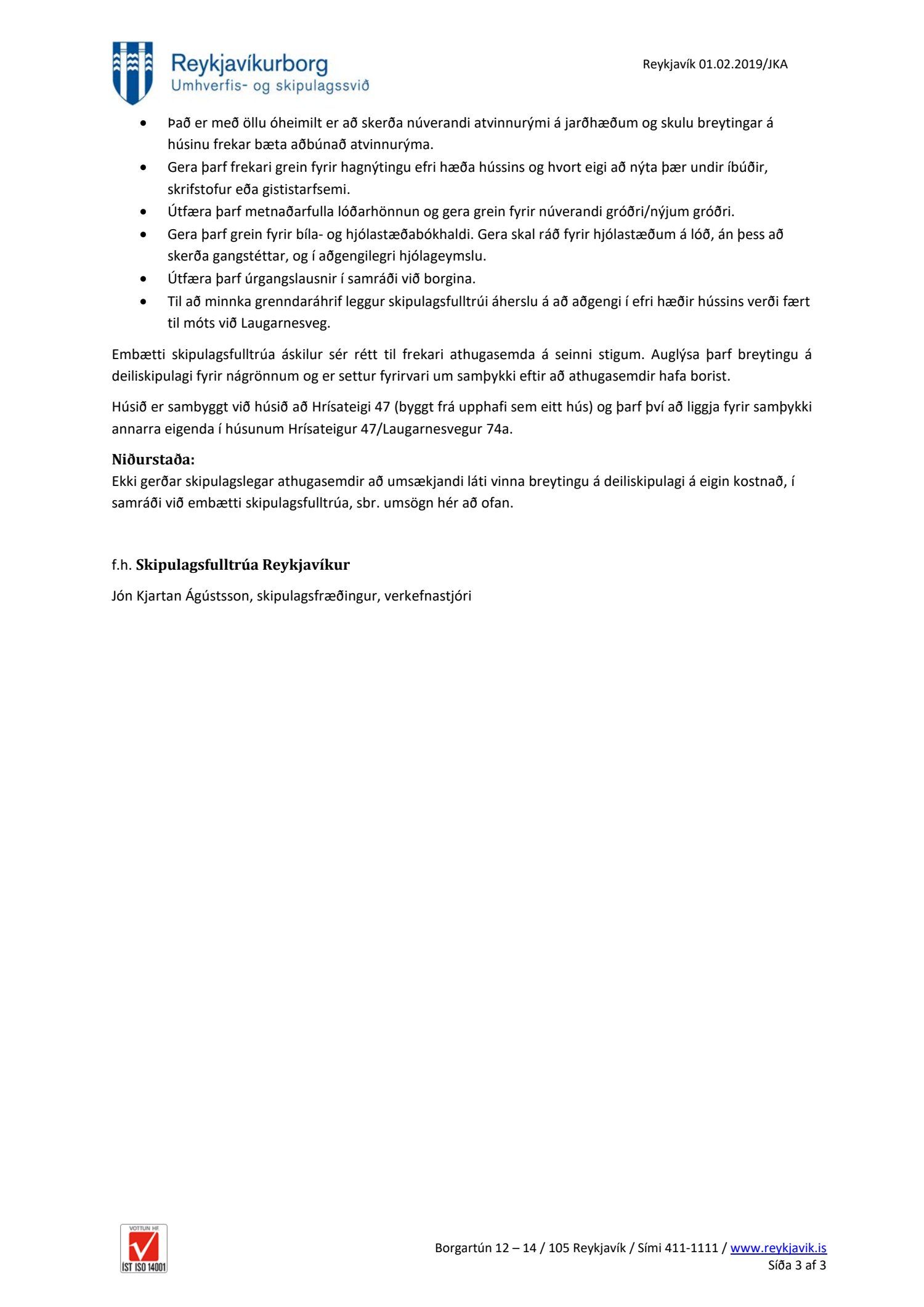 Skipulags- og samgönguráð gerir ekki athugasemd við að umsækjandi láti vinna breytingu á deiliskipulagi með tilliti til þeirra leiðbeininga sem fram koma í umsögn skipulagsfulltrúa dags. 1. febrúar 2019.