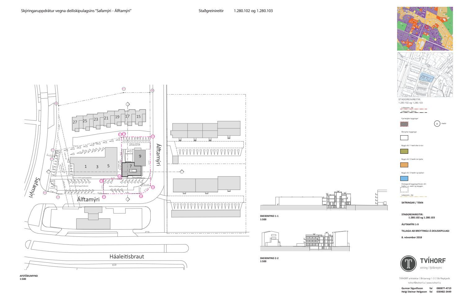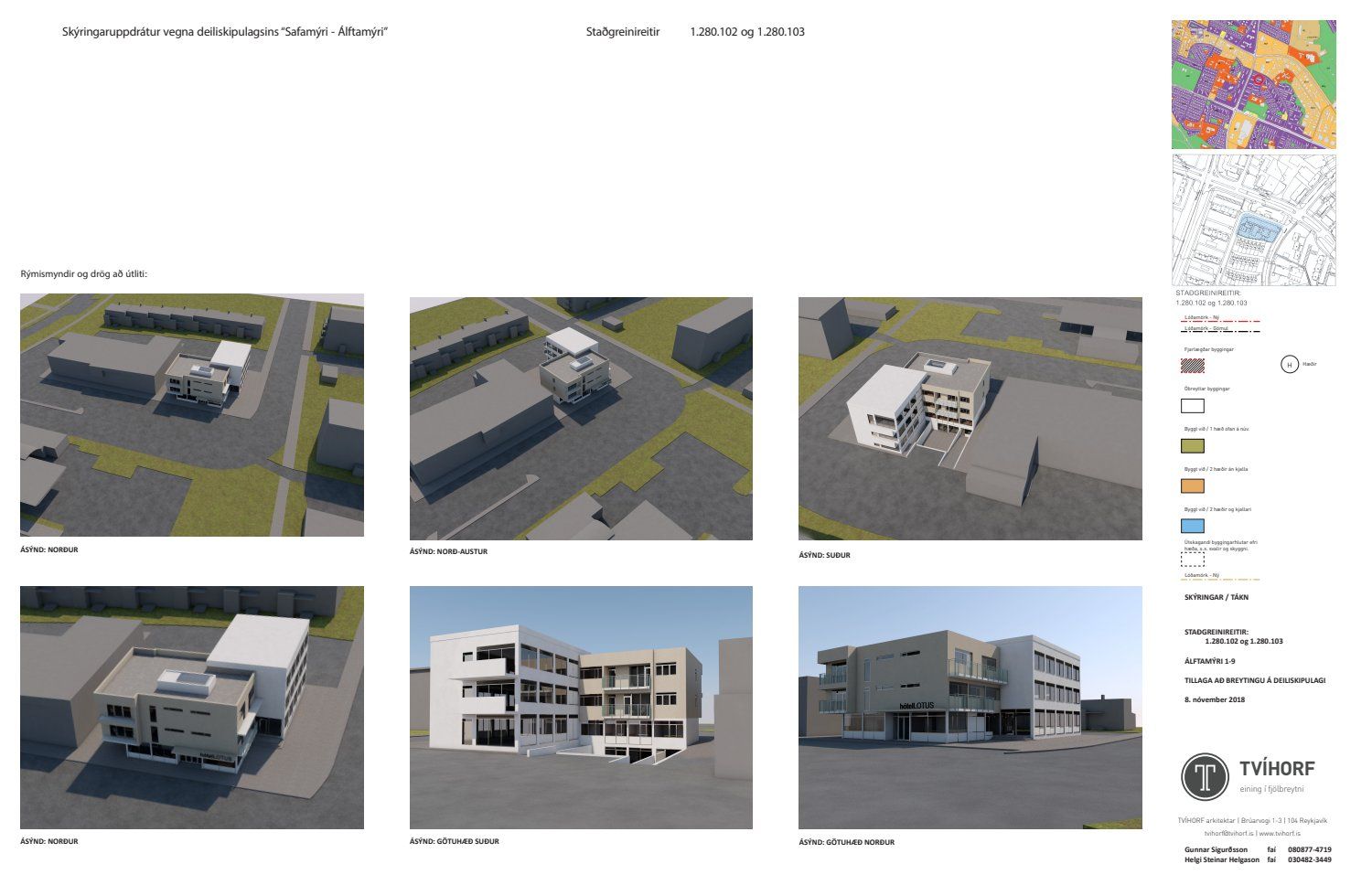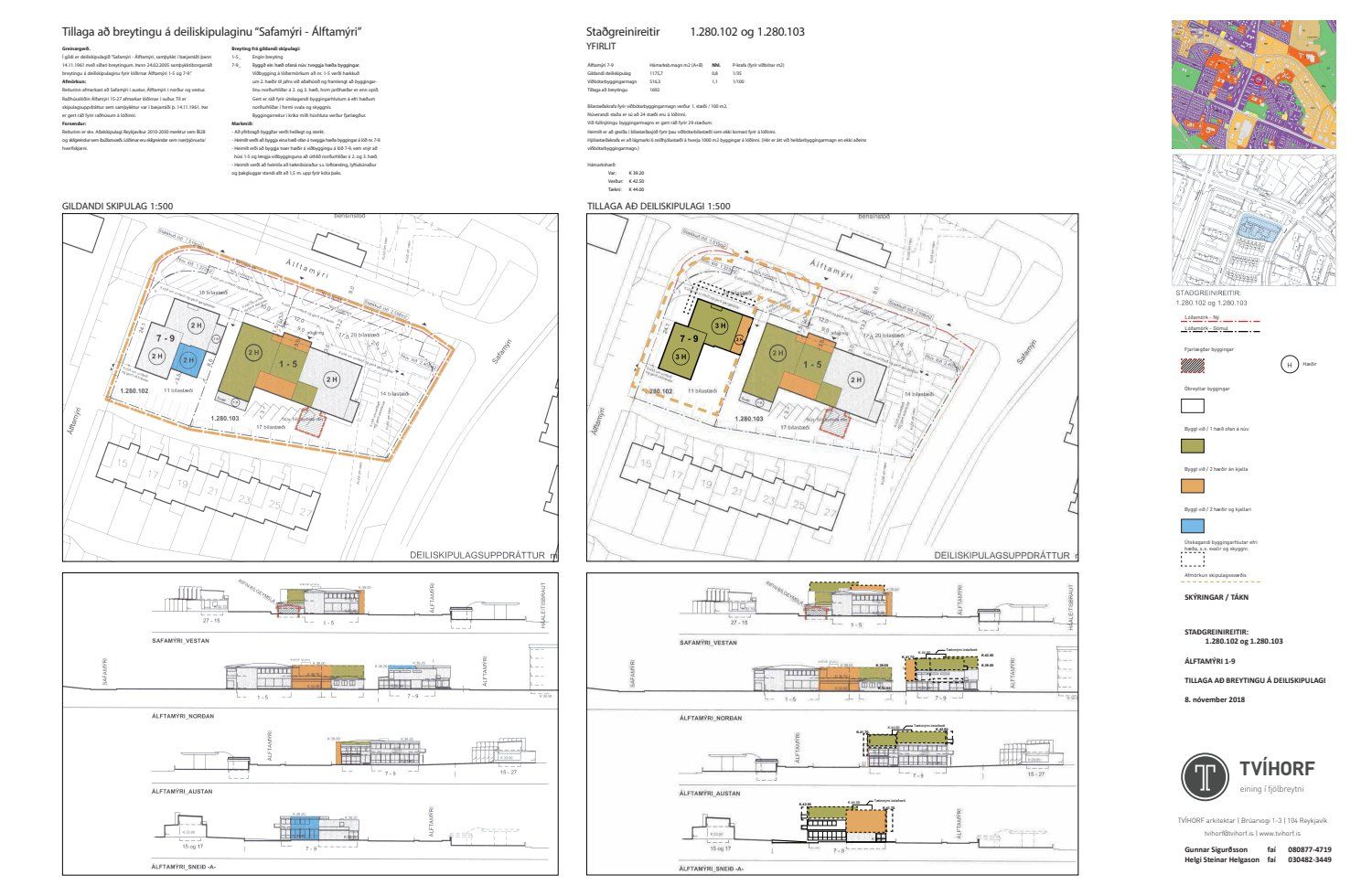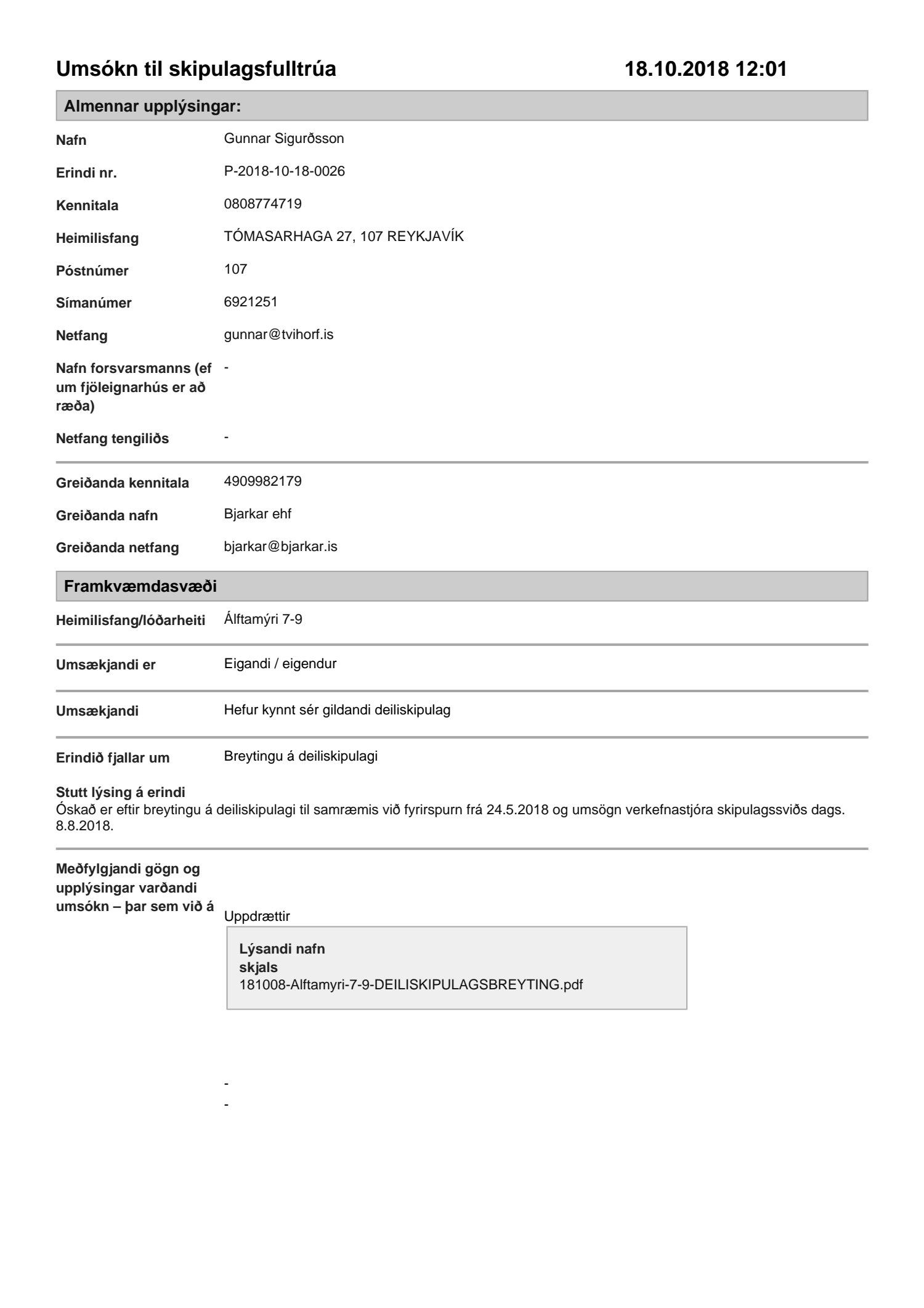 Lögð fram umsókn Gunnars Sigurðssonar dags. 18. október 2018 varðandi breytingu á deiliskipulagi fyrir Álftamýri 1-5 og 7-9 vegna lóðarinnar nr. 7-9 við Álftamýri 7-9. Í breytingunni felst m.a. að byggð er ein hæð ofan á núverandi tveggja hæða byggingu og viðbygging á lóðarmörkum lóðar nr. 1-5 við Álftamýri verði hækkuð um tvær hæðir til jafns við aðalhúsið og framlengt að byggingarlínu norðurhliðar á 2. og 3. hæð, horn jarðhæðar er enn opið, samkvæmt uppdr. Tvíhorf dags. 8. nóvember 2018.