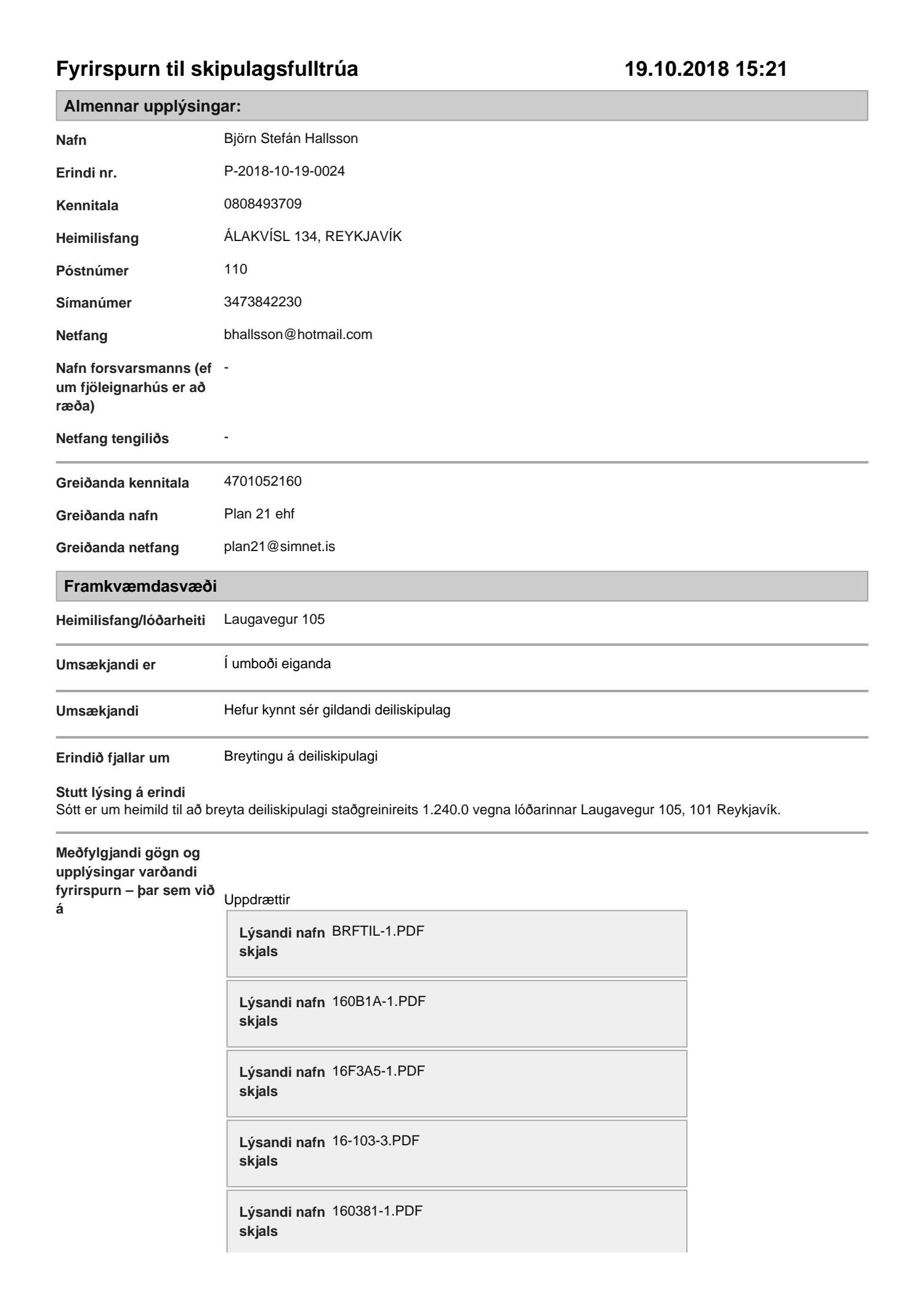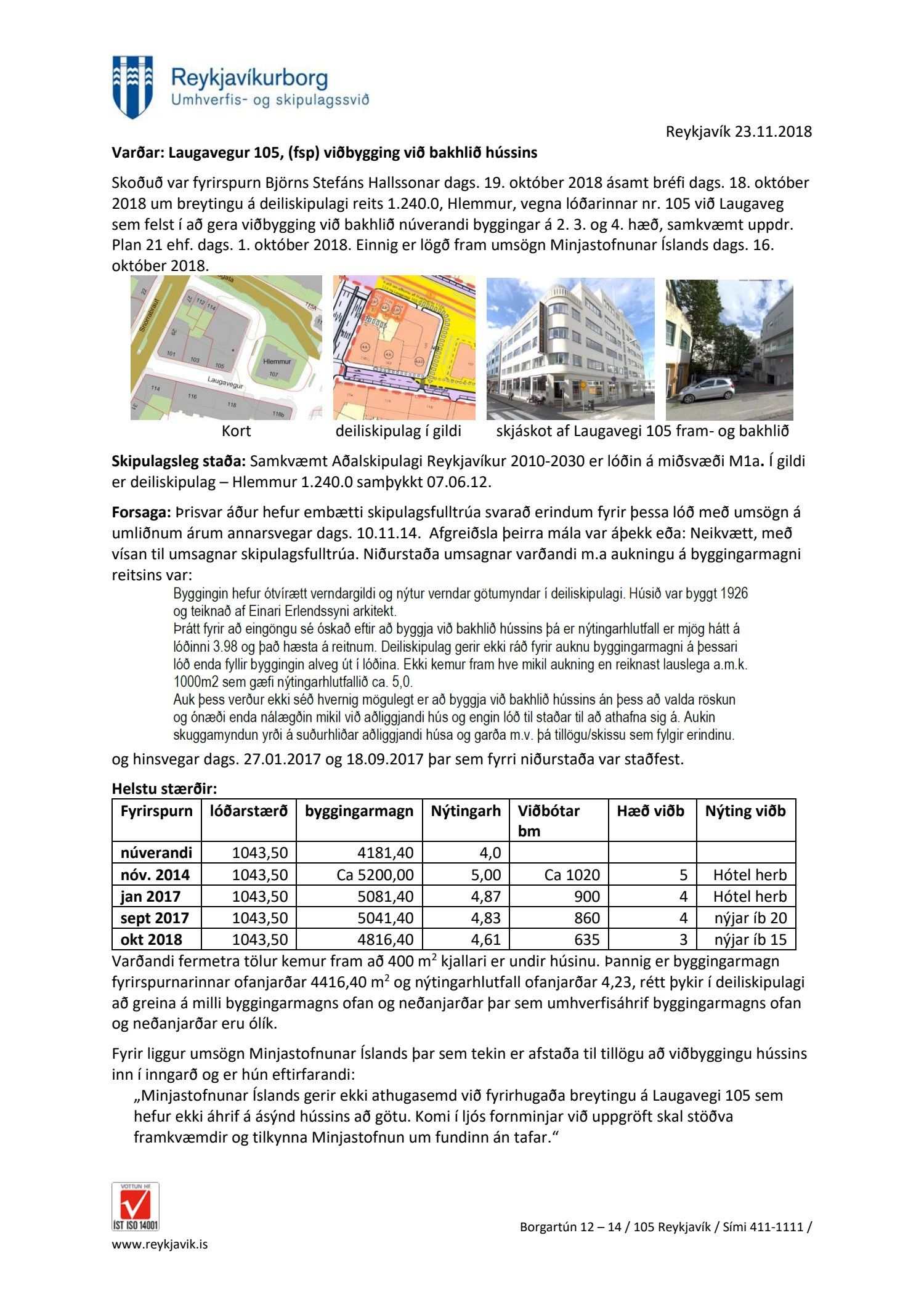 Lögð fram fyrirspurn Björns Stefáns Hallssonar dags. 19. október 2018 ásamt bréfi dags. 18. október 2018 um breytingu á deiliskipulagi reits 1.240.0, Hlemmur, vegna lóðarinnar nr. 105 við Laugaveg sem felst í að gera viðbygging við bakhlið núverandi byggingar á 2. 3. og 4. hæð, samkvæmt uppdr. Plan 21 ehf. dags. 1. október 2018. Einnig er lögð fram umsögn Minjastofnunar Íslands dags. 16. október 2018. Jafnframt er lögð umsögn skipulagsfulltrúa dags. 23. nóvember 2018. Frestað.