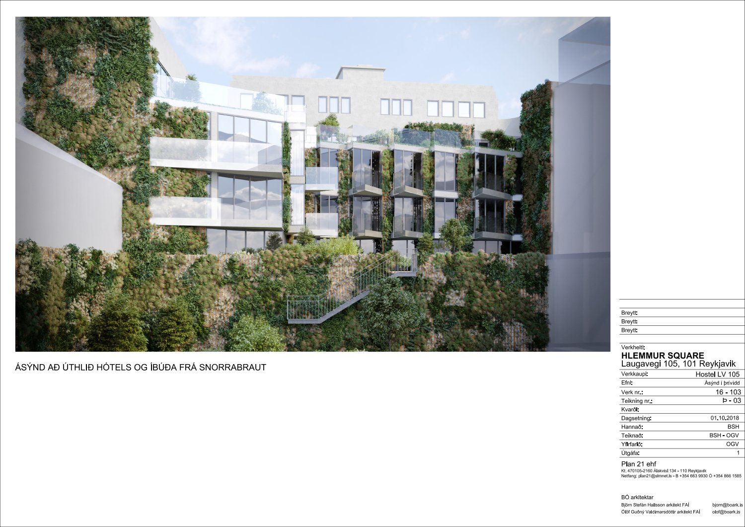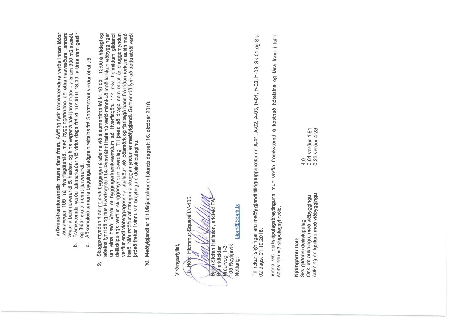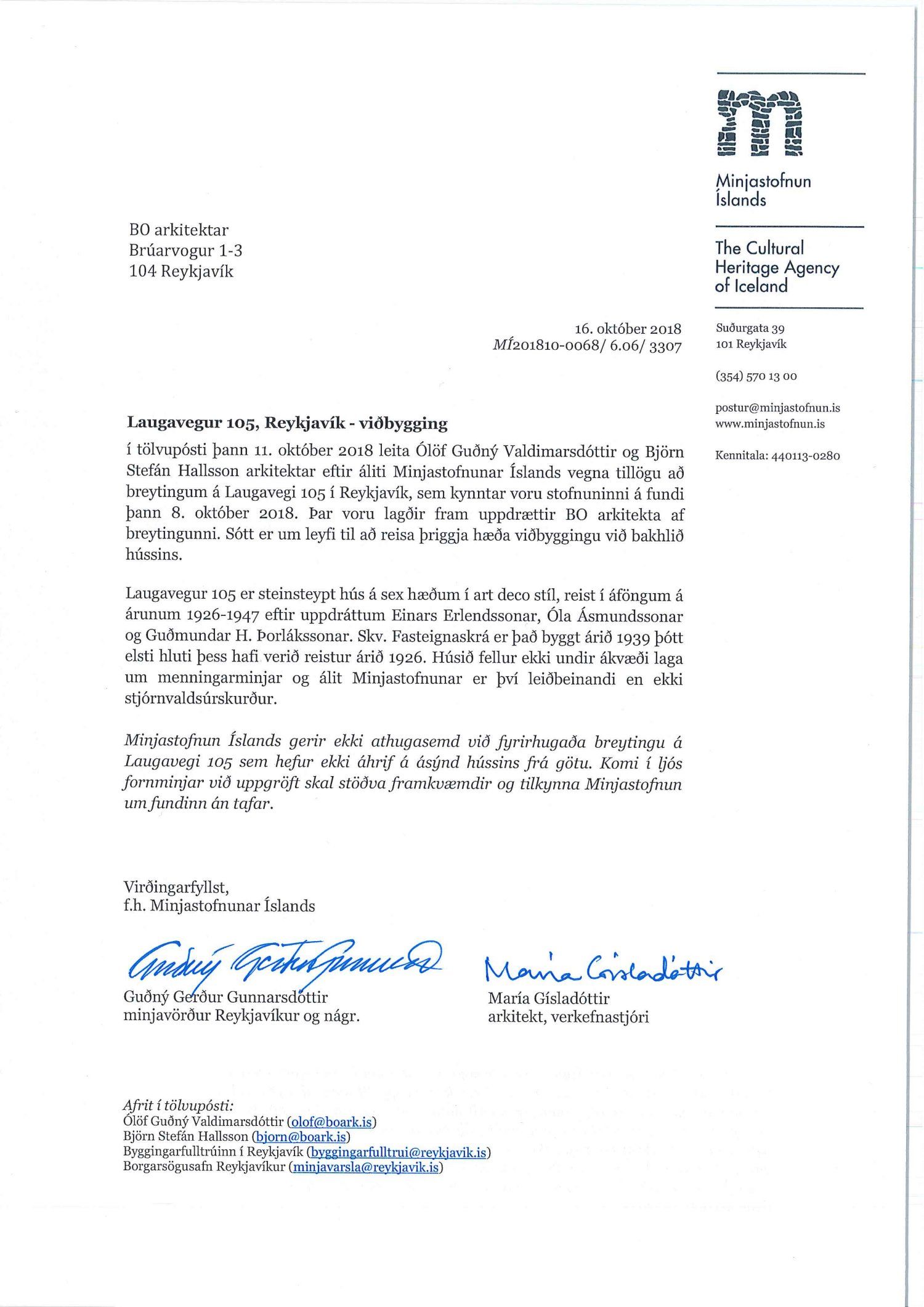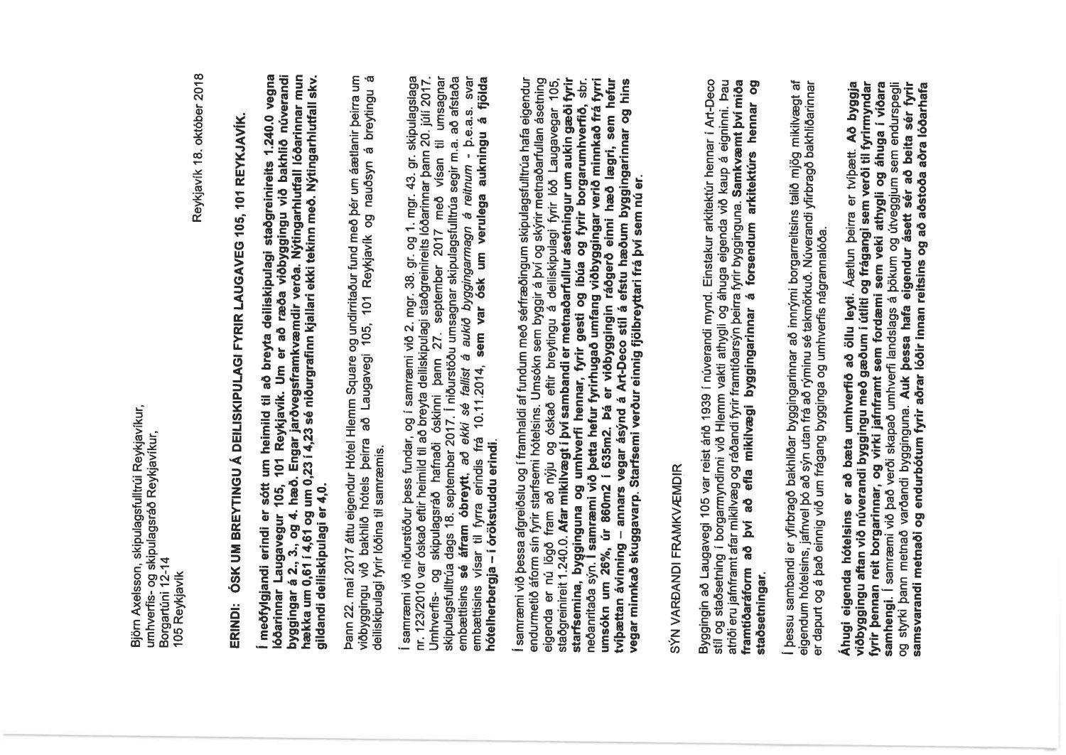 Lögð fram fyrirspurn Björns Stefáns Hallssonar dags. 19. október 2018 ásamt bréfi dags. 18. október 2018 um breytingu á deiliskipulagi reits 1.240.0, Hlemmur, vegna lóðarinnar nr. 105 við Laugaveg sem felst í að gera viðbygging við bakhlið núverandi byggingar á 2. 3. og 4. hæð, samkvæmt uppdr. Plan 21 ehf. dags. 1. október 2018. Einnig eru lagðar fram umsagnir Minjastofnunar Íslands dags. 16. október 2018 og  skipulagsfulltrúa dags. 25. janúar 2019. Umsögn skipulagsfulltrúa dags. 25. janúar 2019 samþykkt.