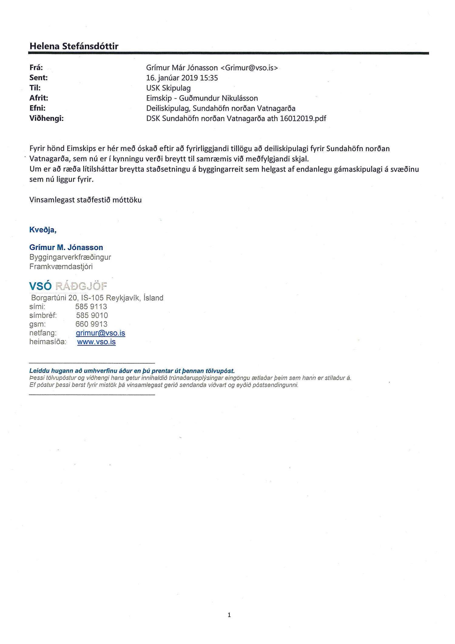 dags. 15. október 2018 uppf. 28. janúar 2019. Tillagan var auglýst frá 7. desember 2018 til og með 23. janúar 2019. Eftirtaldir aðilar sendu athugasemdir: Grímur M. Jónasson f.h. Eimskips dags. 16. janúar 2019. Einnig er lögð fram umsögn skipulagsfulltrúa dags. 1. febrúar 2019.