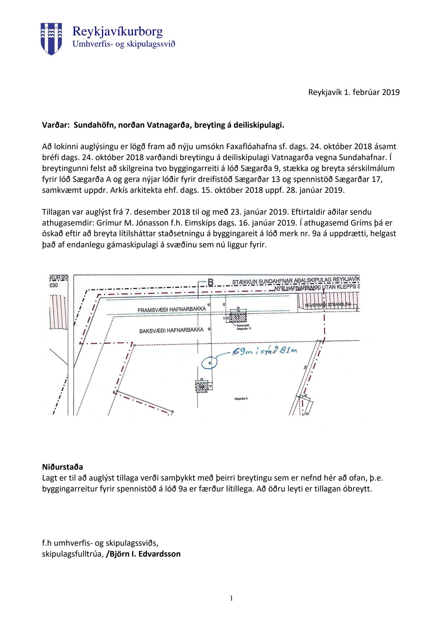 dags. 24. október 2018 ásamt bréfi dags. 24. október 2018 varðandi breytingu á deiliskipulagi Vatnagarða vegna Sundahafnar. Í breytingunni felst að skilgreina tvo byggingarreiti á lóð Sægarða 9, stækka og breyta sérskilmálum fyrir lóð Sægarða A og gera nýjar lóðir fyrir dreifistöð Sægarðar 13 og spennistöð Sægarðar 17, samkvæmt uppdr.
