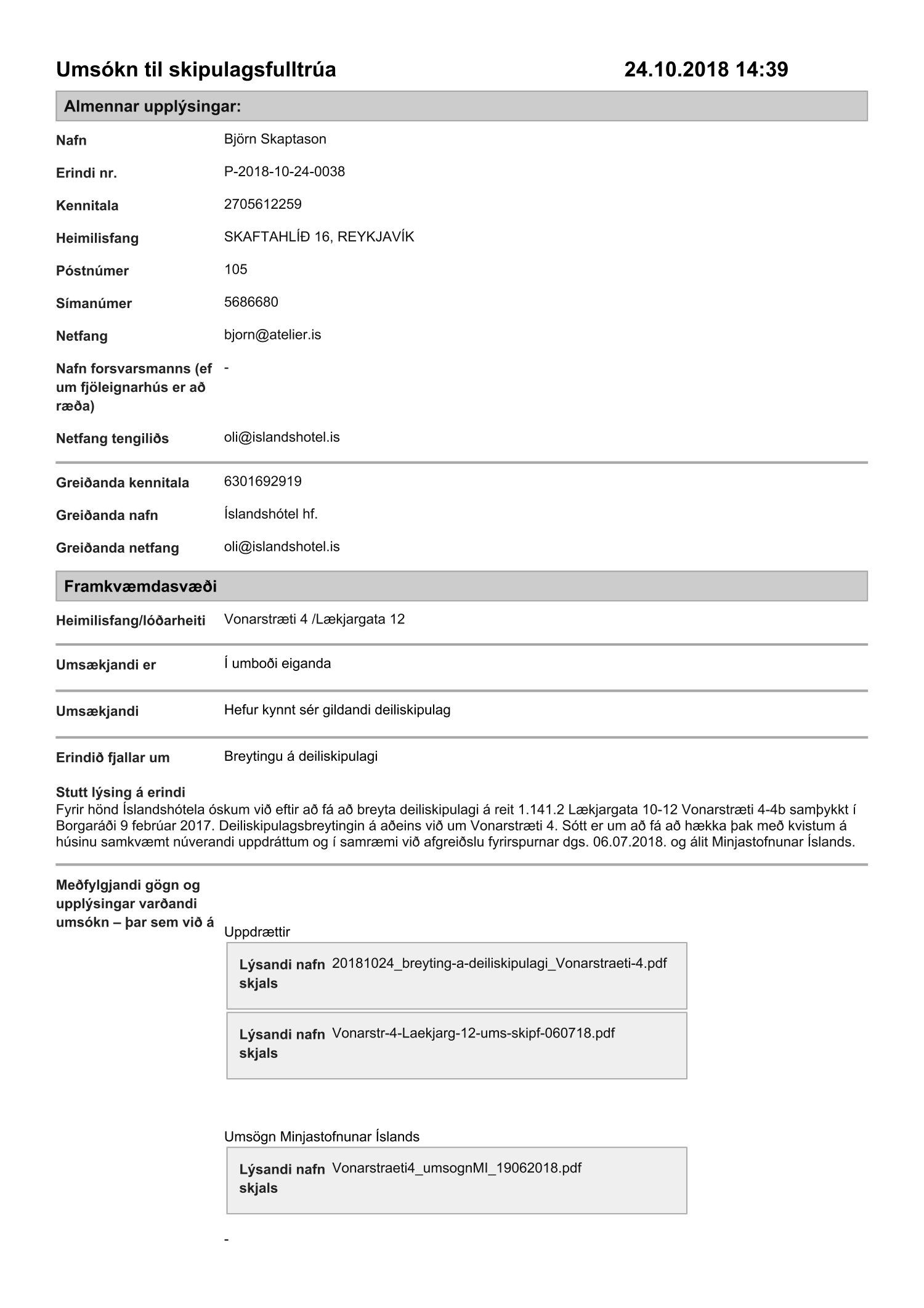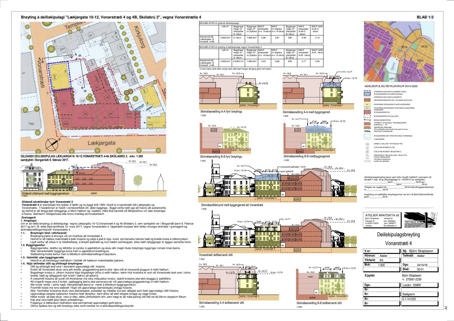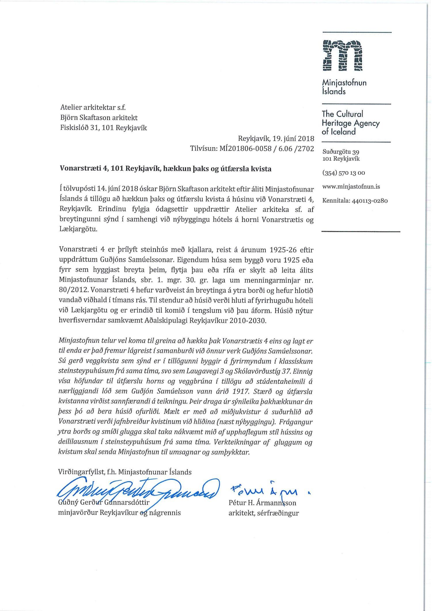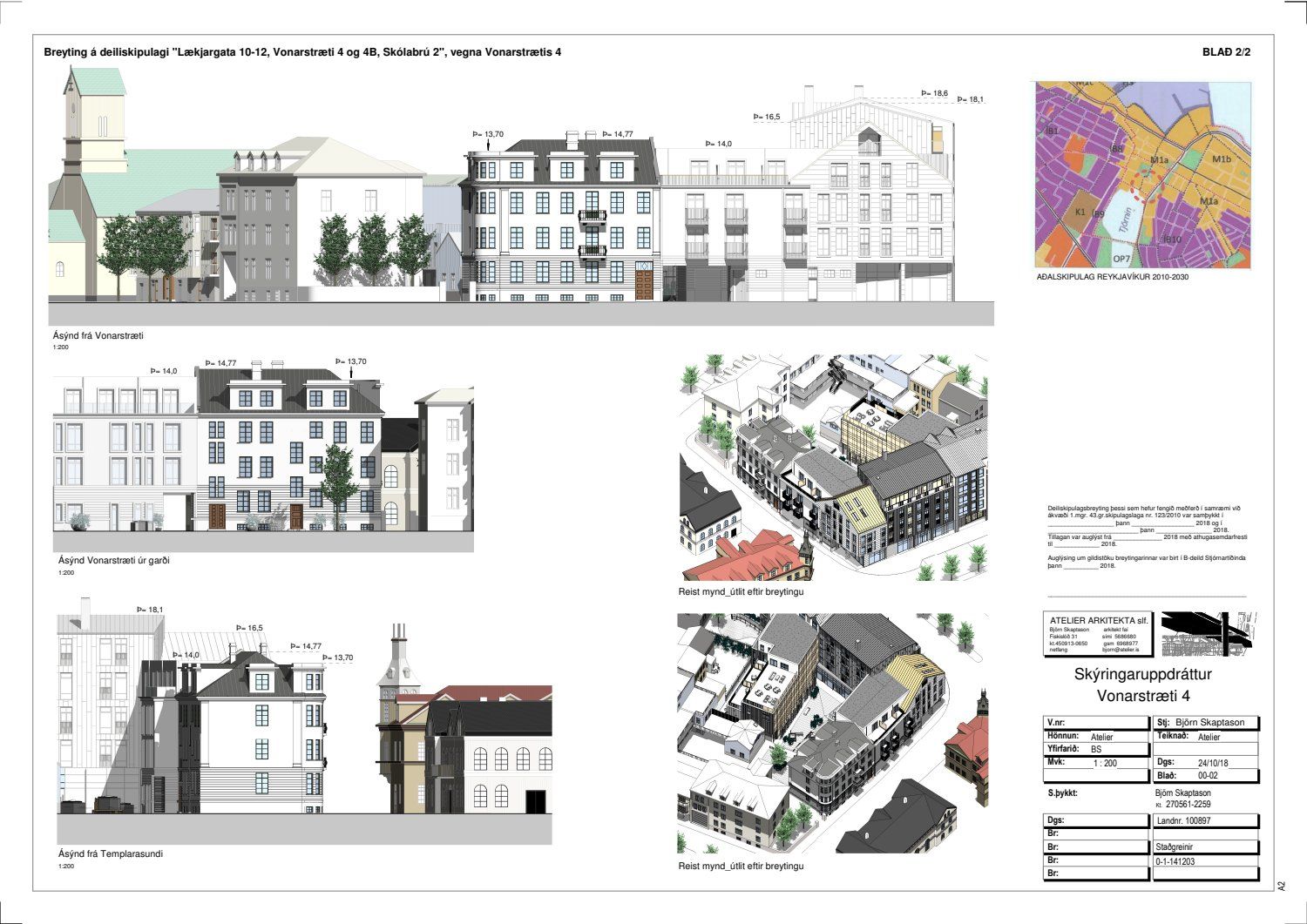 Lögð fram umsókn Björns Skaptasonar dags. 24. október 2018 varðandi breytingu á deiliskipulagi Lækjargötu 10-12, Vonarstræti 4 og 4b, Skólabrú 2 vegna lóðarinnar nr. 4 við Vonarstræti. Í breytingunni felst að heimilt er að hækka mænishæð á þaki hússins og setja fimm nýja kvisti. Heimilt verður að útbúa fjögur ný hótelherbergi á breyttri þakhæð og mun hæðin samtengjast efstu hæð nýbyggingar er liggur samsíða henni, samkvæmt uppdr.