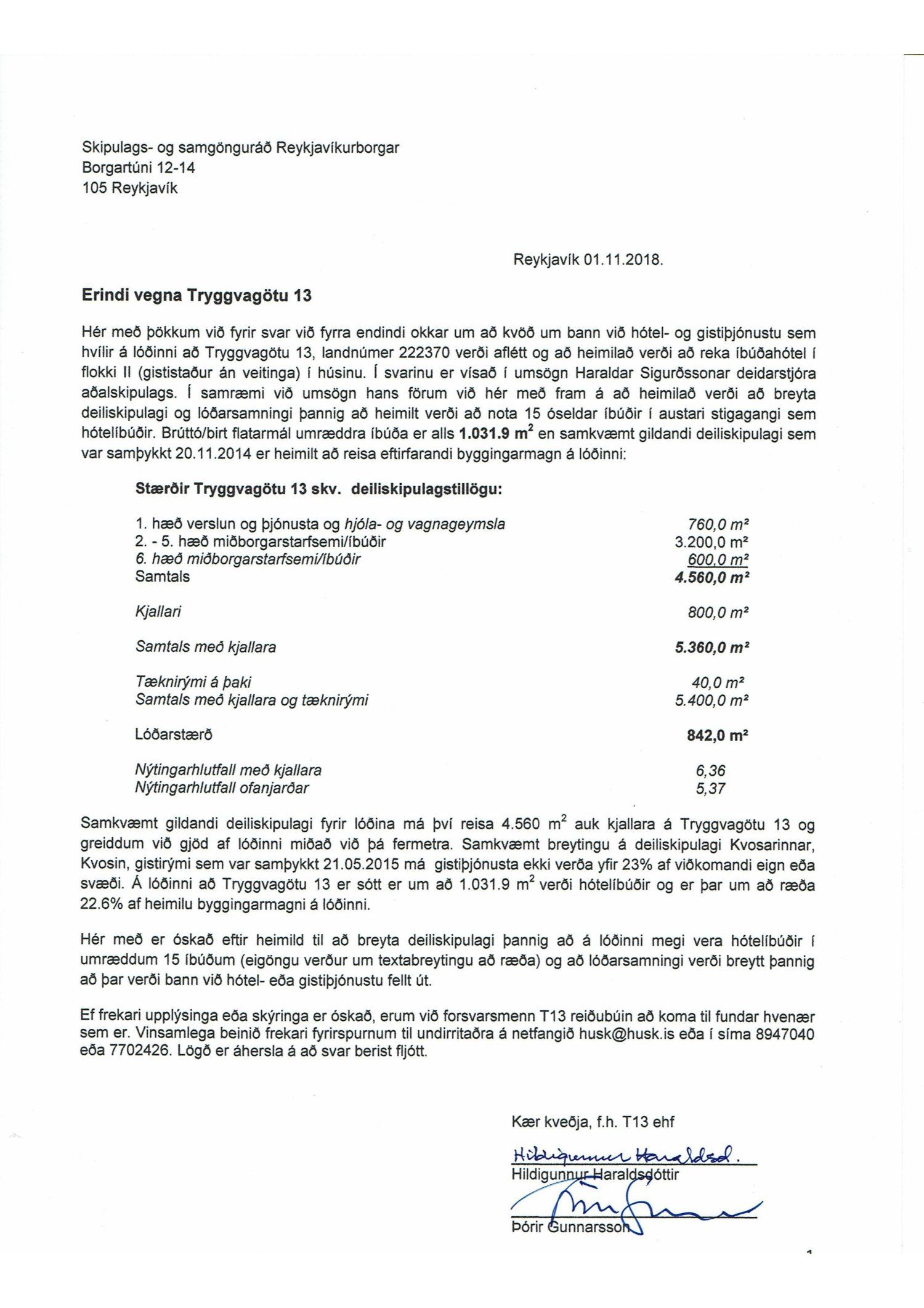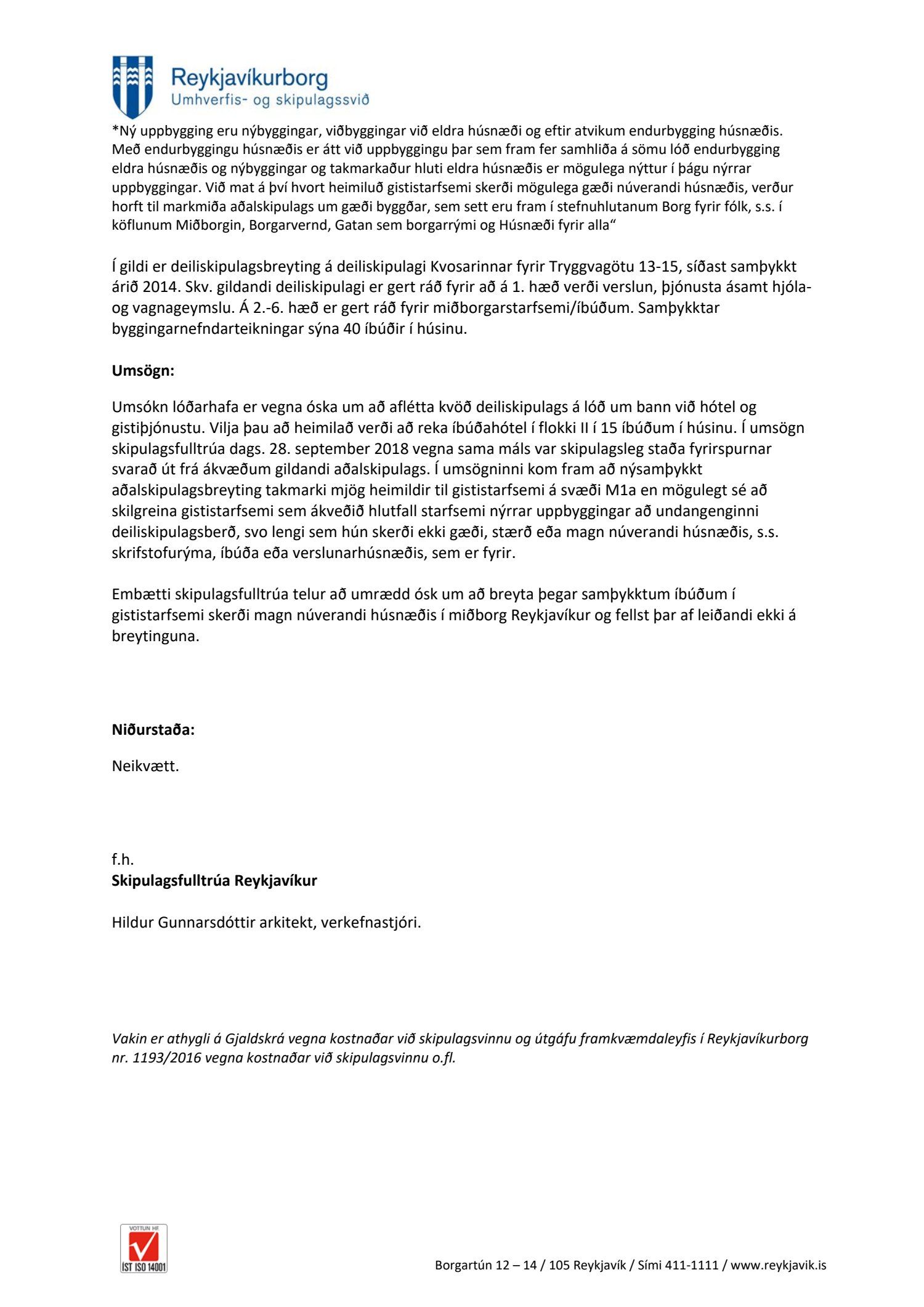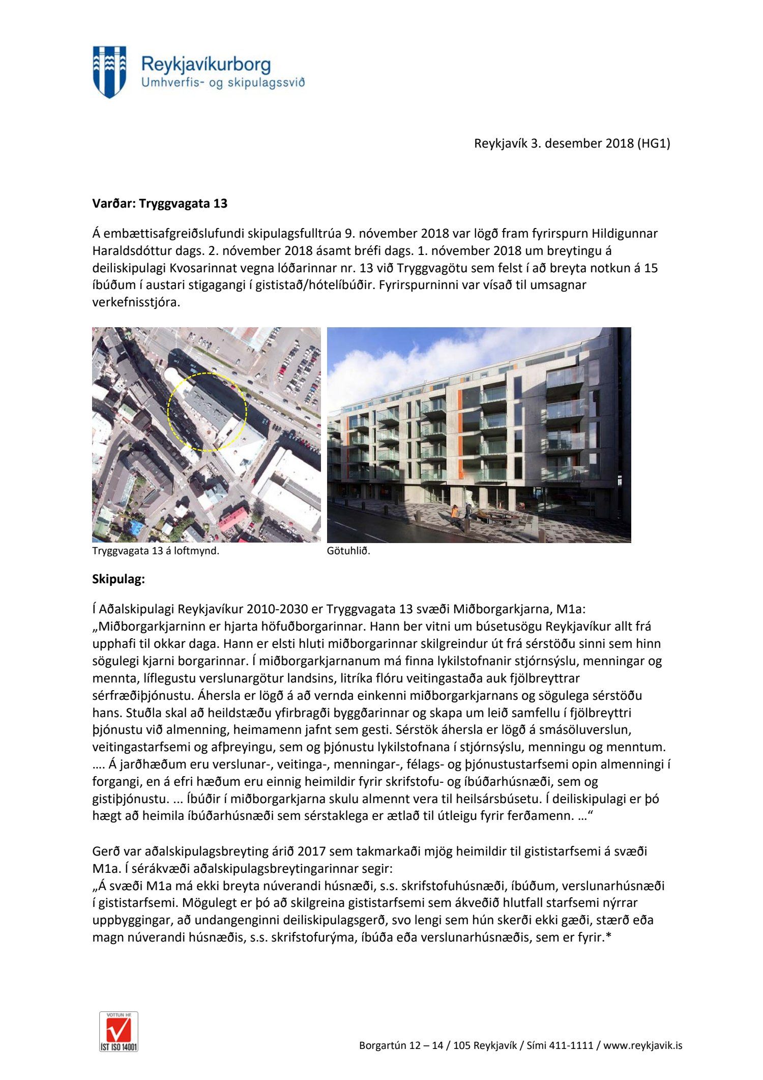 Lögð fram fyrirspurn Hildigunnar Haraldsdóttur dags. 2. nóvember 2018 ásamt bréfi dags. 1. nóvember 2018 um breytingu á deiliskipulagi Kvosarinnat vegna lóðarinnar nr. 13 við Tryggvagötu sem felst í að breyta notkun á 15 íbúðum í austari stigagangi í gististað/hótelíbúðir. Einnig er lögð fram umsögn skipulagsfulltrúa dags. 3. desember 2018.