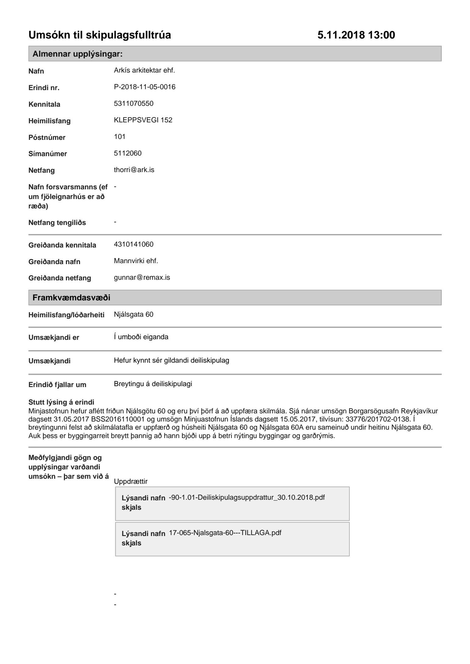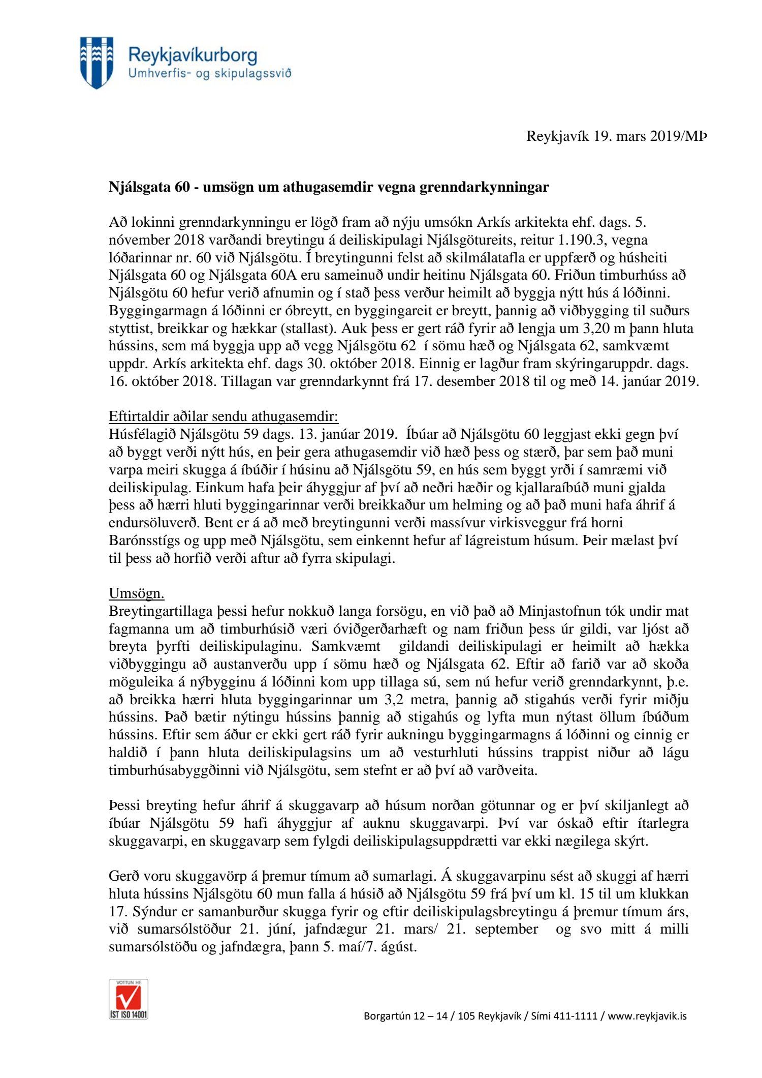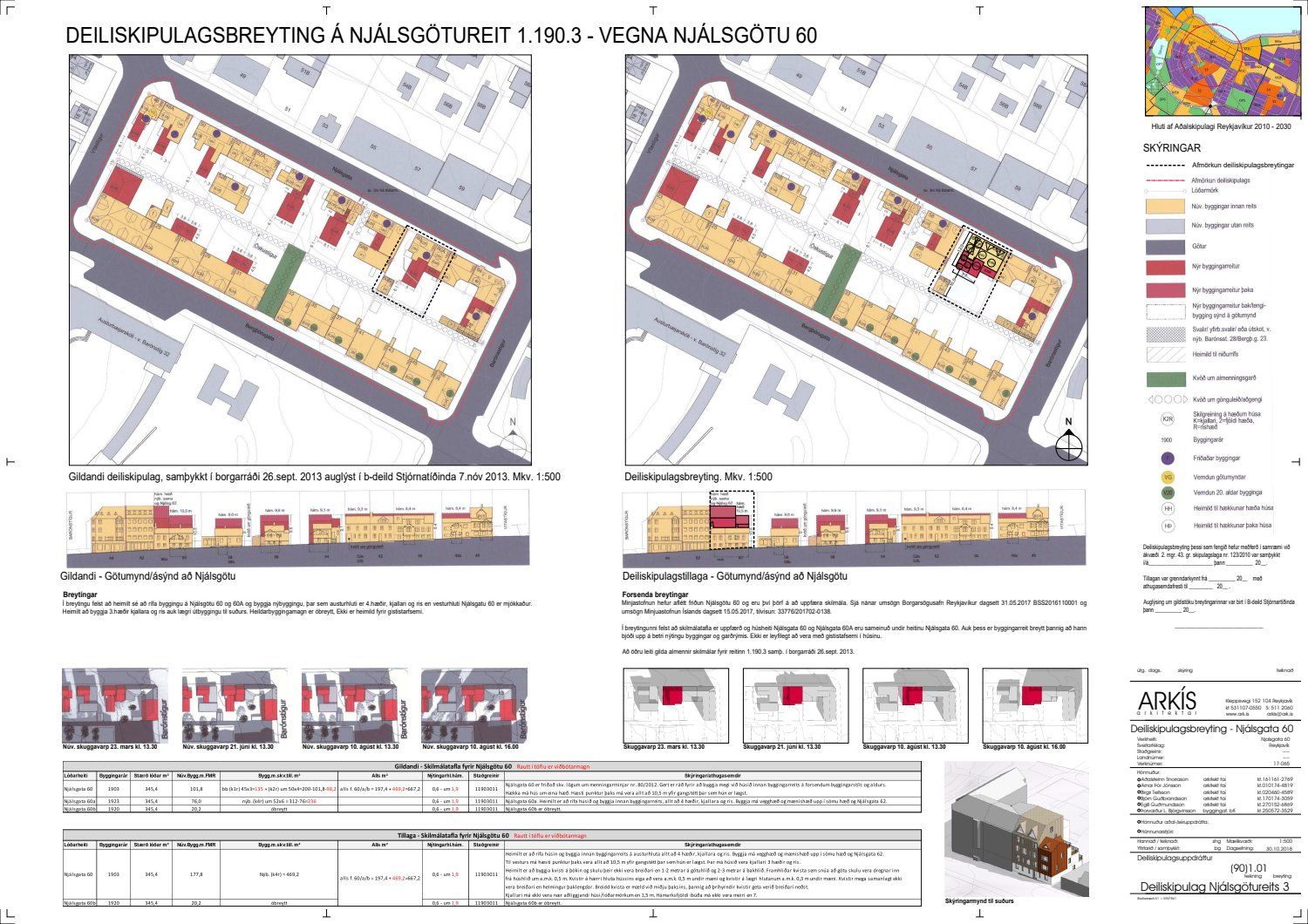 dags. 5. nóvember 2018 varðandi breytingu á deiliskipulagi Njálsgötureits, reitur 1.190.3, vegna lóðarinnar nr. 60 við Njálsgötu. Í breytingunni felst að skilmálatafla er uppfærð og húsheiti Njálsgata 60 og Njálsgata 60A eru sameinuð undir heitinu Njálsgata 60. Friðun timburhúss að Njálsgötu 60 hefur verið afnumin og í stað þess verður heimilt að byggja nýtt hús á lóðinni. Byggingarmagn á lóðinni er óbreytt, en byggingareit er breytt, þannig að viðbygging til suðurs styttist, breikkar og hækkar (stallast). Auk þess er gert ráð fyrir að lengja um 3,20 m þann hluta hússins, sem má byggja upp að vegg Njálsgötu 62 í sömu hæð og Njálsgata 62, samkvæmt uppdr.