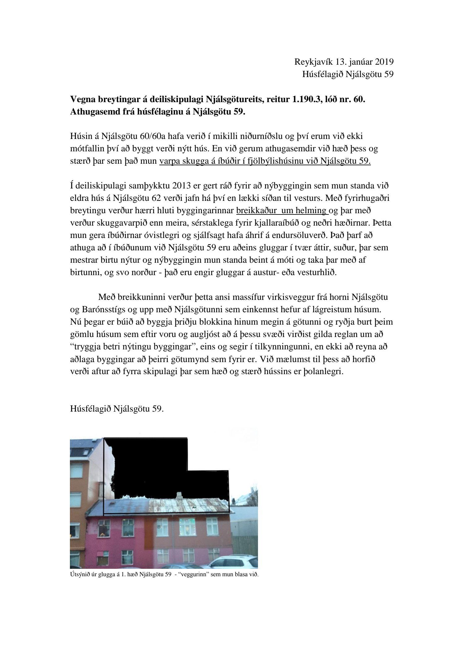 dags 30. október 2018. Einnig er lagður fram skýringaruppdr. dags. 16. október 2018. Tillagan var grenndarkynnt frá 17. desember 2018 til og með 14. janúar 2019. Eftirtaldir aðilar sendu athugasemdir: Húsfélagið Njálsgötu 59 dags. 13. janúar 2019. Einnig er lögð fram umsögn skipulagsfulltrúa dags. 19. mars 2019.