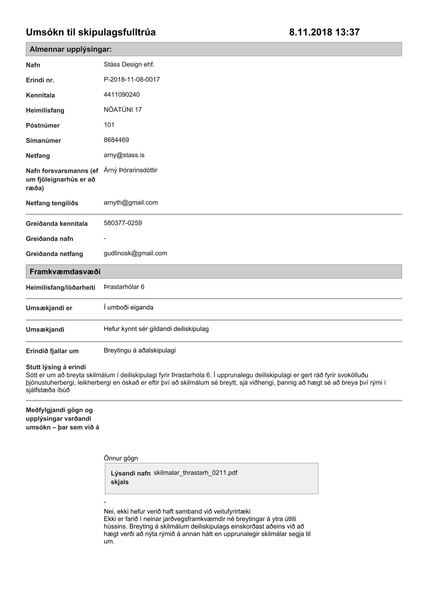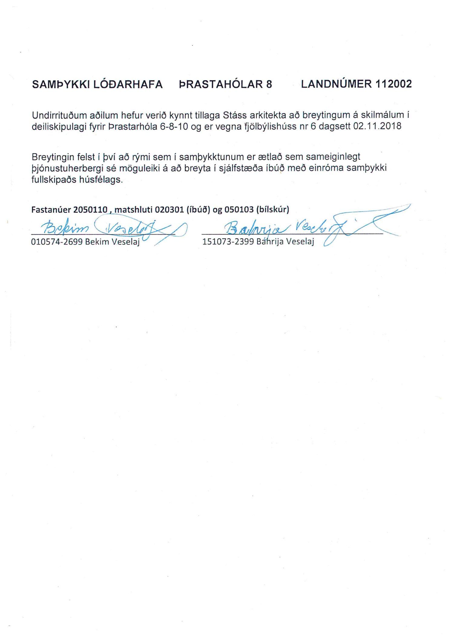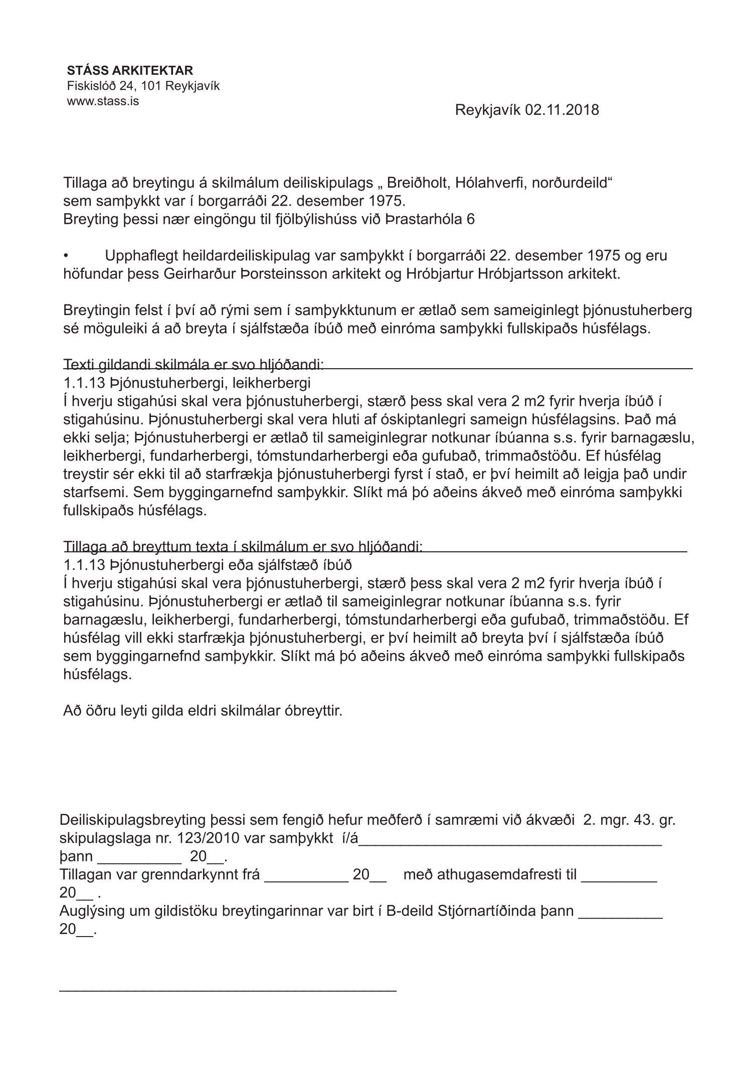 Lögð er fram umsókn Stáss Design ehf. dags. 8. nóvember 2018 varðandi breytingu á skilmálum deiliskipulags Breiðholts -3 norðurdeild vegna lóðarinnar nr. 6-10 við Þrastarhóla. Í breytingunni felst að breyta sameiginlegu þjónustuherbergi í húsi nr. 6 í sjálfstæða íbúð, samkvæmt tillögu Stáss Design ehf. dags. 2. nóvember 2018. Erindinu var vísað til meðferðar hjá verkefnisstjóra og er nú lagt fram að nýju ásamt samþykki lóðarhafa að Þrastarhólum 6, 8 og 10 mótt 8. janúar 2018.