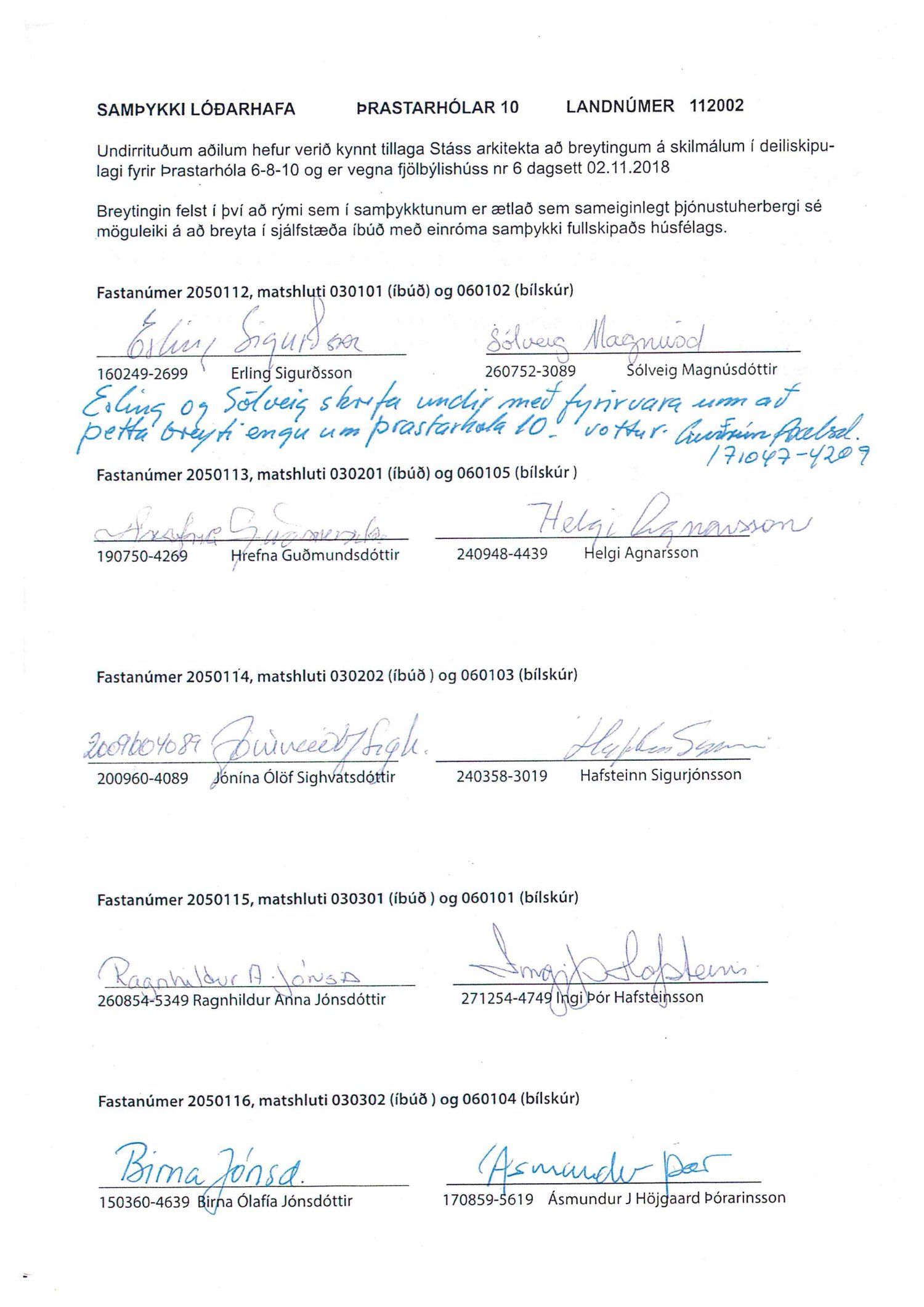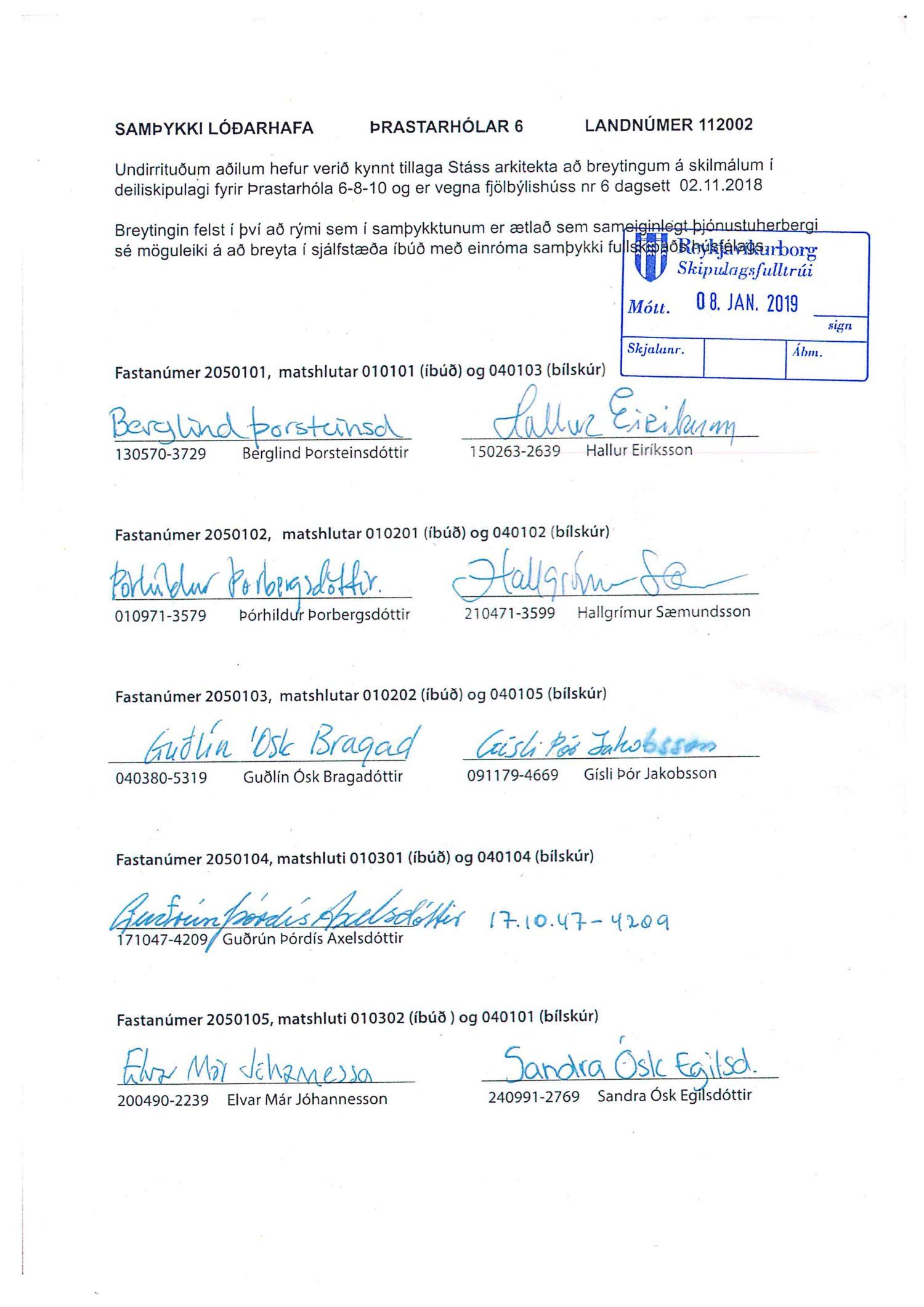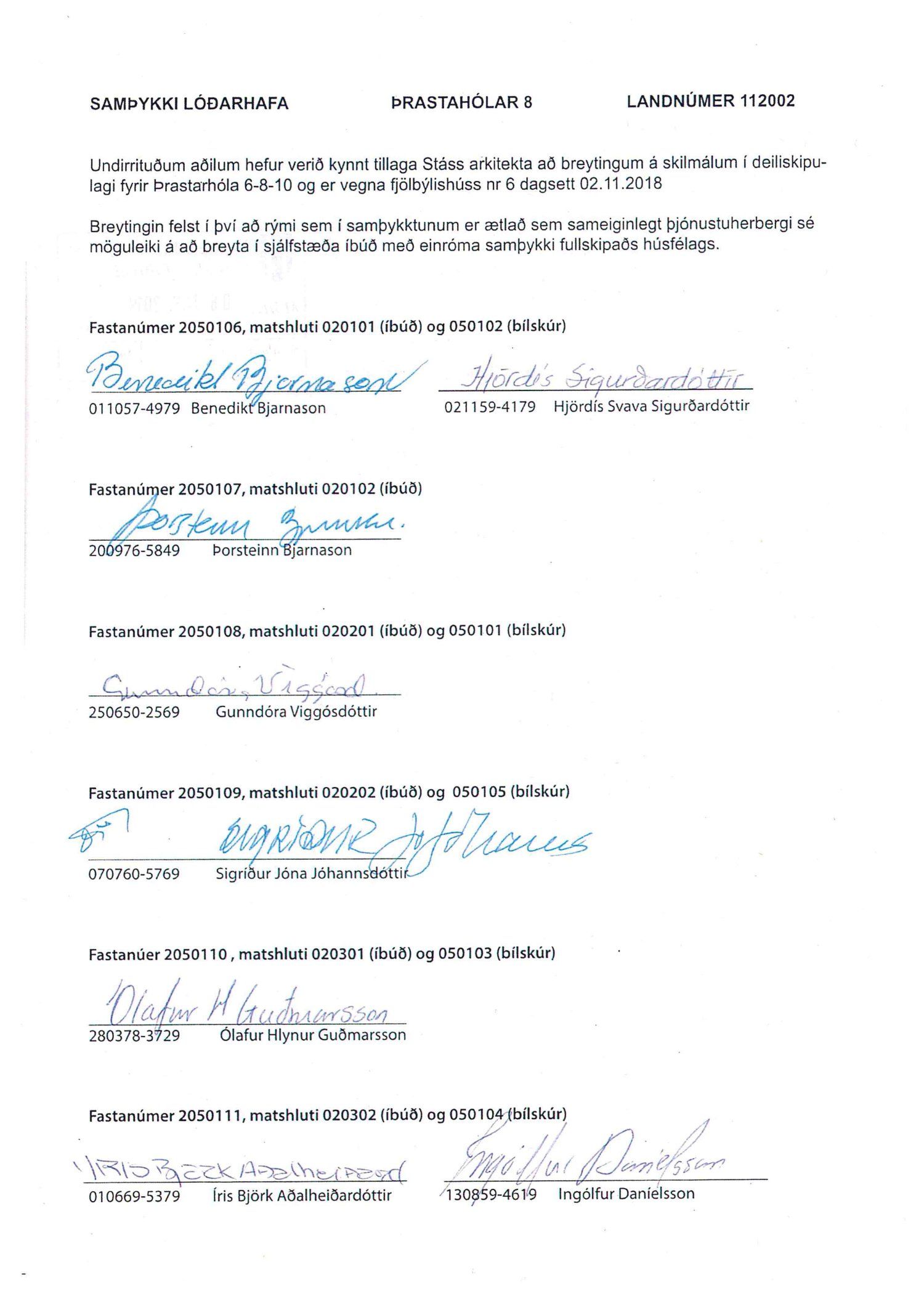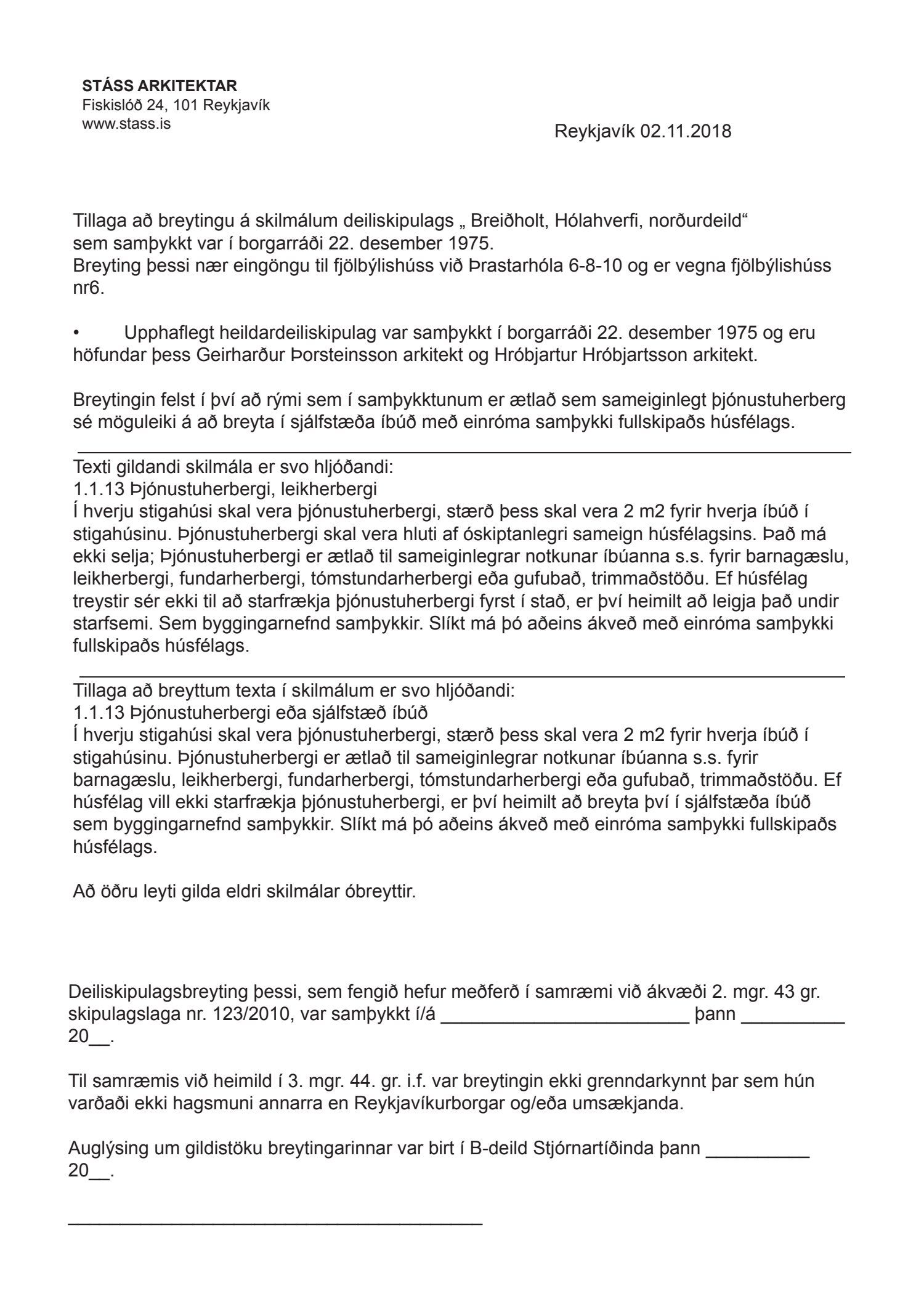 Lögð er fram umsókn Stáss Design ehf. dags. 8. nóvember 2018 varðandi breytingu á skilmálum deiliskipulags Breiðholts -3 norðurdeild vegna lóðarinnar nr. 6-10 við Þrastarhóla. Í breytingunni felst að breyta sameiginlegu þjónustuherbergi í húsi nr. 6 í sjálfstæða íbúð, samkvæmt tillögu Stáss Design ehf. dags. 2. nóvember 2018. Erindinu var vísað til meðferðar hjá verkefnisstjóra og er nú lagt fram að nýju ásamt samþykki lóðarhafa að Þrastarhólum 6, 8 og 10 mótt 8. janúar 2018.