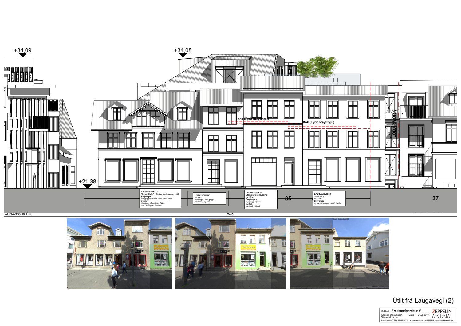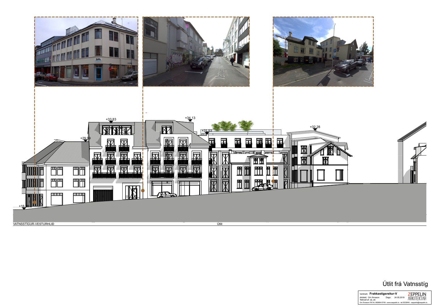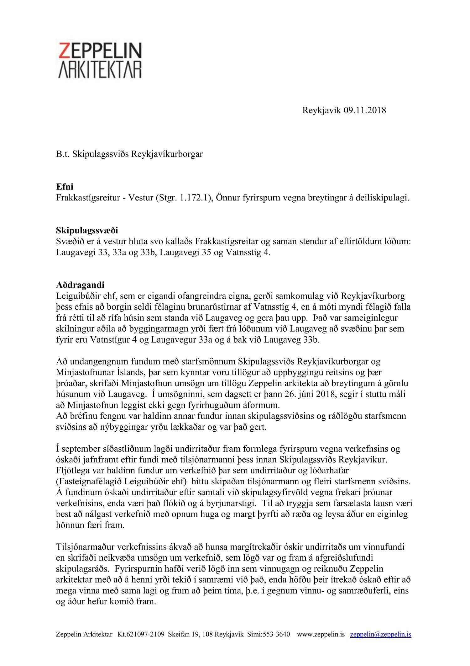 dags. 13. nóvember 2018 ásamt greinargerð dags. 9. nóvember 2018 um breytingu á deiliskipulagi reits 1.172.1, Frakkastígsreits, vegna lóðanna nr. 33, 33A, 33B, 35 og 37 við Laugaveg og 4 við Vatnsstíg sem felst í að hús að Laugavegi 33 og 33B verði færð í átt að upprunalegu útliti, hús að Laugavegi 35 verði hækkað um eina hæð og timburhluti sama húss verði endurbyggður og hækkaður um eina hæð, hús að Laugavegi 33A og Vatnsstígi 4 verði rifin og ný byggð í þeirra stað, uppbyggingu að Laugavegi 37 o.fl., samkvæmt tillögu