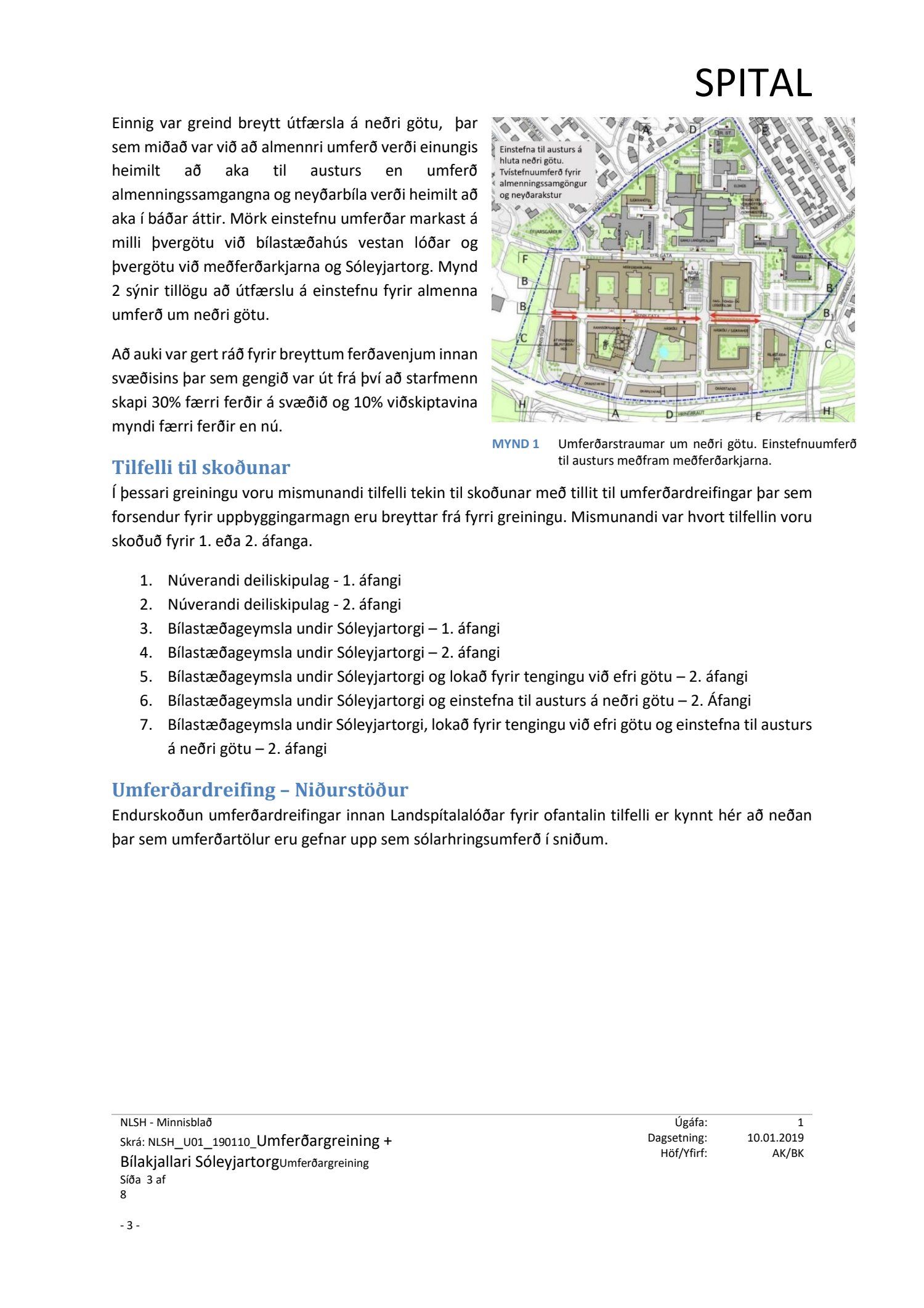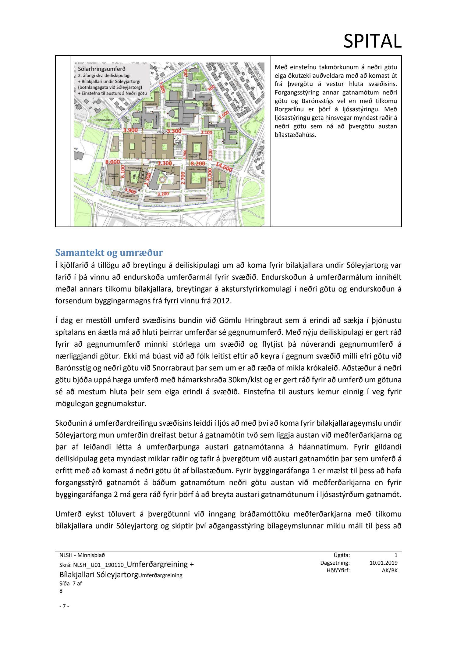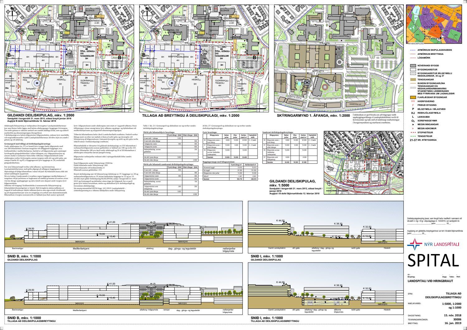 dags. 19. nóvember 2018 varðandi breytingu á deiliskipulagi Nýs Landspítala við Hringbraut. Í breytingunni felst að koma fyrir tveggja hæða bílgeymslu undir aðaltorgi/Sóleyjartorgi, sem fær nr. 37. Aðkoma í bílgeymslu verður frá þvergötu austan torgsins milli efri og neðri götu. Breytt er aðkomu við inngang í bráðamóttöku og bílastæðafyrirkomulagi á sunnanverðu Sóleyjartorgi og bílastæðum þar fækkað. Jafnframt er fækkað bílastæðum í bílgeymslu neðanjarðar á reit 35 sunnan geðdeildar o.fl., samkvæmt uppdr. SPITAL dags. 15. nóvember 2018 br. 16. janúar 2019. Einnig er lagt fram minnisblað SPITAL dags. 10. janúar 2019.