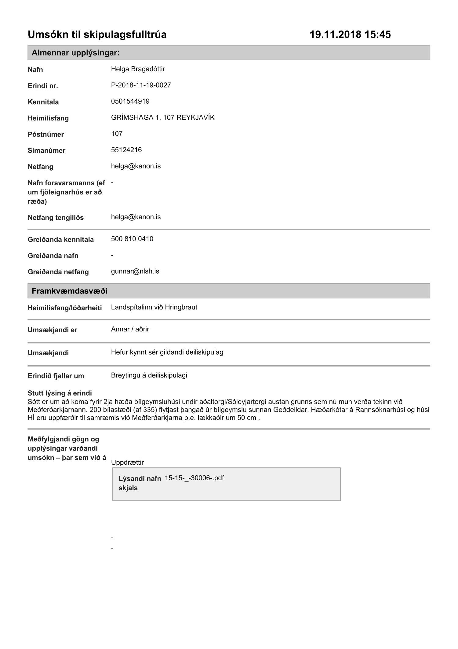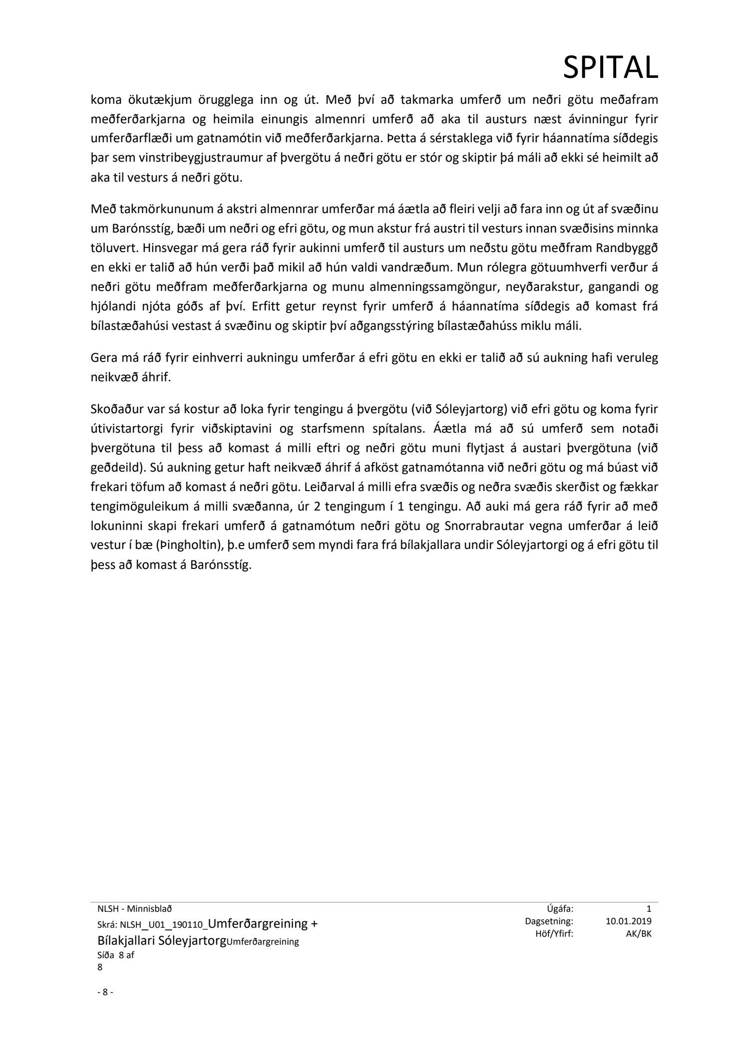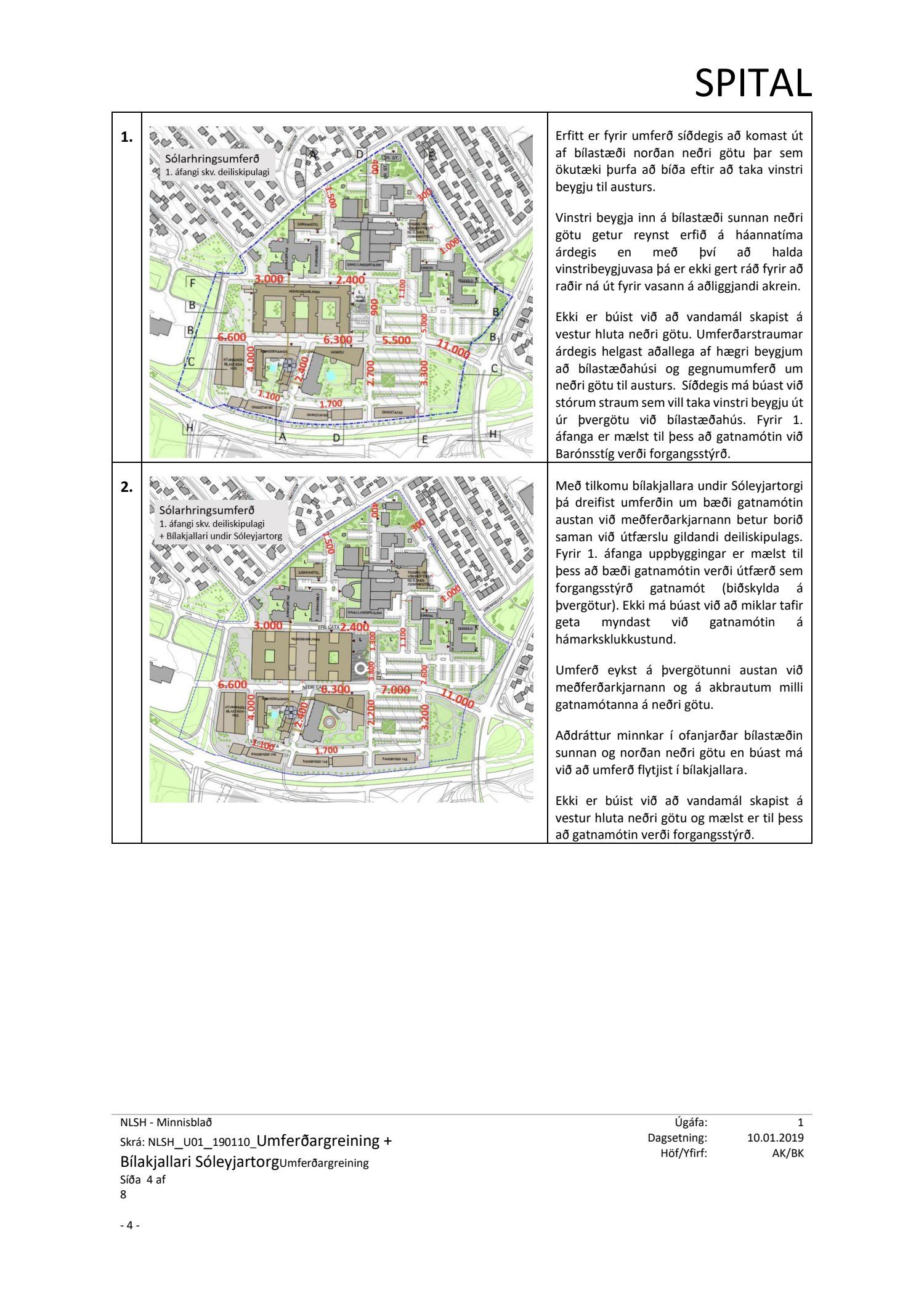 dags. 19. nóvember 2018 varðandi breytingu á deiliskipulagi Nýs Landspítala við Hringbraut. Í breytingunni felst að koma fyrir tveggja hæða bílgeymslu undir aðaltorgi/Sóleyjartorgi, sem fær nr. 37. Aðkoma í bílgeymslu verður frá þvergötu austan torgsins milli efri og neðri götu. Breytt er aðkomu við inngang í bráðamóttöku og bílastæðafyrirkomulagi á sunnanverðu Sóleyjartorgi og bílastæðum þar fækkað. Jafnframt er fækkað bílastæðum í bílgeymslu neðanjarðar á reit 35 sunnan geðdeildar o.fl., samkvæmt uppdr. SPITAL dags. 15. nóvember 2018 br. 16. janúar 2019. Einnig er lagt fram minnisblað SPITAL dags. 10. janúar 2019.