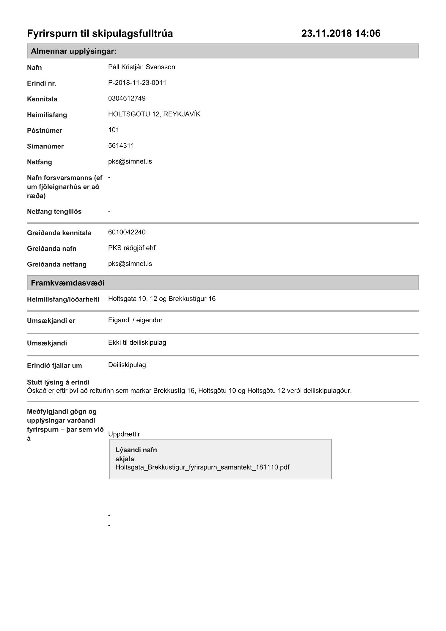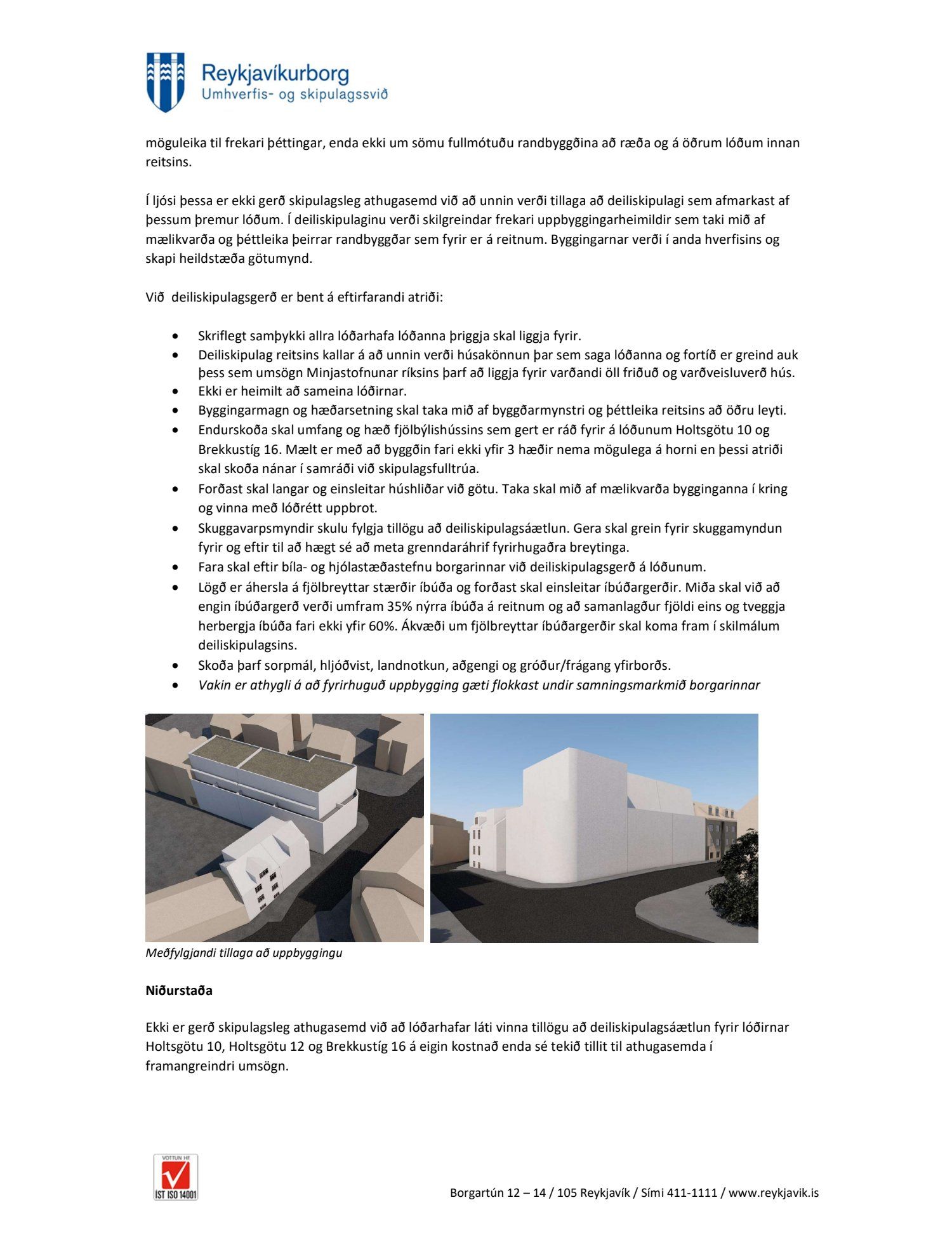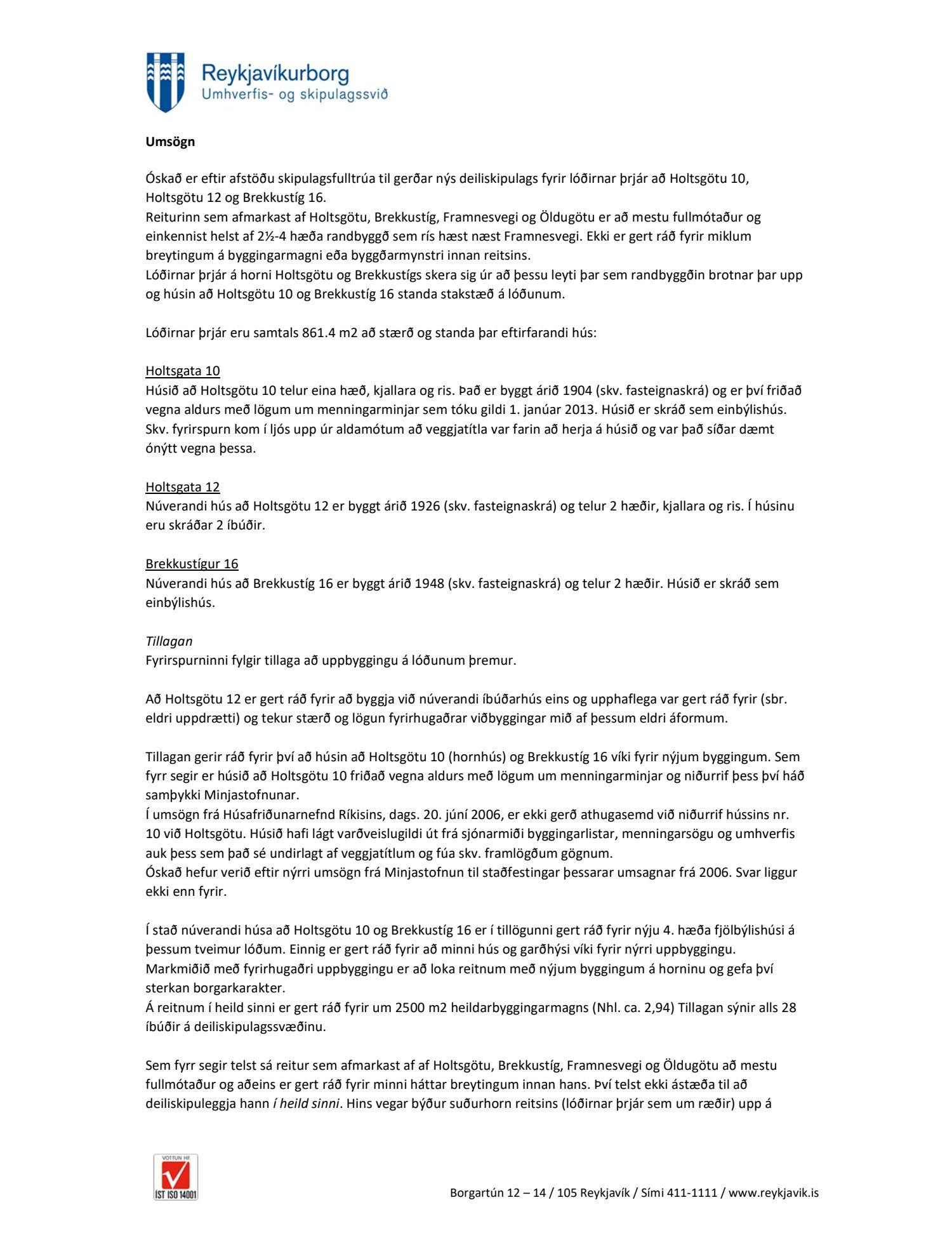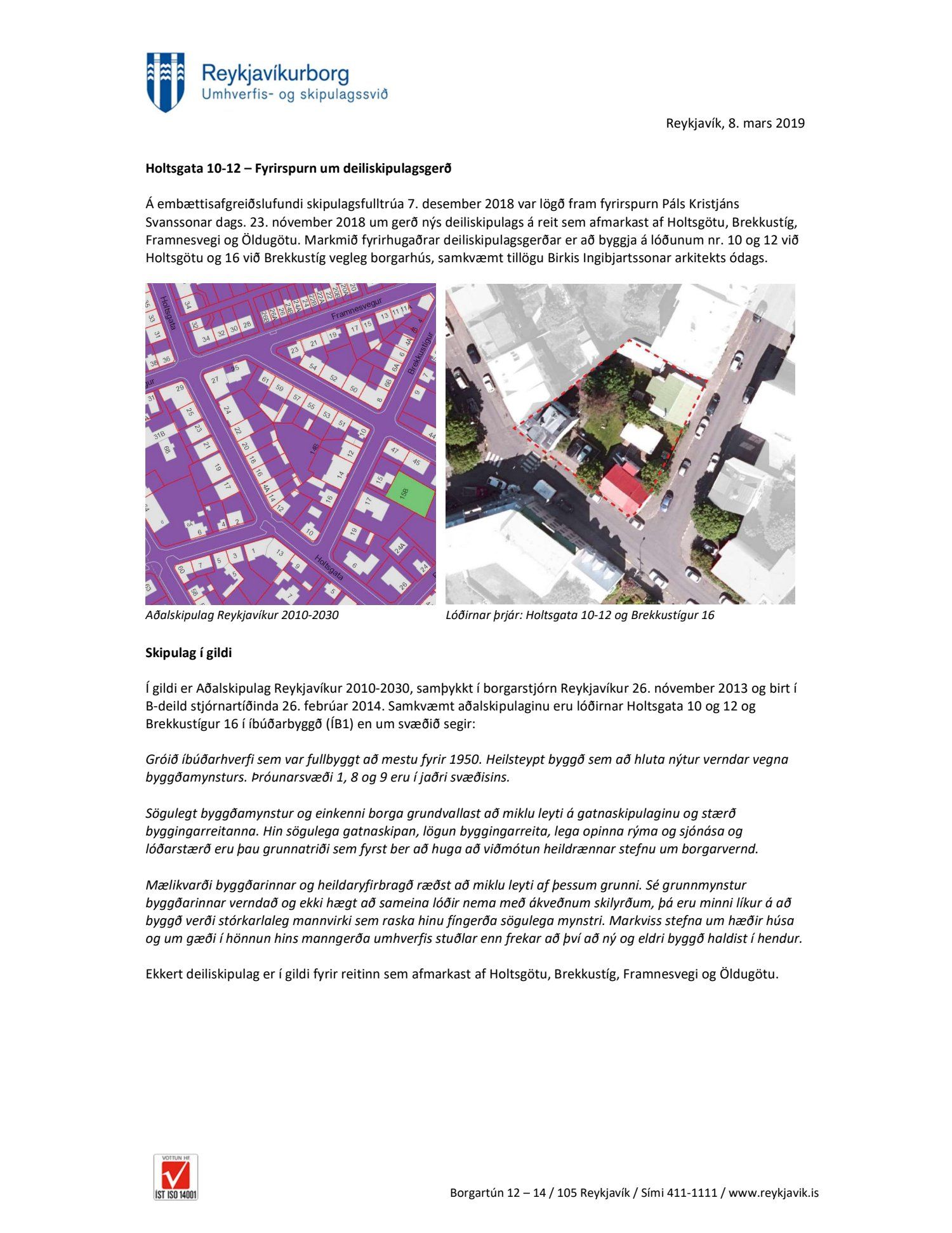Lögð fram fyrirspurn Páls Kristjáns Svanssonar dags. 23. nóvember 2018 um gerð nýs deiliskipulags á reit sem afmarkast af Holtsgötu, Brekkustíg, Framnesvegi og Öldugötu. Markmið fyrirhugaðrar deiliskipulagsgerðar er að byggja á lóðunum nr. 10 og 12 við Holtsgötu og 16 við Brekkustíg vegleg borgarhús, samkvæmt tillögu Birkis Ingibjartssonar arkitekts ódags. Einnig er lögð fram umsögn skipulagsfulltrúa dags. 8. mars 2019.