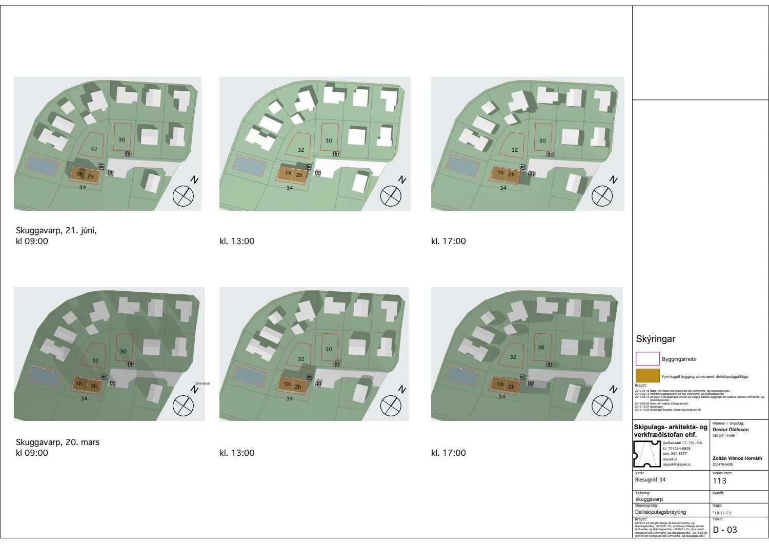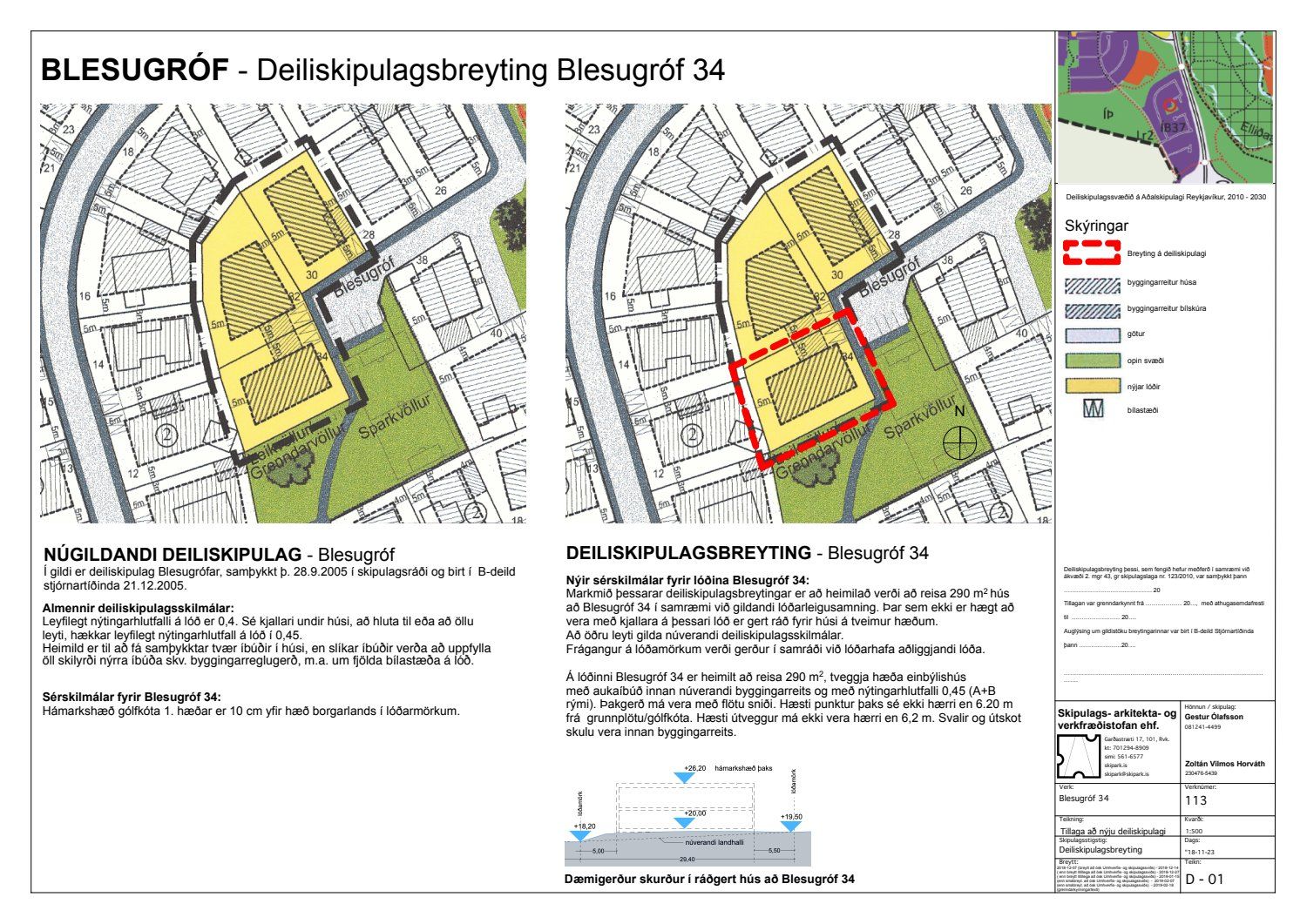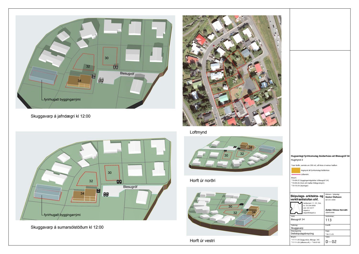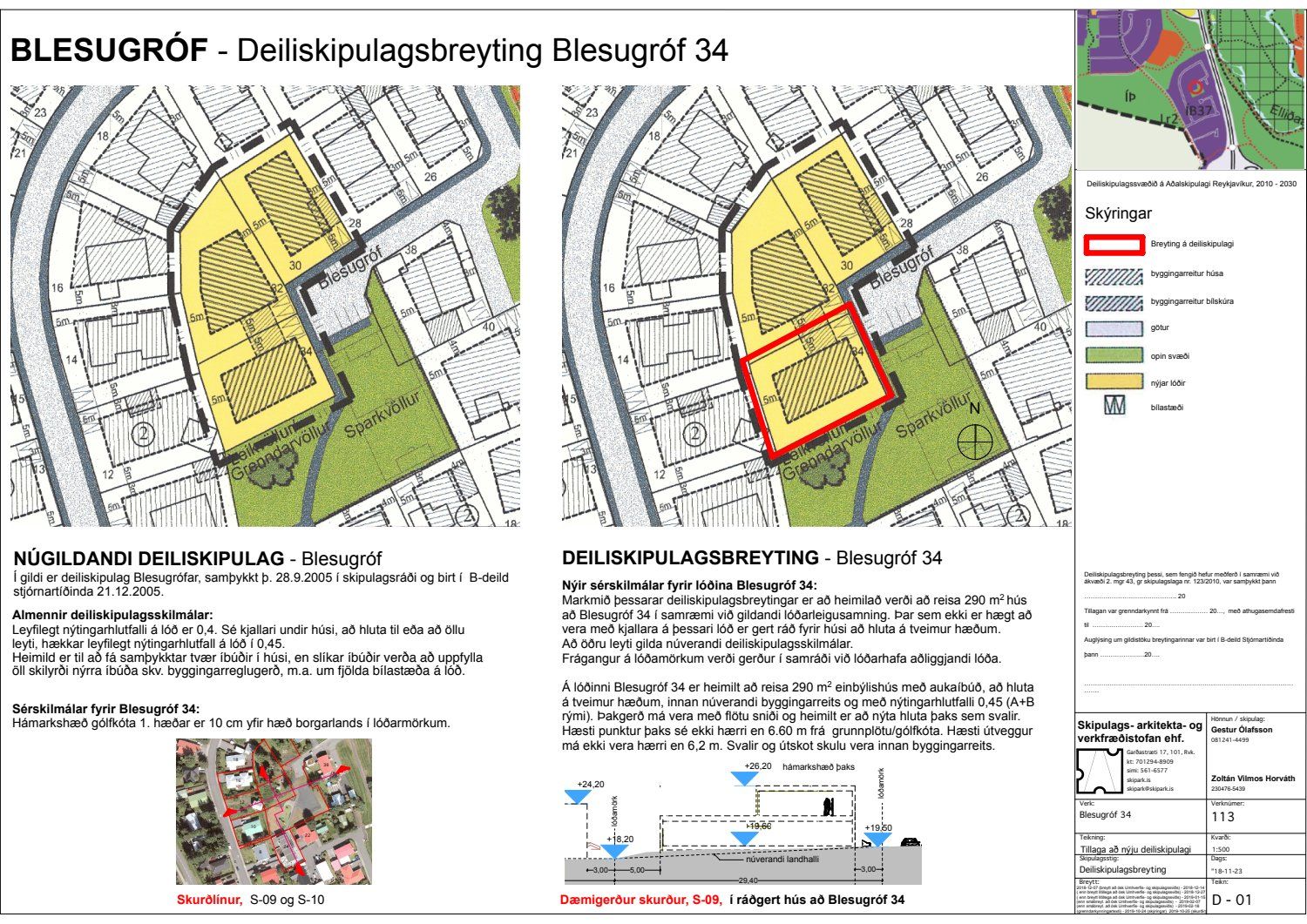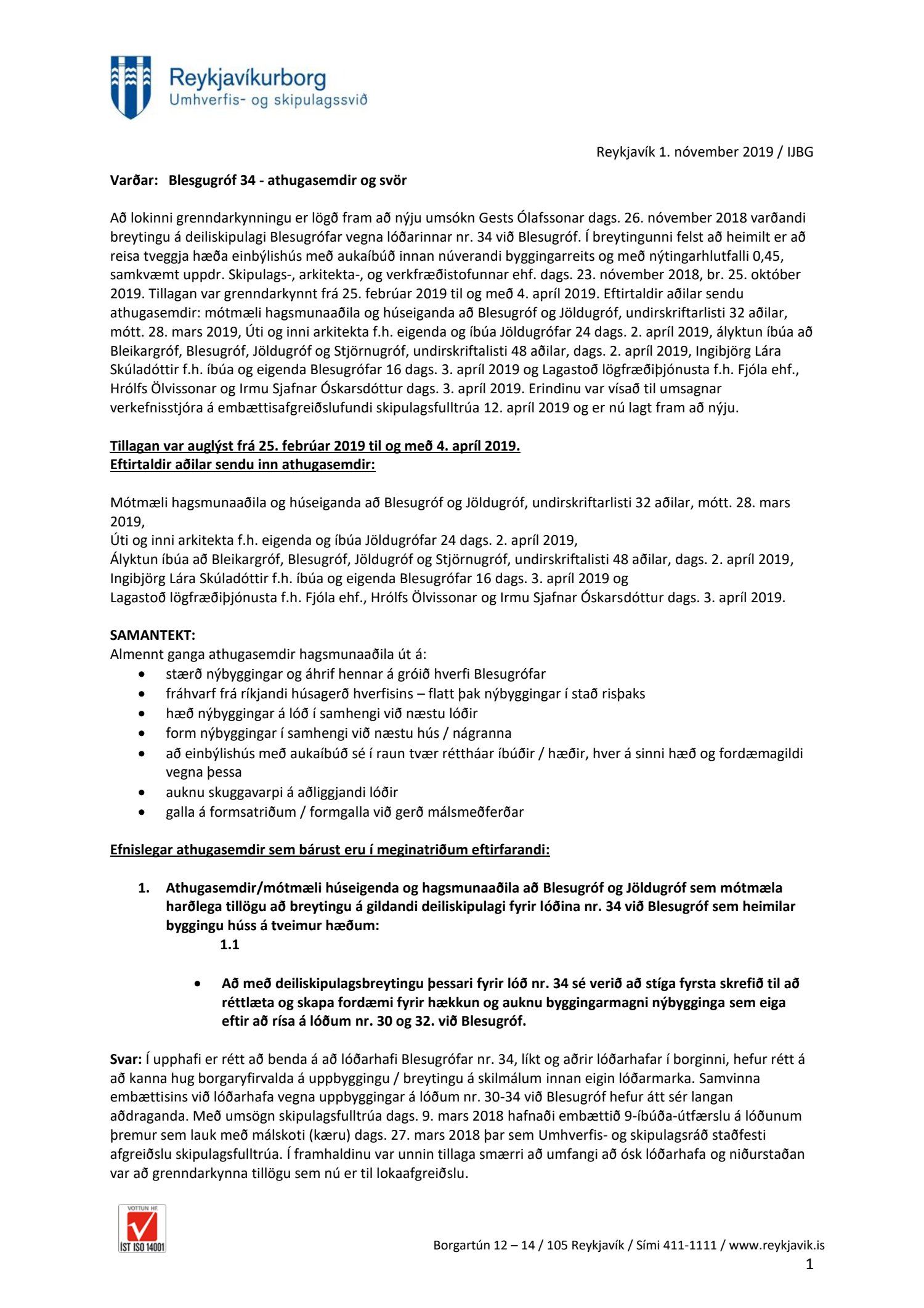 Að lokinni grenndarkynningu er lögð fram að nýju umsókn Gests Ólafssonar dags. 26. nóvember 2018 varðandi breytingu á deiliskipulagi Blesugrófar vegna lóðarinnar nr. 34 við Blesugróf. Í breytingunni felst að heimilt er að reisa tveggja hæða einbýlishús með aukaíbúð innan núverandi byggingarreits og með nýtingarhlutfalli 0,45, samkvæmt uppdr. Skipulags-, arkitekta-, og verkfræðistofunnar ehf. dags. 23. nóvember 2018, síðast br. 25. október 2019. Tillagan var grenndarkynnt frá 25. febrúar 2019 til og með 4. apríl 2019. Eftirtaldir aðilar sendu athugasemdir: mótmæli hagsmunaaðila og húseiganda að Blesugróf og Jöldugróf, undirskriftarlisti 32 aðilar, mótt. 28. mars 2019, Úti og inni arkitekta f.h. eigenda og íbúa Jöldugrófar 24 dags. 2. apríl 2019, ályktun íbúa að Bleikargróf, Blesugróf, Jöldugróf og Stjörnugróf, undirskriftalisti 48 aðilar, dags. 2. apríl 2019, Ingibjörg Lára Skúladóttir f.h. íbúa og eigenda Blesugrófar 16 dags. 3. apríl 2019 og Lagastoð lögfræðiþjónusta f.h. Fjóla ehf., Hrólfs Ölvissonar og Irmu Sjafnar Óskarsdóttur dags. 3. apríl 2019. Einnig er lögð fram umsögn skipulagsfulltrúa dags. 1. nóvember 2019.