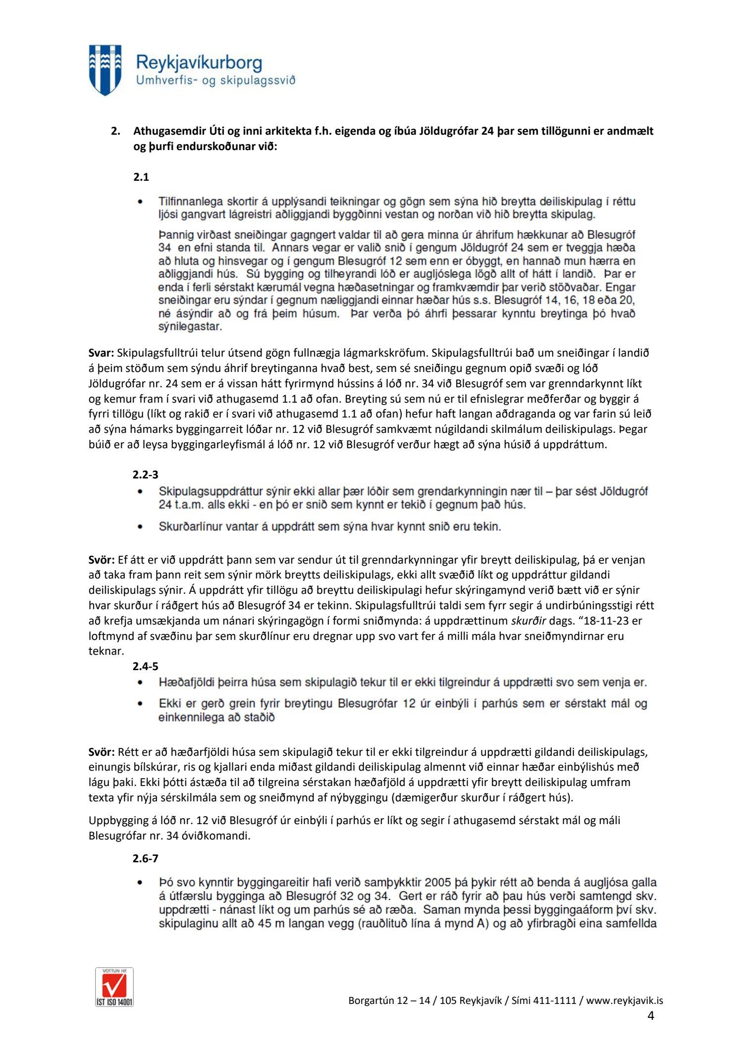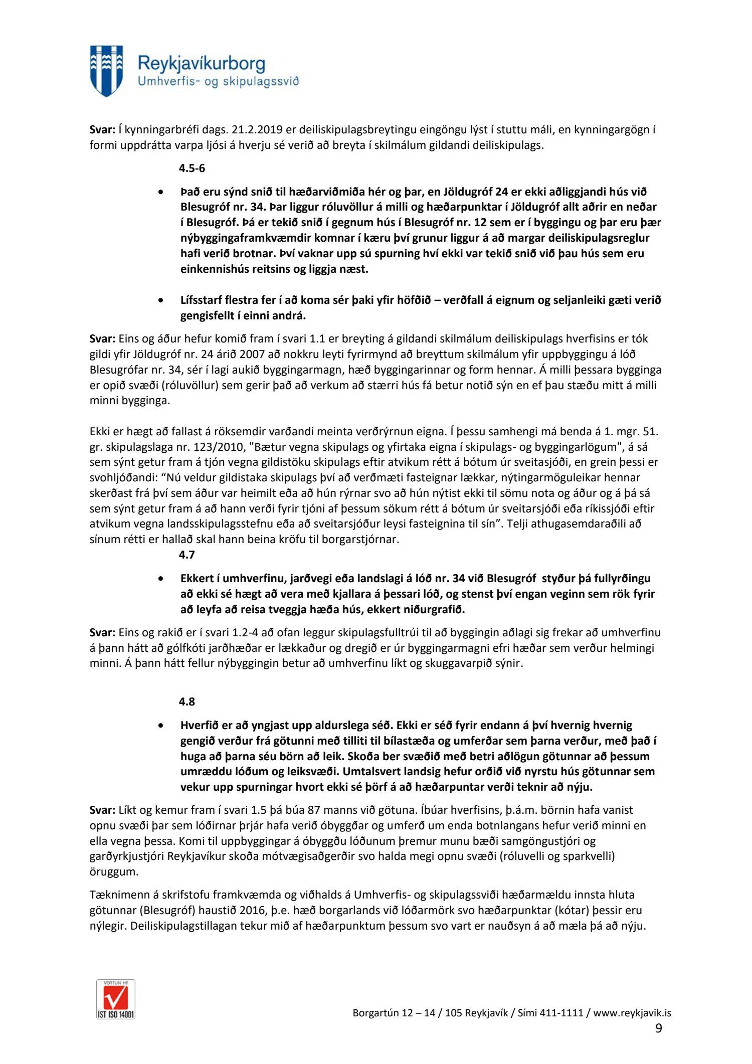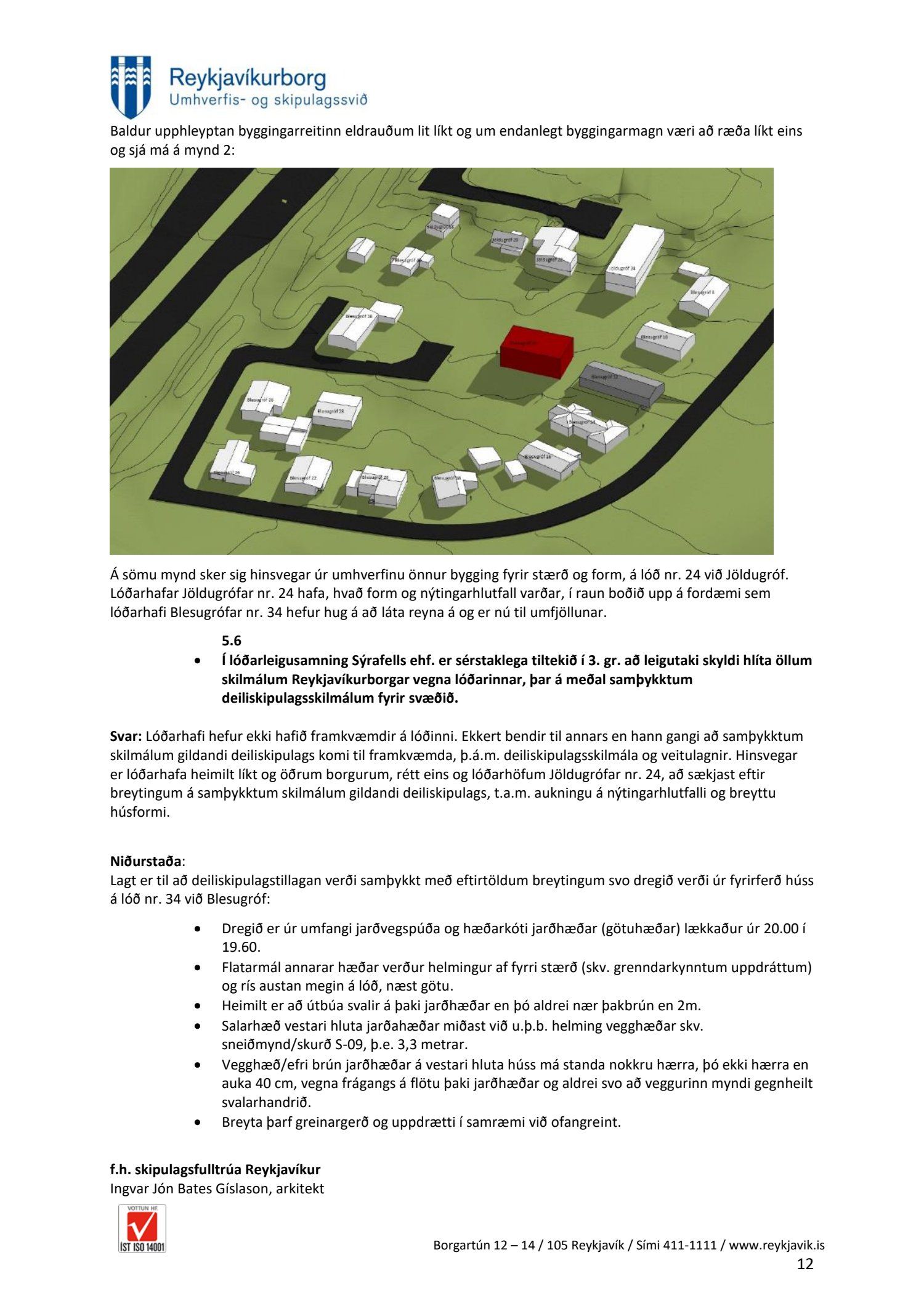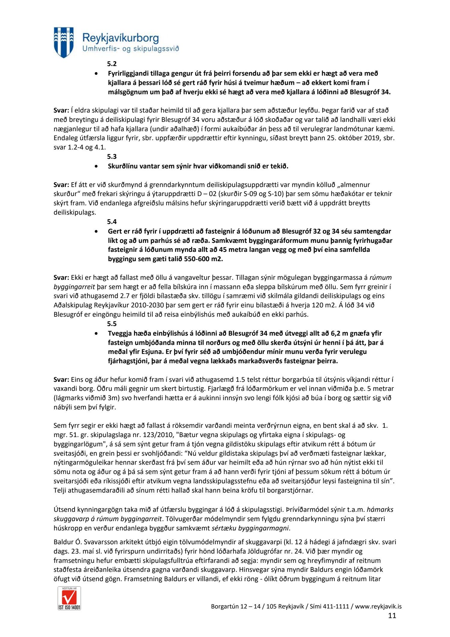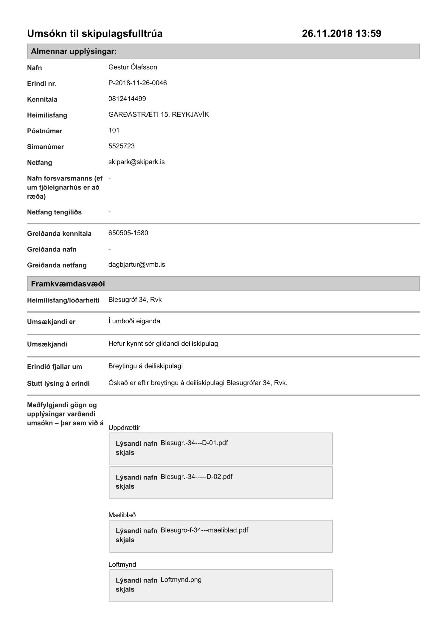 Að lokinni grenndarkynningu er lögð fram að nýju umsókn Gests Ólafssonar dags. 26. nóvember 2018 varðandi breytingu á deiliskipulagi Blesugrófar vegna lóðarinnar nr. 34 við Blesugróf. Í breytingunni felst að heimilt er að reisa tveggja hæða einbýlishús með aukaíbúð innan núverandi byggingarreits og með nýtingarhlutfalli 0,45, samkvæmt uppdr. Skipulags-, arkitekta-, og verkfræðistofunnar ehf. dags. 23. nóvember 2018, síðast br. 25. október 2019. Tillagan var grenndarkynnt frá 25. febrúar 2019 til og með 4. apríl 2019. Eftirtaldir aðilar sendu athugasemdir: mótmæli hagsmunaaðila og húseiganda að Blesugróf og Jöldugróf, undirskriftarlisti 32 aðilar, mótt. 28. mars 2019, Úti og inni arkitekta f.h. eigenda og íbúa Jöldugrófar 24 dags. 2. apríl 2019, ályktun íbúa að Bleikargróf, Blesugróf, Jöldugróf og Stjörnugróf, undirskriftalisti 48 aðilar, dags. 2. apríl 2019, Ingibjörg Lára Skúladóttir f.h. íbúa og eigenda Blesugrófar 16 dags. 3. apríl 2019 og Lagastoð lögfræðiþjónusta f.h. Fjóla ehf., Hrólfs Ölvissonar og Irmu Sjafnar Óskarsdóttur dags. 3. apríl 2019. Einnig er lögð fram umsögn skipulagsfulltrúa dags. 1. nóvember 2019.