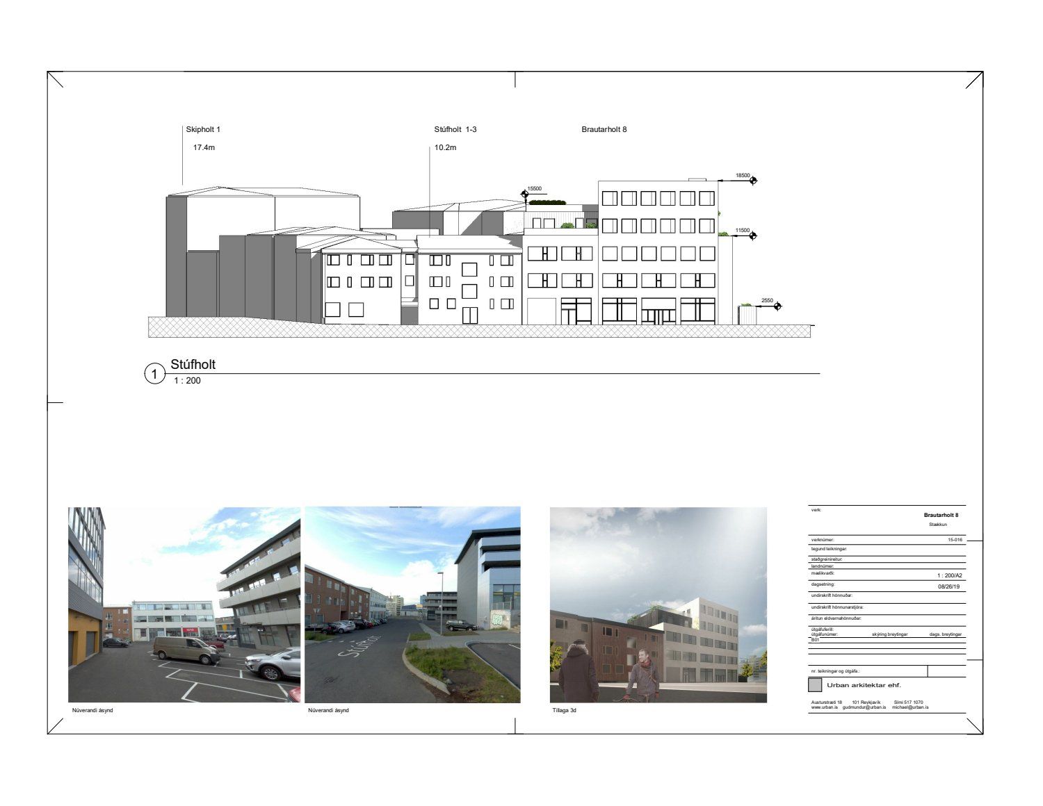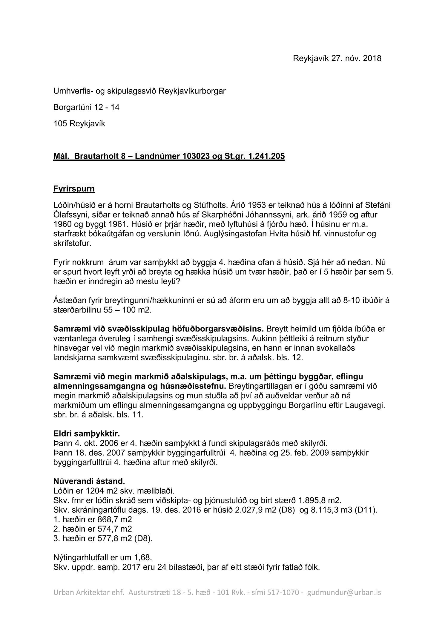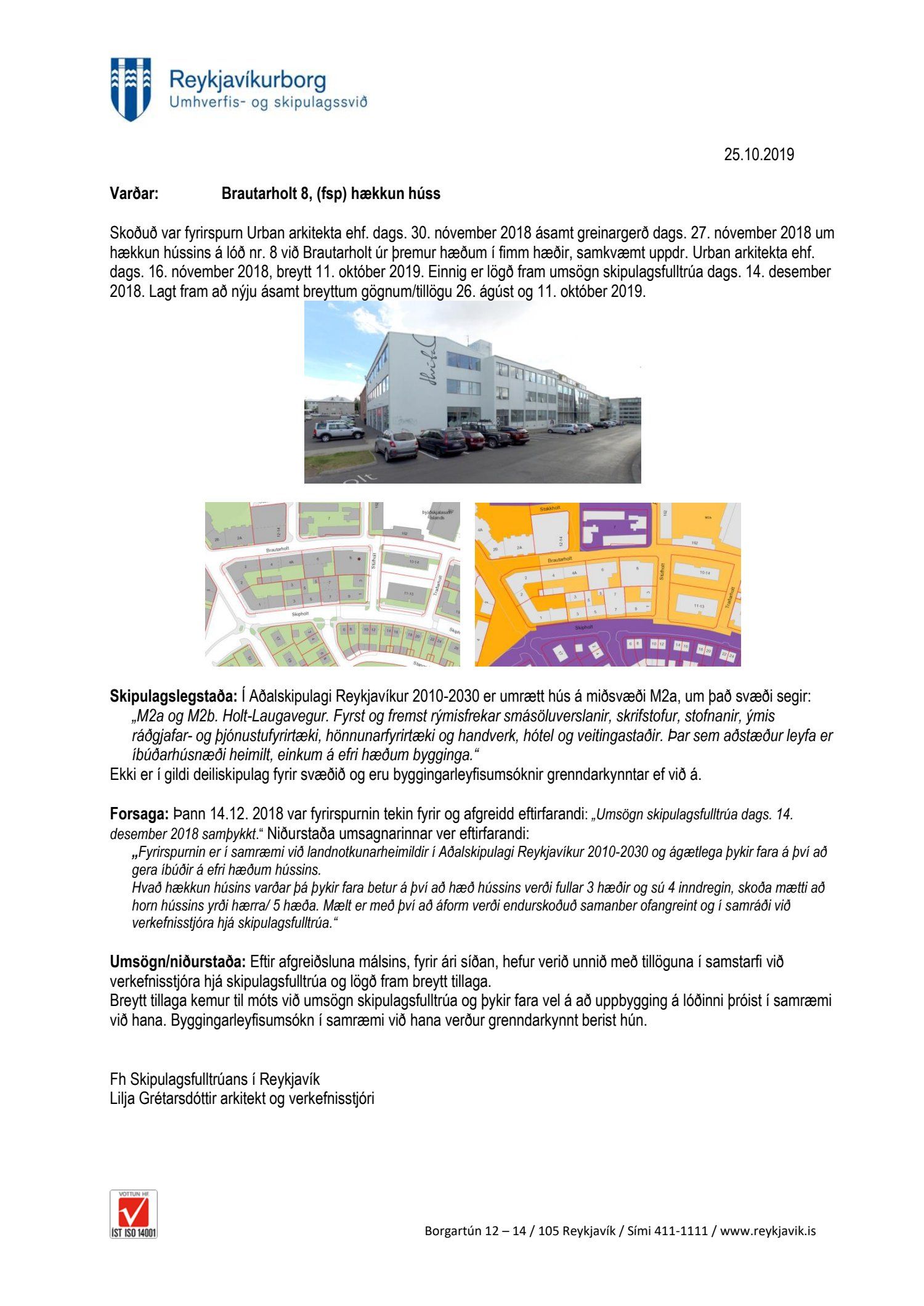 Lögð fram fyrirspurn Urban arkitekta ehf. dags. 30. nóvember 2018 ásamt greinargerð dags. 27. nóvember 2018 um hækkun hússins á lóð nr. 8 við Brautarholt úr þremur hæðum í fimm hæðir, samkvæmt uppdr. Urban arkitekta ehf. dags. 16. nóvember 2018, breytt 11. október 2019. Einnig er lögð fram umsögn skipulagsfulltrúa dags. 14. desember 2018. Lagt fram að nýju ásamt breyttum gögnum/tillögu 26. ágúst /11. október 2019, greinargerð dags. 21. október 2019 og umsögn skipulagsfulltrúa dags 25. október 2019.