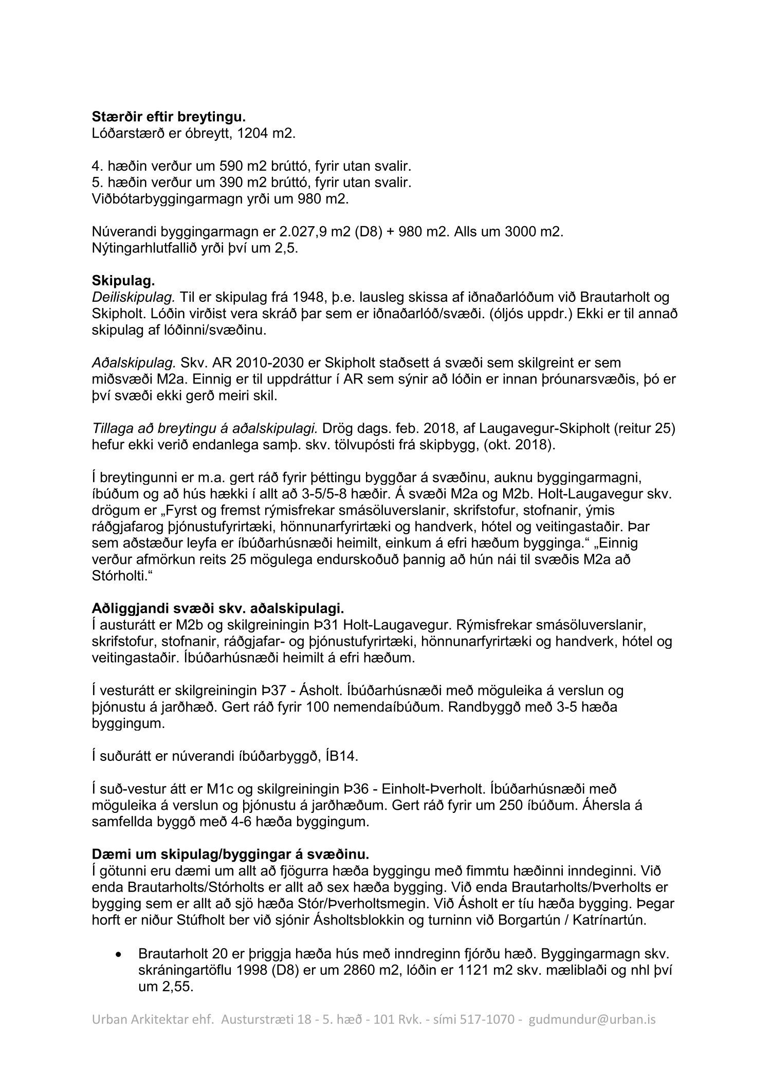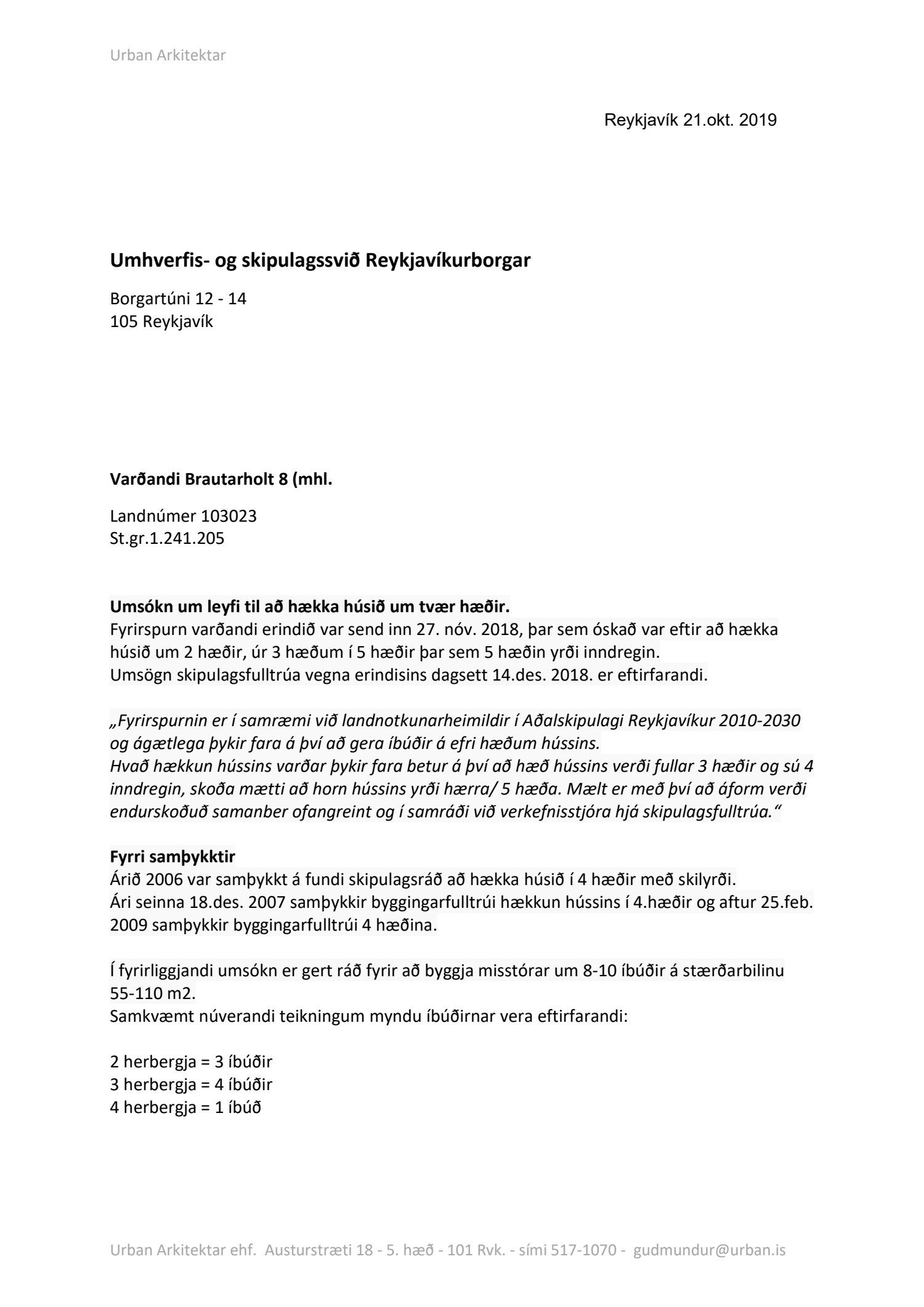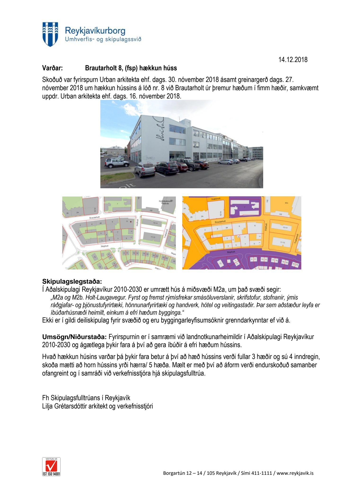 Lögð fram fyrirspurn Urban arkitekta ehf. dags. 30. nóvember 2018 ásamt greinargerð dags. 27. nóvember 2018 um hækkun hússins á lóð nr. 8 við Brautarholt úr þremur hæðum í fimm hæðir, samkvæmt uppdr. Urban arkitekta ehf. dags. 16. nóvember 2018, breytt 11. október 2019. Einnig er lögð fram umsögn skipulagsfulltrúa dags. 14. desember 2018. Lagt fram að nýju ásamt breyttum gögnum/tillögu 26. ágúst /11. október 2019, greinargerð dags. 21. október 2019 og umsögn skipulagsfulltrúa dags 25. október 2019.