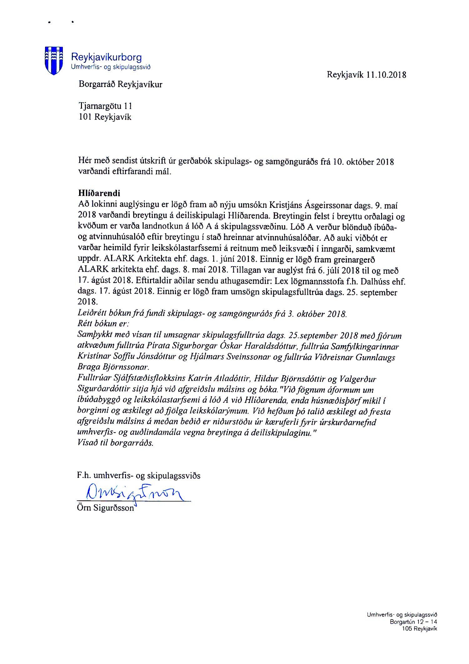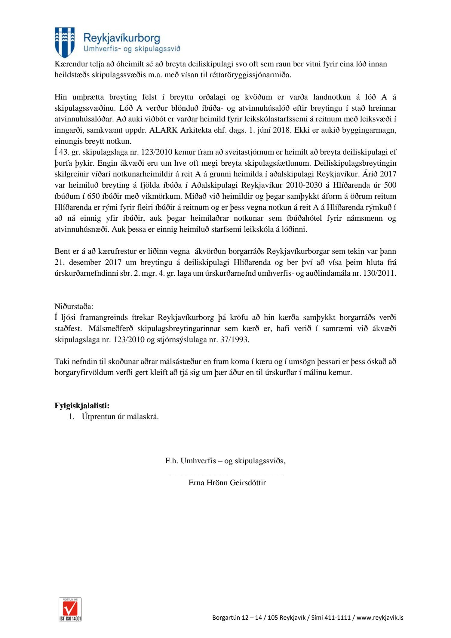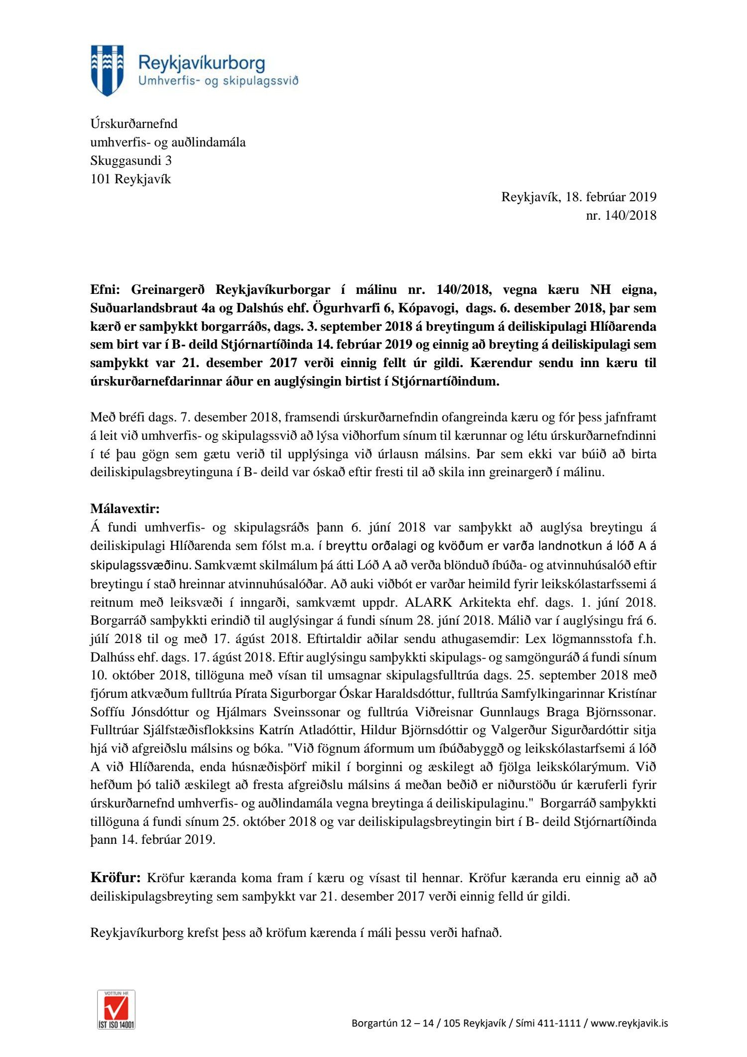 Lagt fram erindi úrskurðarnefndar umhverfis- og auðlindamála dags. 7. desember 2018 ásamt kæru dags. 6. desember 2018 þar sem kærð er ákvörðun borgarráðs frá 25. október 2018 um að samþykkja breytingu á deiliskipulagi Hlíðarenda. Einnig er lögð fram umsögn skrifstofu sviðsstjóra dags. 18. febrúar 2019.