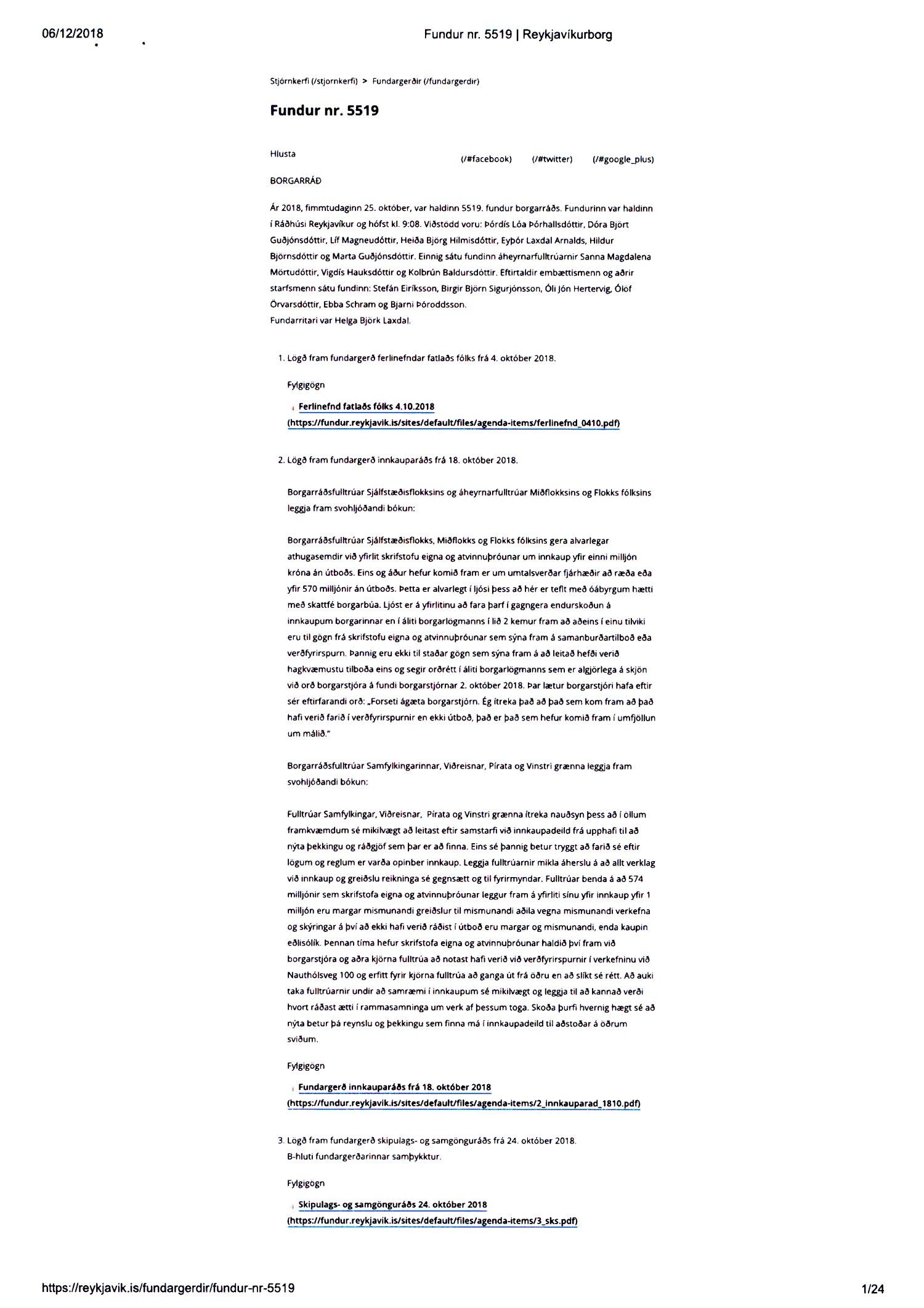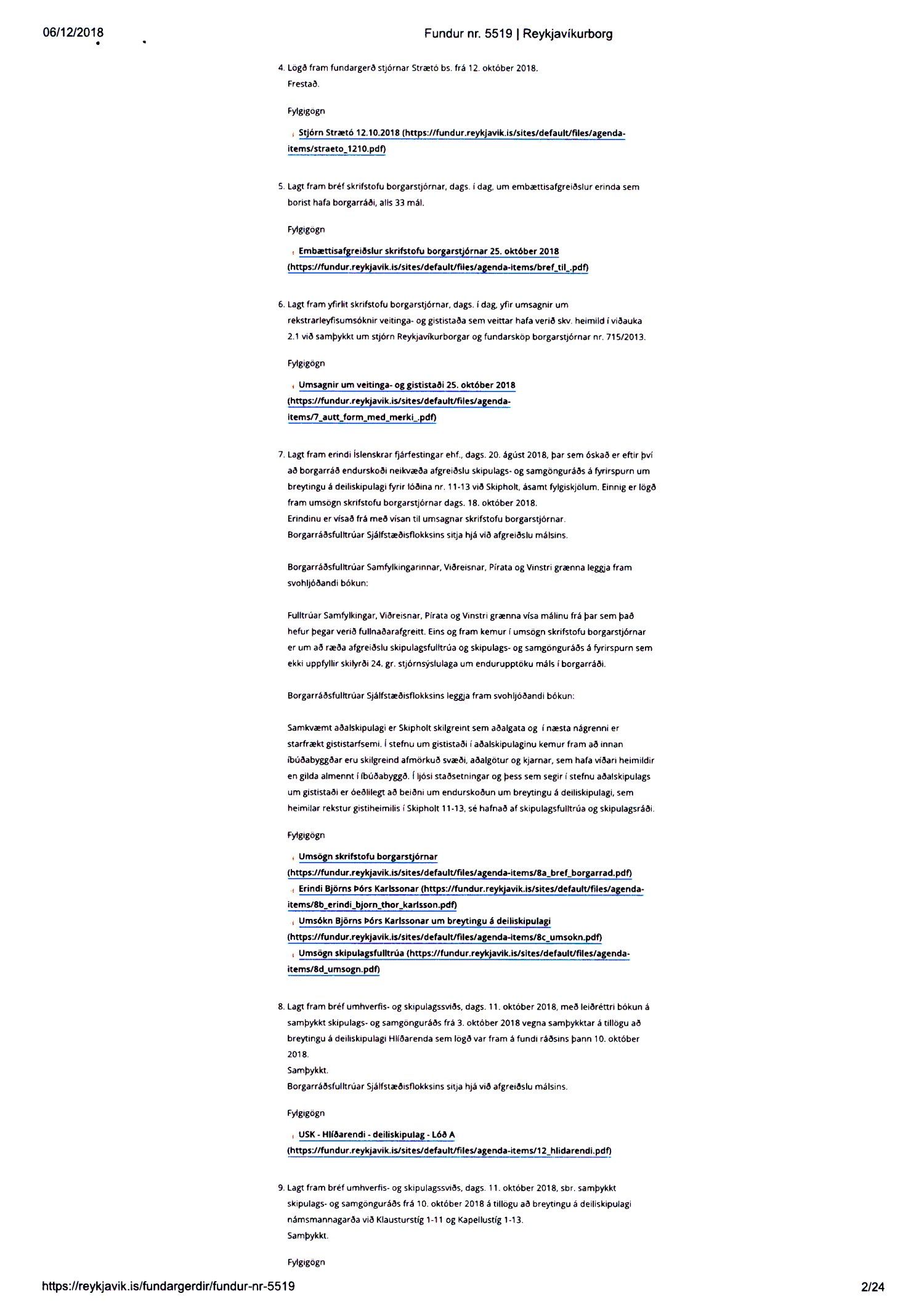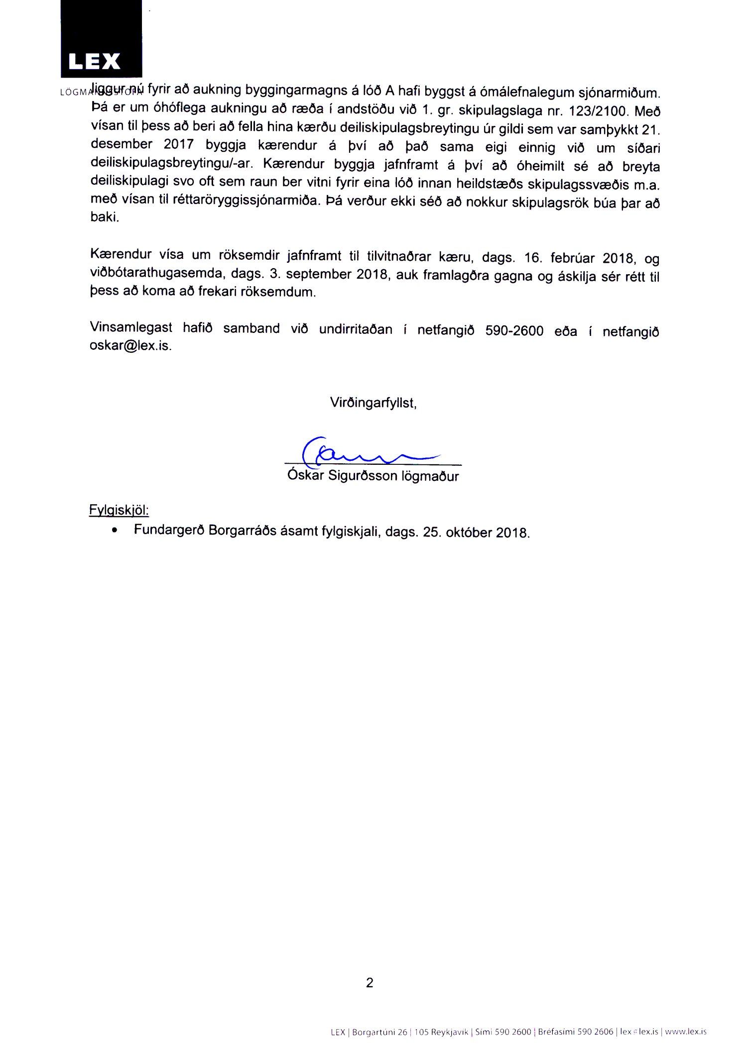Lagt fram erindi úrskurðarnefndar umhverfis- og auðlindamála dags. 7. desember 2018 ásamt kæru dags. 6. desember 2018 þar sem kærð er ákvörðun borgarráðs frá 25. október 2018 um að samþykkja breytingu á deiliskipulagi Hlíðarenda. Einnig er lögð fram umsögn skrifstofu sviðsstjóra dags. 18. febrúar 2019.
