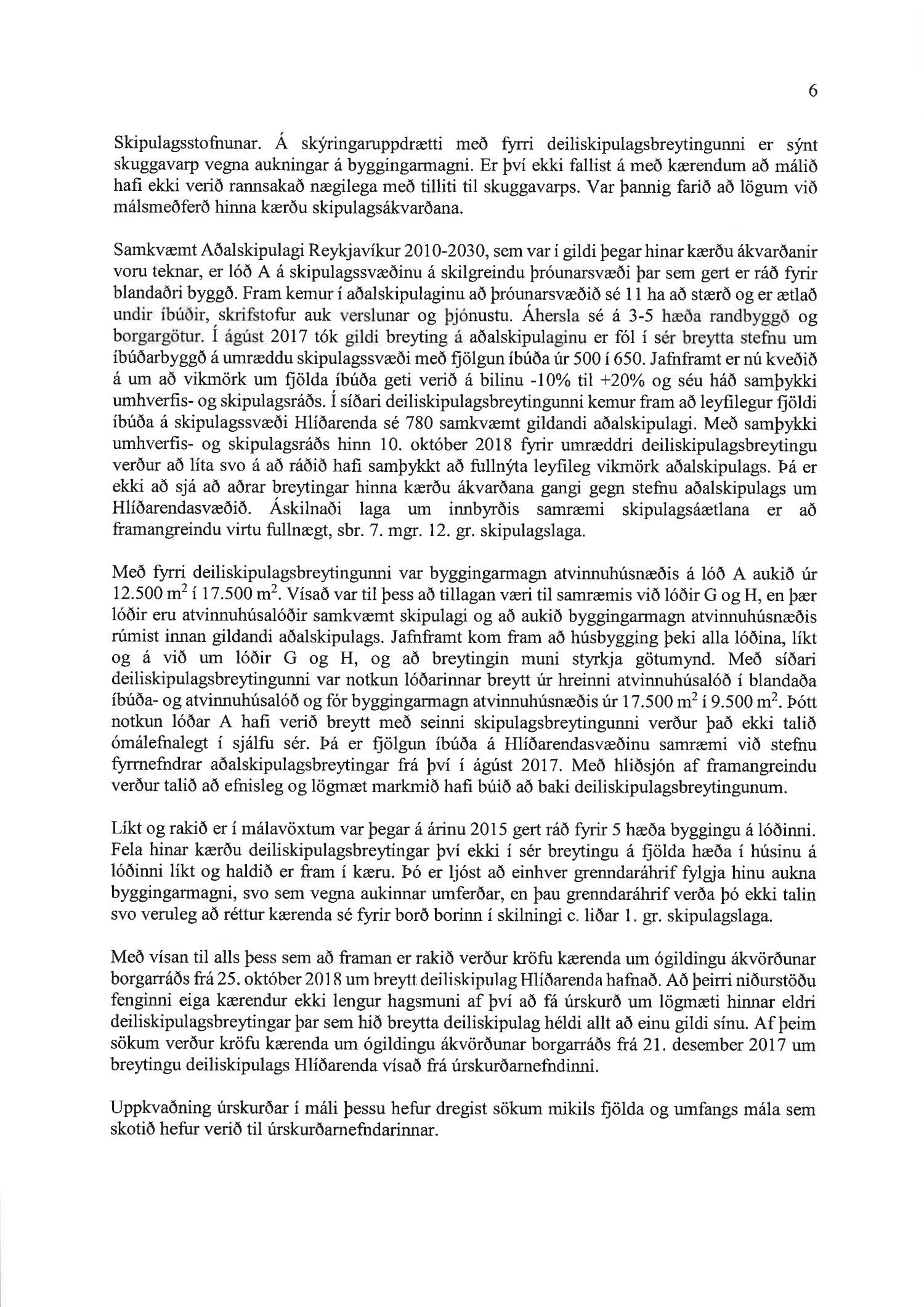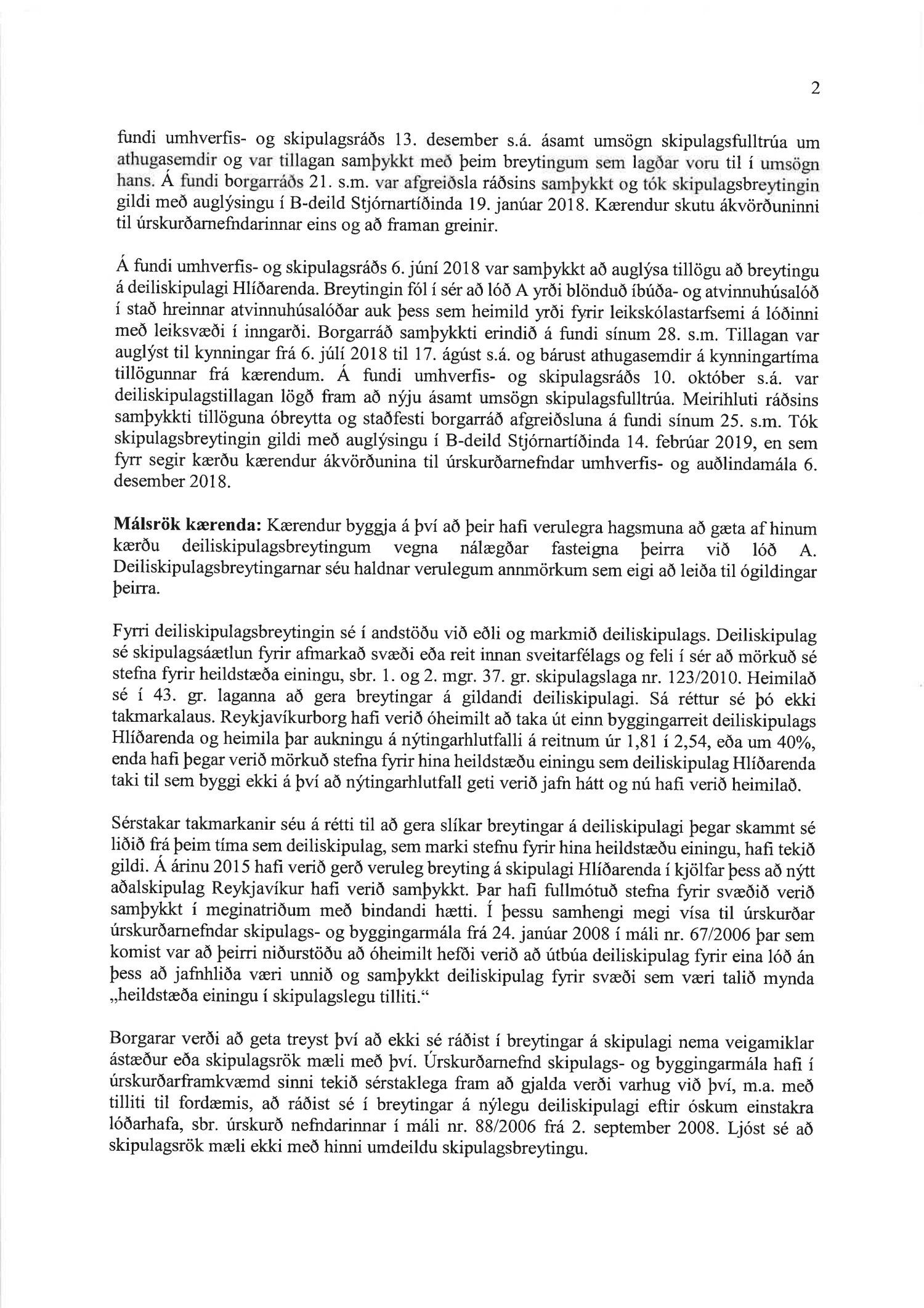 Úrskurðarorð: Hafnað er kröfu um ógildingu ákvörðunar borgarráðs Reykjavíkur frá 25. október 2018 um að samþykkja breytingu á deiliskipulagi Hlíðarenda vegna lóðar A.