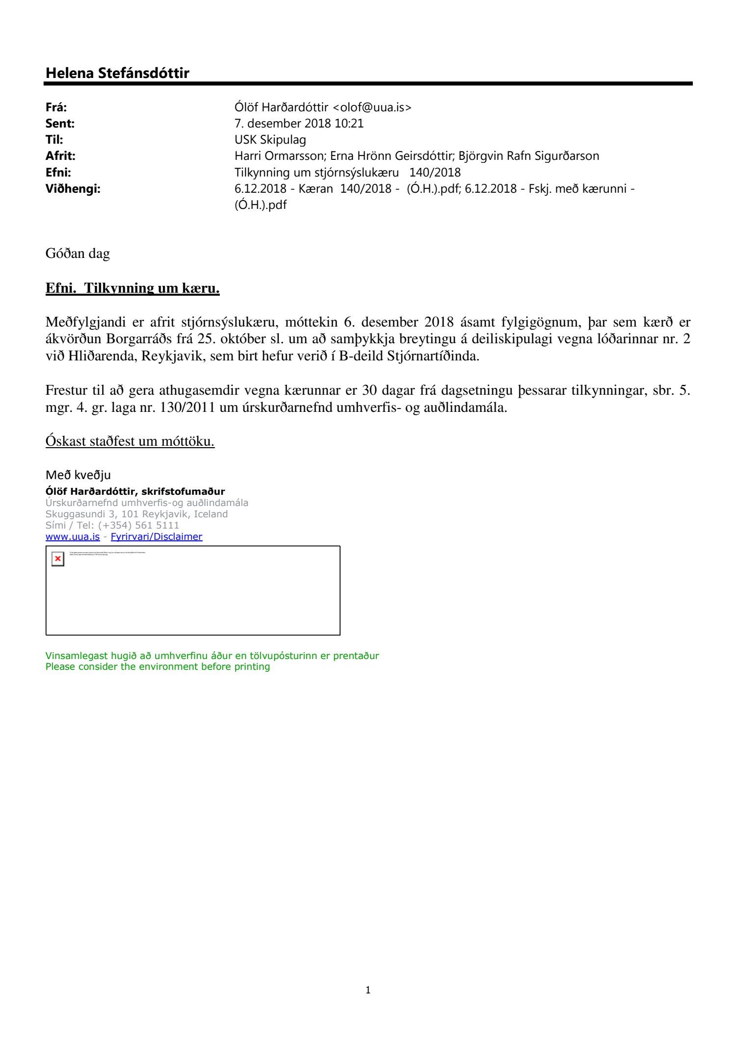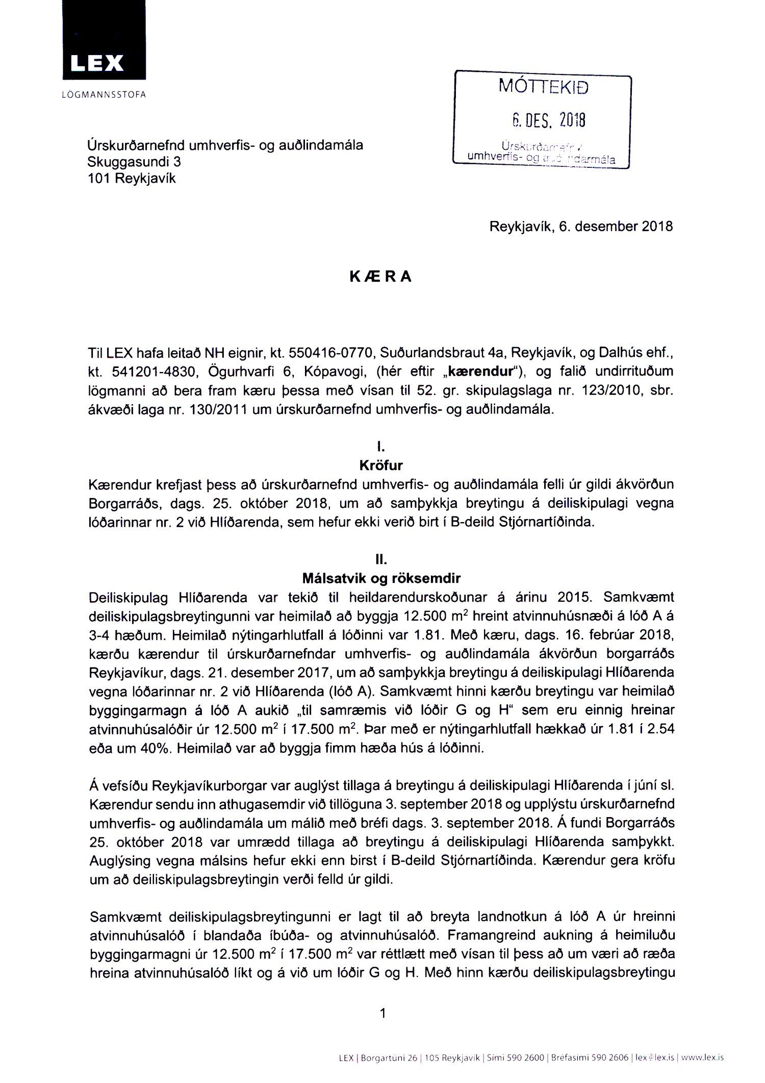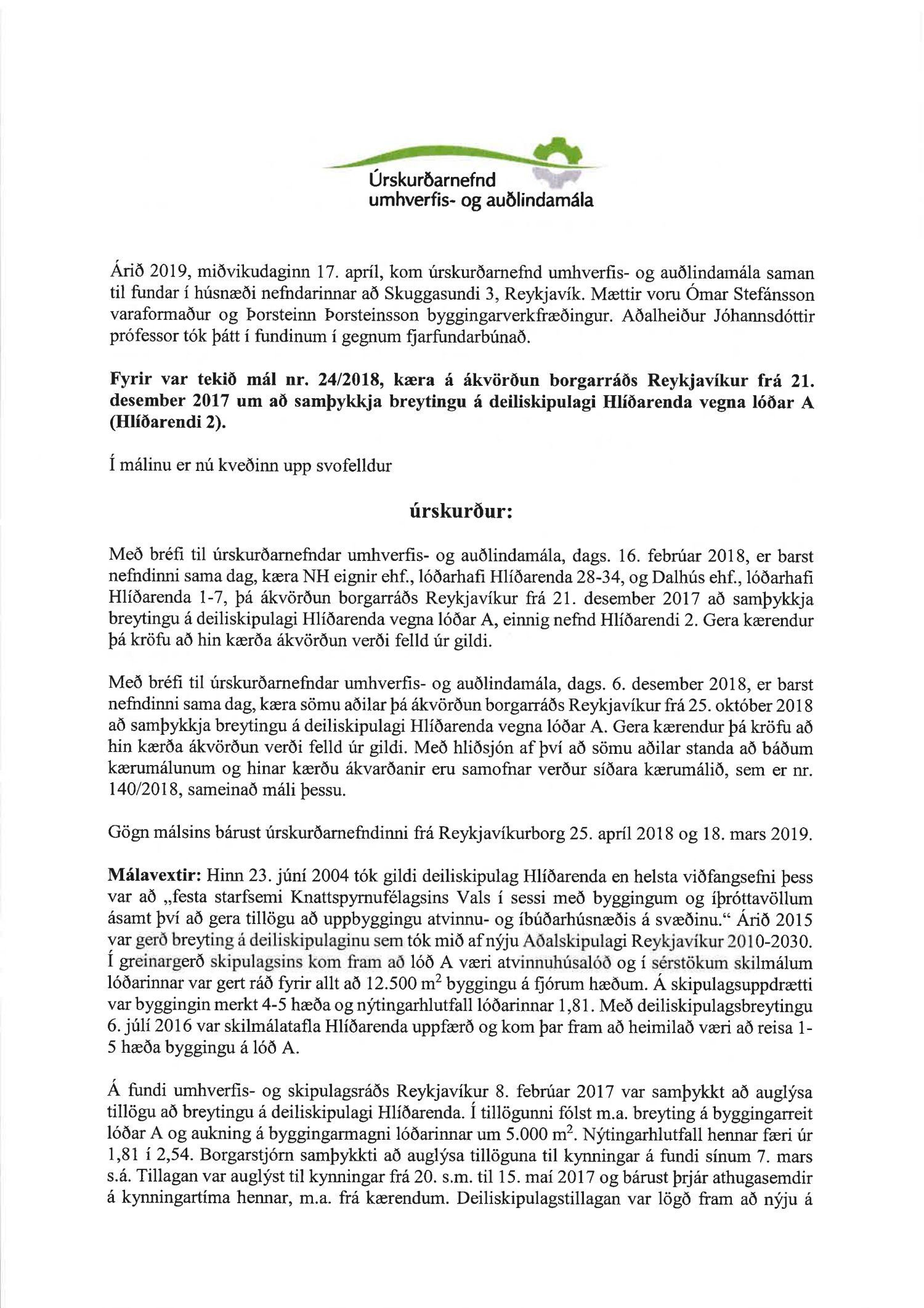 Lagt fram erindi úrskurðarnefndar umhverfis- og auðlindamála dags. 7. desember 2018 ásamt kæru dags. 6. desember 2018 þar sem kærð er ákvörðun borgarráðs frá 25. október 2018 um að samþykkja breytingu á deiliskipulagi Hlíðarenda. Einnig er lögð fram umsögn skrifstofu sviðsstjóra dags. 18. febrúar 2019. Jafnframt er lagður fram úrskurður úrskurðarnefndar umhverfis- og auðlindamála frá 17. apríl 2019.