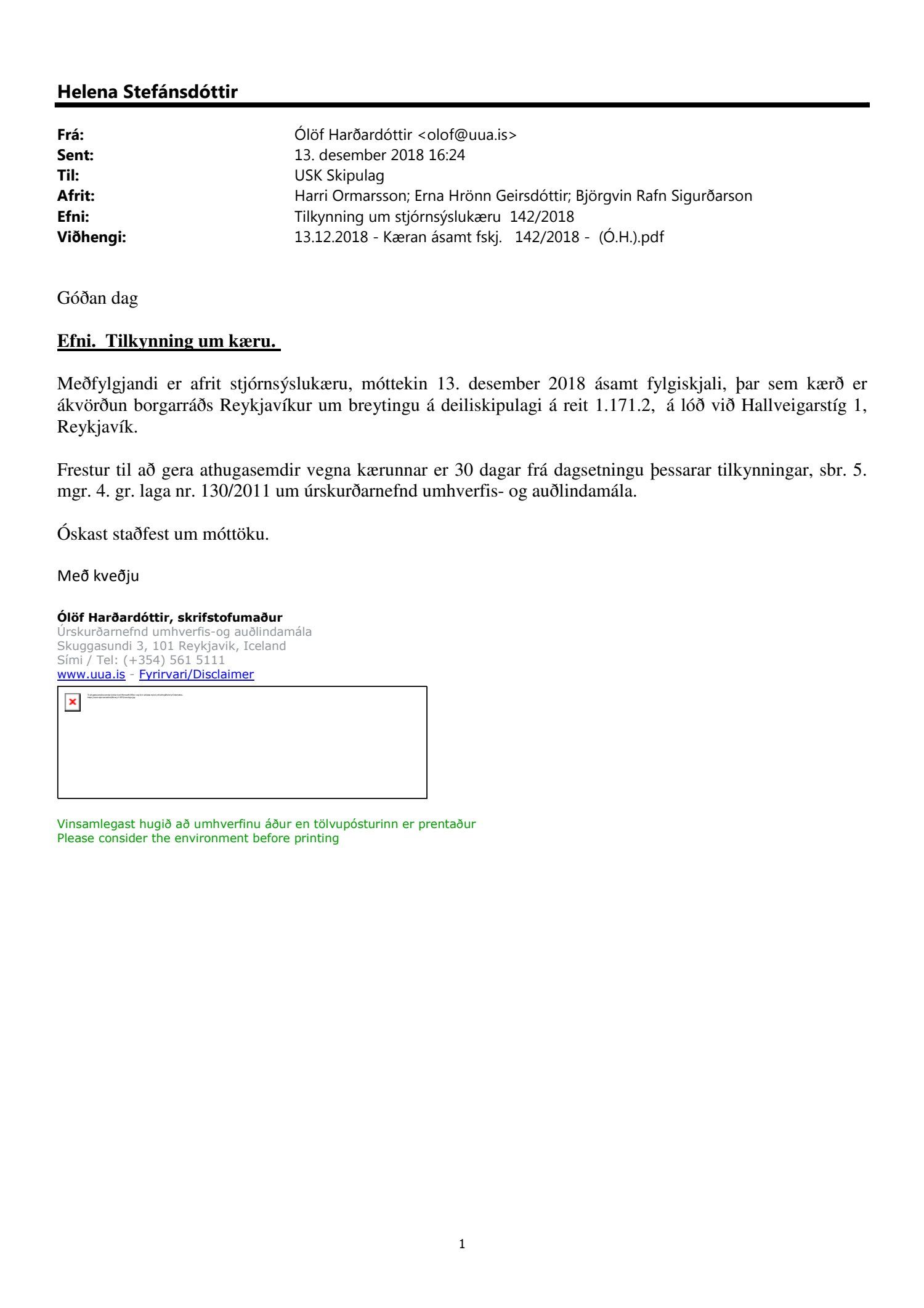 Lagt fram erindi úrskurðarnefndar umhverfis- og auðlindamála dags. 13. desember 2018 ásamt kæru mótt. 13. desember 2018 þar sem kærð er samþykkt borgarráðs frá 23. ágúst 2018 á breytingu á deiliskipulagi reits 1.171.2 vegna lóðarinnar nr. 1 við Hallveigarstíg.