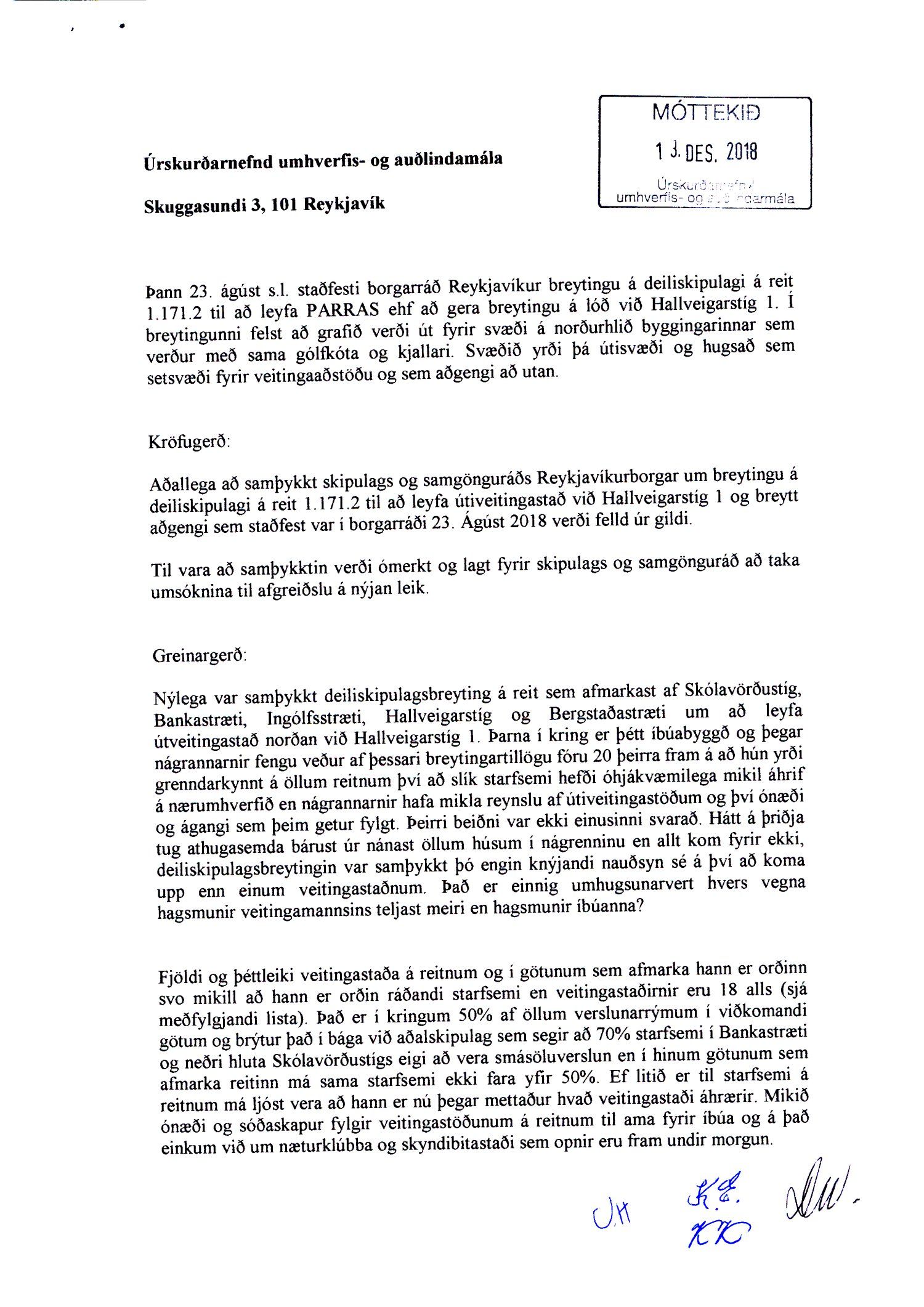 Lagt fram erindi úrskurðarnefndar umhverfis- og auðlindamála dags. 13. desember 2018 ásamt kæru mótt. 13. desember 2018 þar sem kærð er samþykkt borgarráðs frá 23. ágúst 2018 á breytingu á deiliskipulagi reits 1.171.2 vegna lóðarinnar nr. 1 við Hallveigarstíg. Einnig er lögð fram umsögn skrifstofu sviðsstjóra dags. 4. janúar 2019.