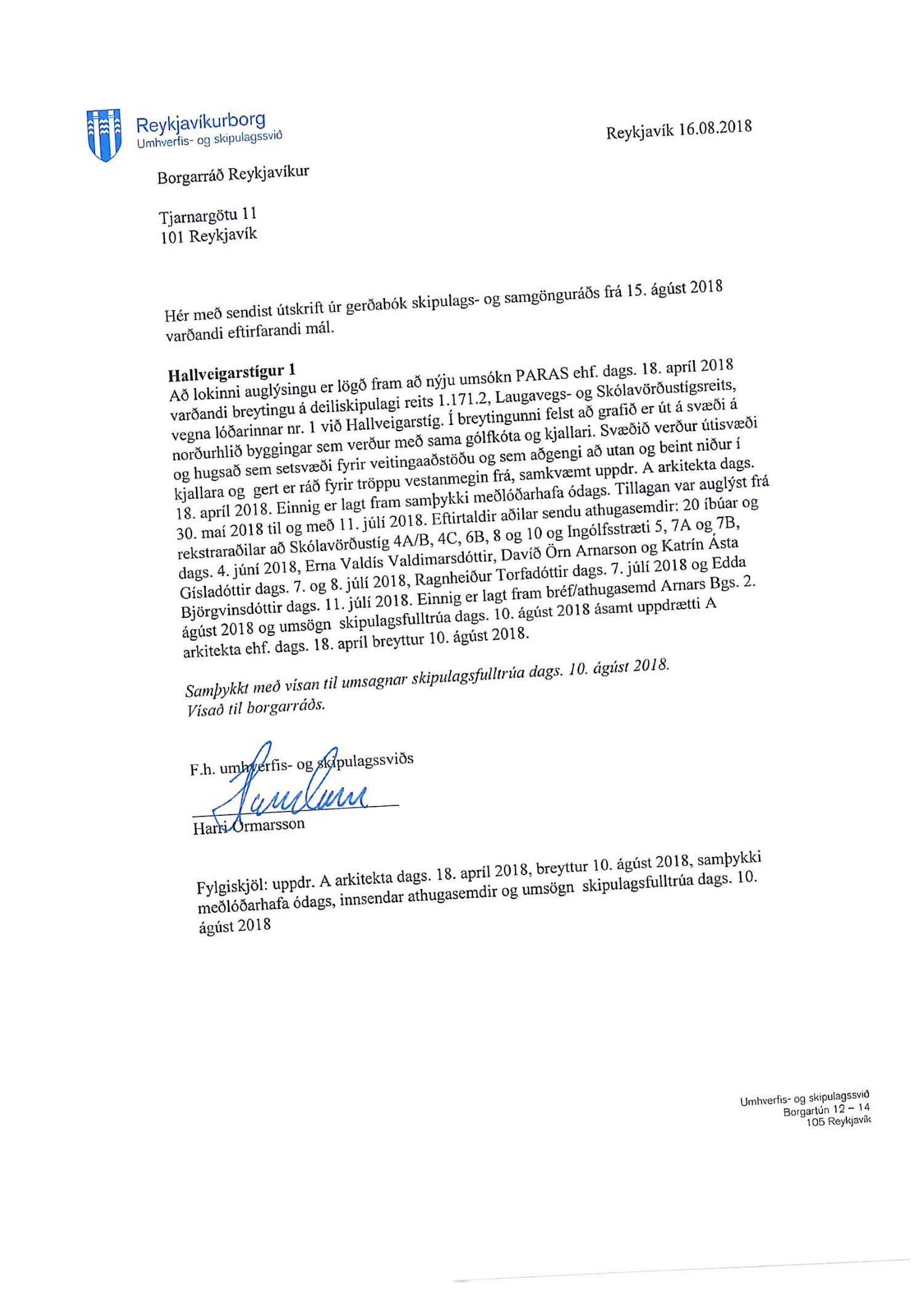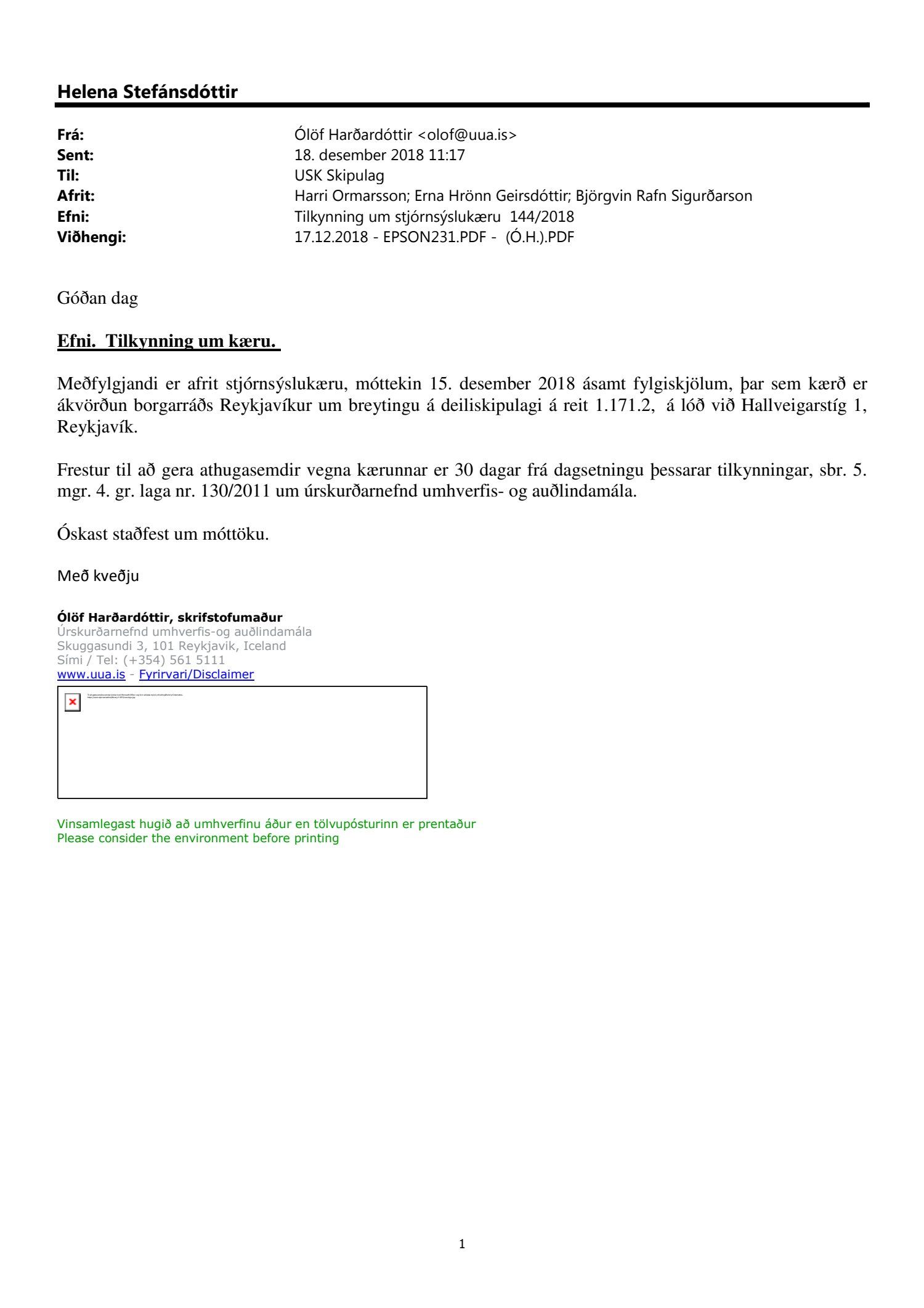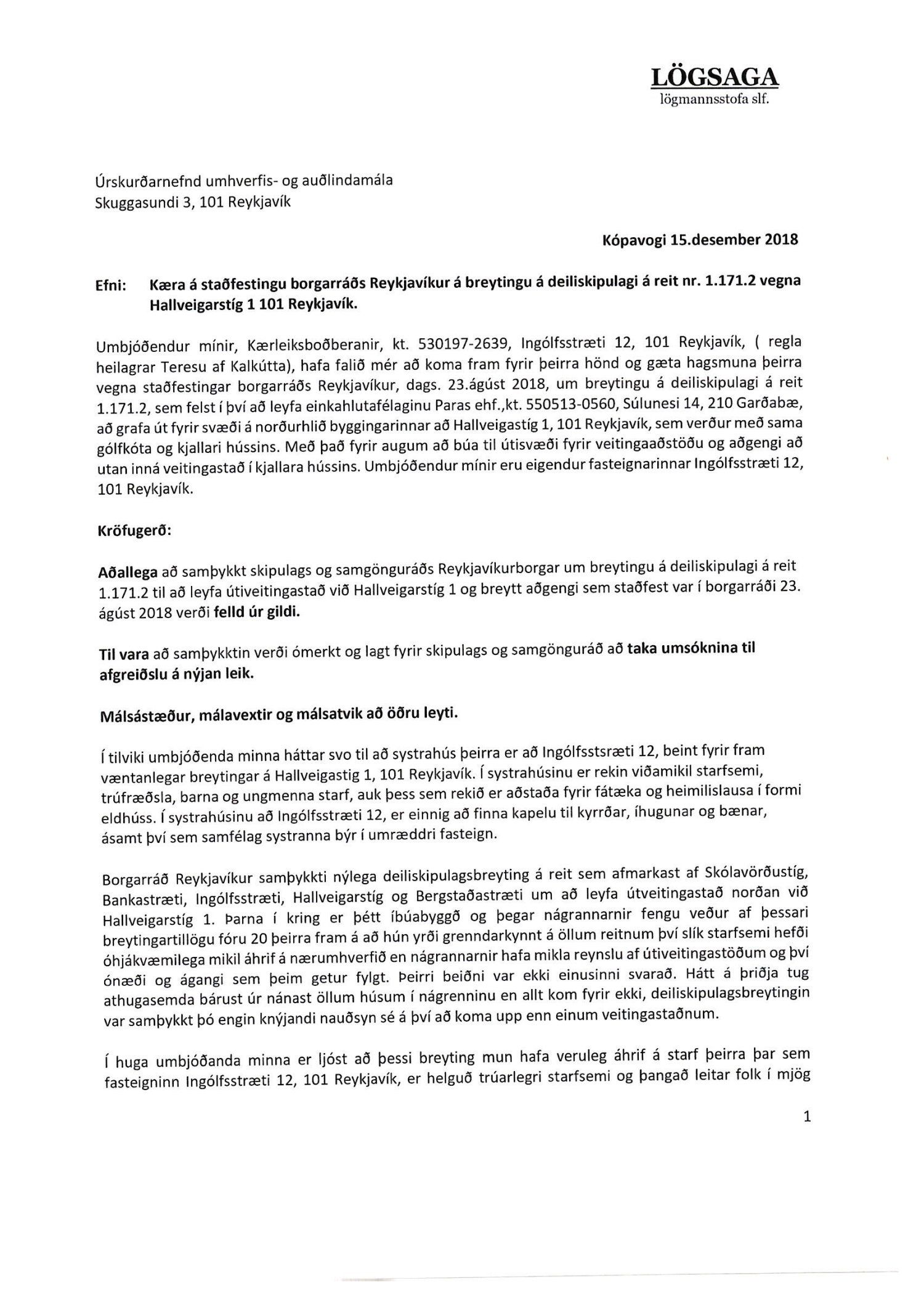 Lagt fram erindi úrskurðarnefndar umhverfis- og auðlindamála dags. 18. desember 2018 ásamt kæru dags. 15. desember 2018 þar sem kærð er samþykkt borgarráðs frá 23. ágúst 2018 á breytingu á deiliskipulagi reits 1.171.2 vegna lóðarinnar nr. 1 við Hallveigarstíg.