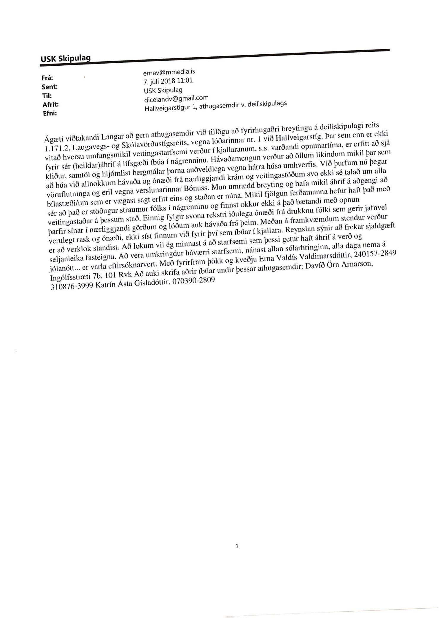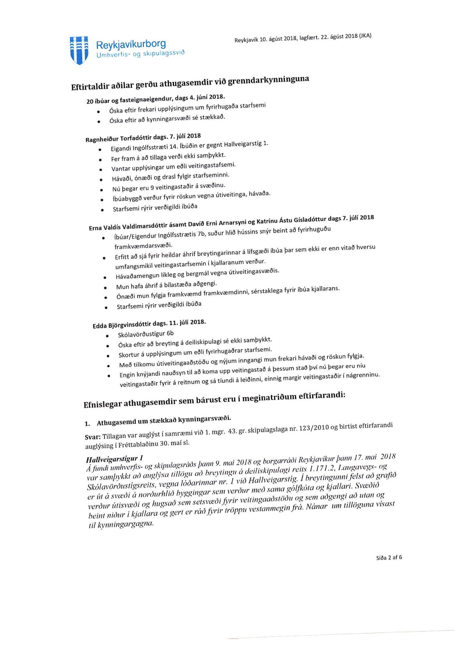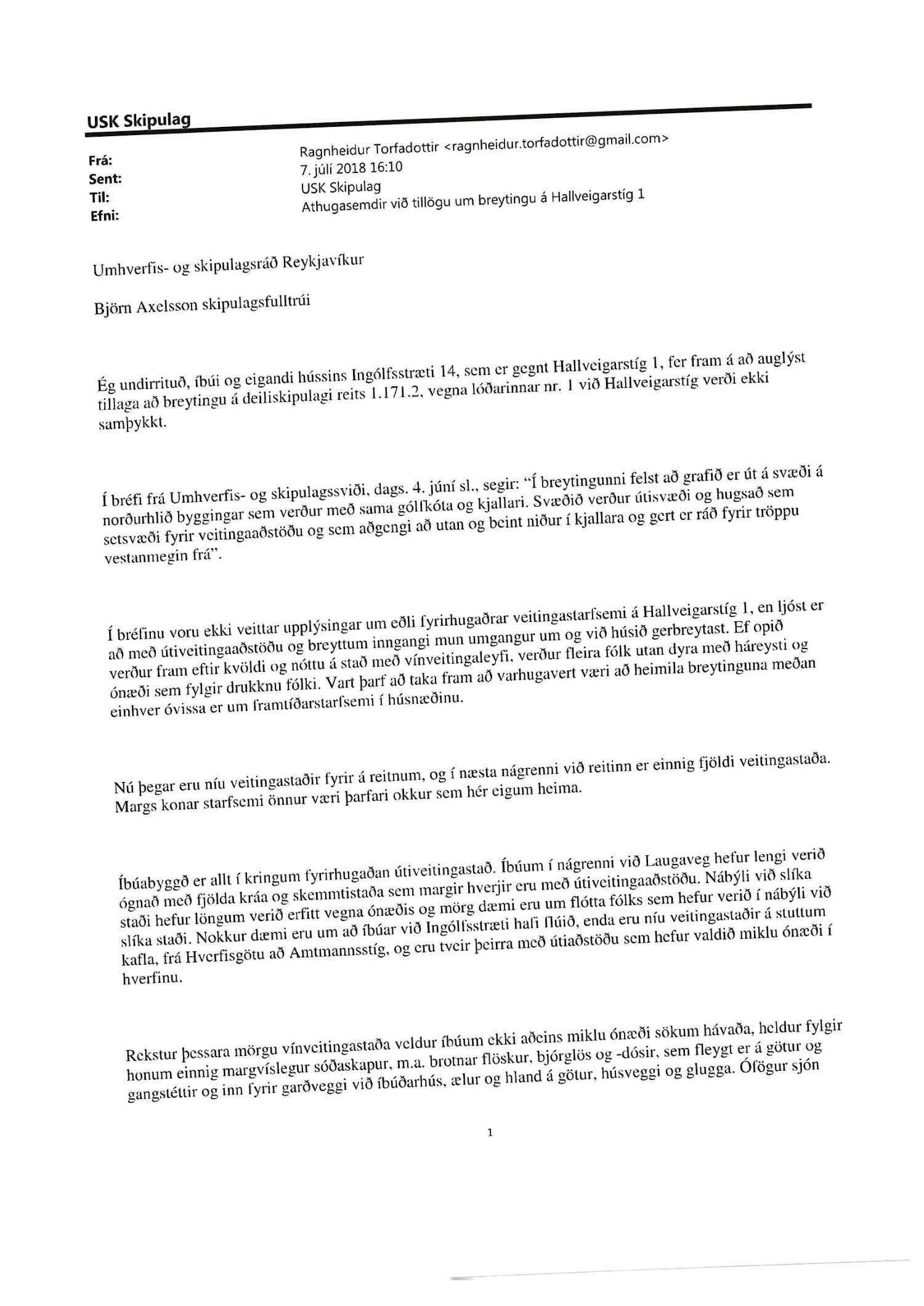 Lagt fram erindi úrskurðarnefndar umhverfis- og auðlindamála dags. 18. desember 2018 ásamt kæru dags. 15. desember 2018 þar sem kærð er samþykkt borgarráðs frá 23. ágúst 2018 á breytingu á deiliskipulagi reits 1.171.2 vegna lóðarinnar nr. 1 við Hallveigarstíg.