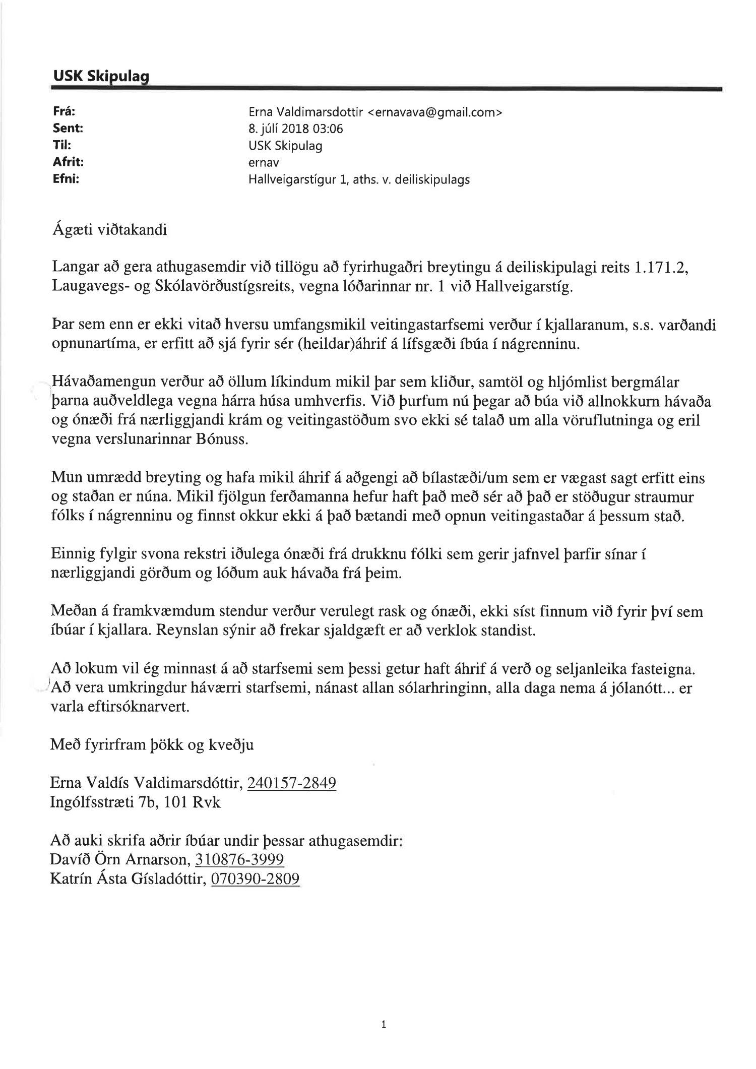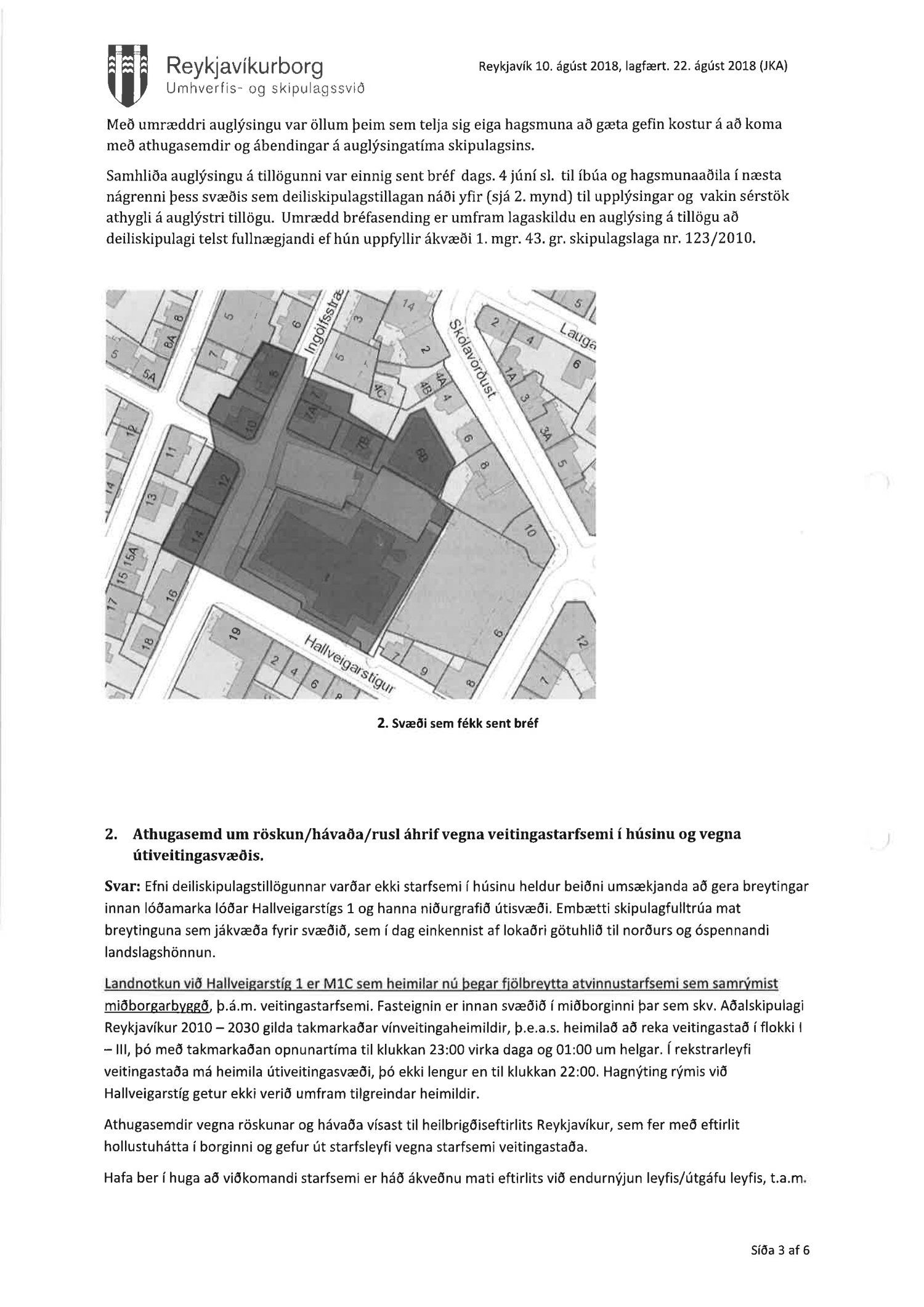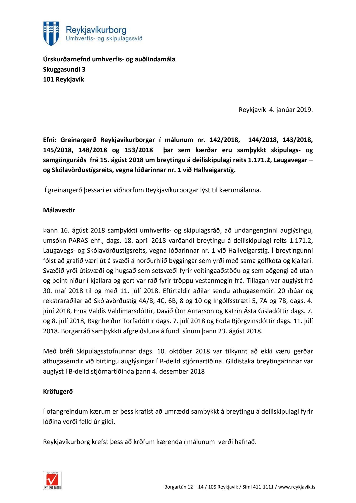 Lagt fram erindi úrskurðarnefndar umhverfis- og auðlindamála dags. 18. desember 2018 ásamt kæru dags. 16. desember 2018 þar sem kærð er samþykkt borgarráðs frá 23. ágúst 2018 á breytingu á deiliskipulagi reits 1.171.2 vegna lóðarinnar nr. 1 við Hallveigarstíg. Einnig er lögð fram umsögn skrifstofu sviðsstjóra dags. 4. janúar 2019.