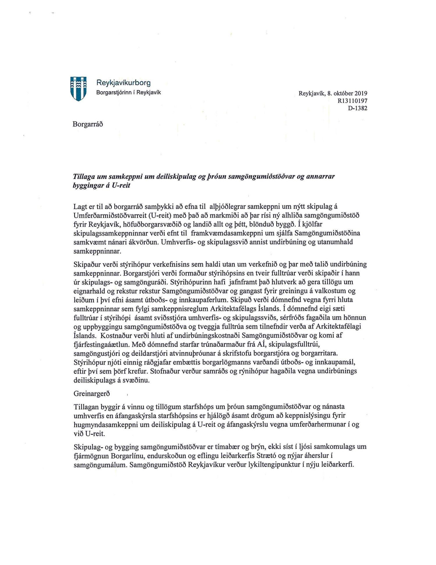 Lagt fram bréf borgarstjóra dags. 10. október 2019 vegna samþykktar borgarráðs s.d. á tillögu borgarstjóra dags. 8. október 2019 um að borgarráð feli skipulags- og samgönguráði að efna til hugmyndasamkeppni um nýtt skipulag á Umferðarmiðstöðvarreit (U-reit). Skipaður verði stýrihópur, tveir fulltrúar verði skipaðir í hann úr skipulags- og samgönguráði. Einnig er lögð fram skýrsla starfshóps eftir umsagnarferli dags. október 2019, drög að keppnislýsingu dags. október 2019 og áfangaskýrsla Mannvits vegna umferðarhermunar dags. október 2019.