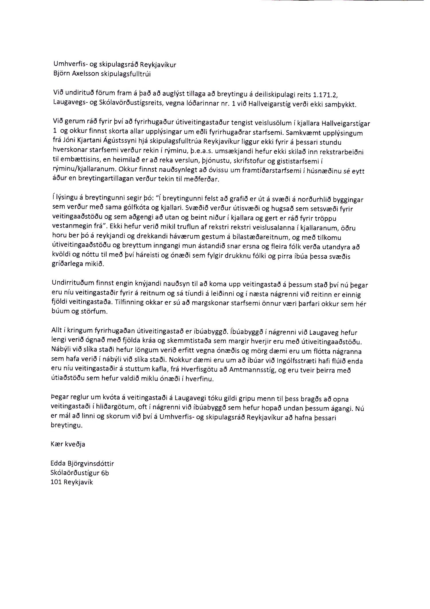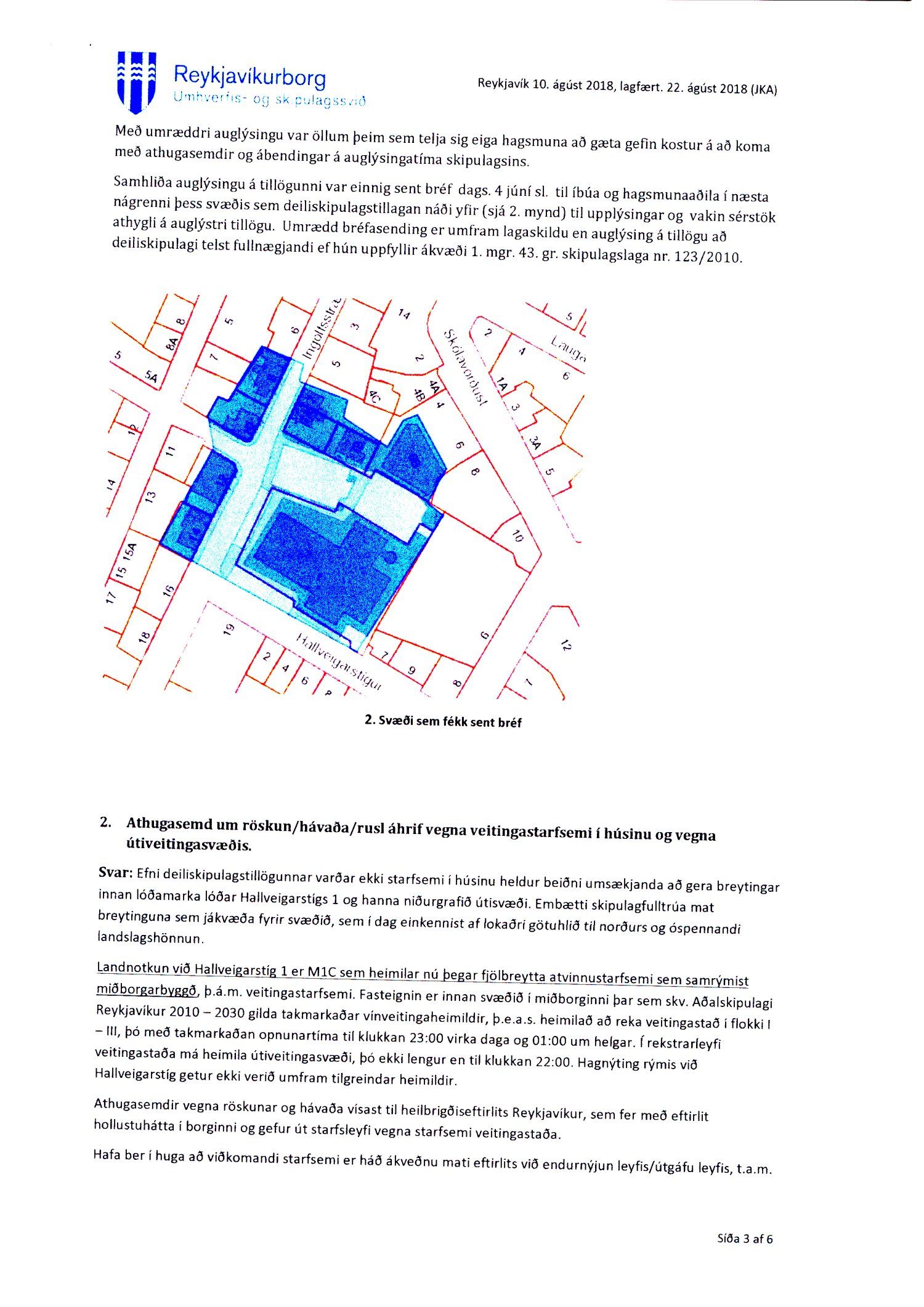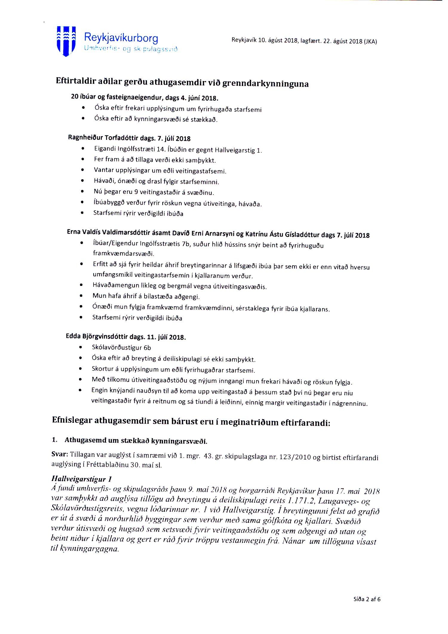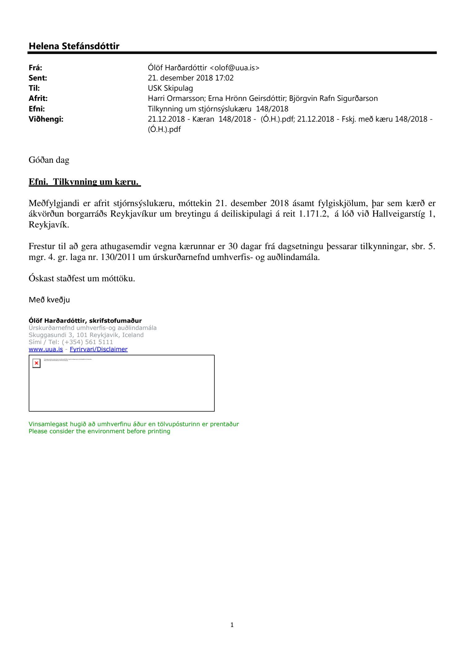 Lagt fram erindi úrskurðarnefndar umhverfis- og auðlindamála dags. 21. desember 2018 ásamt kæru dags. 8. desember 2018 þar sem kærð er samþykkt borgarráðs frá 23. ágúst 2018 á breytingu á deiliskipulagi reits 1.171.2 vegna lóðarinnar nr. 1 við Hallveigarstíg. Einnig er lögð fram umsögn skrifstofu sviðsstjóra dags. 4. janúar 2019.