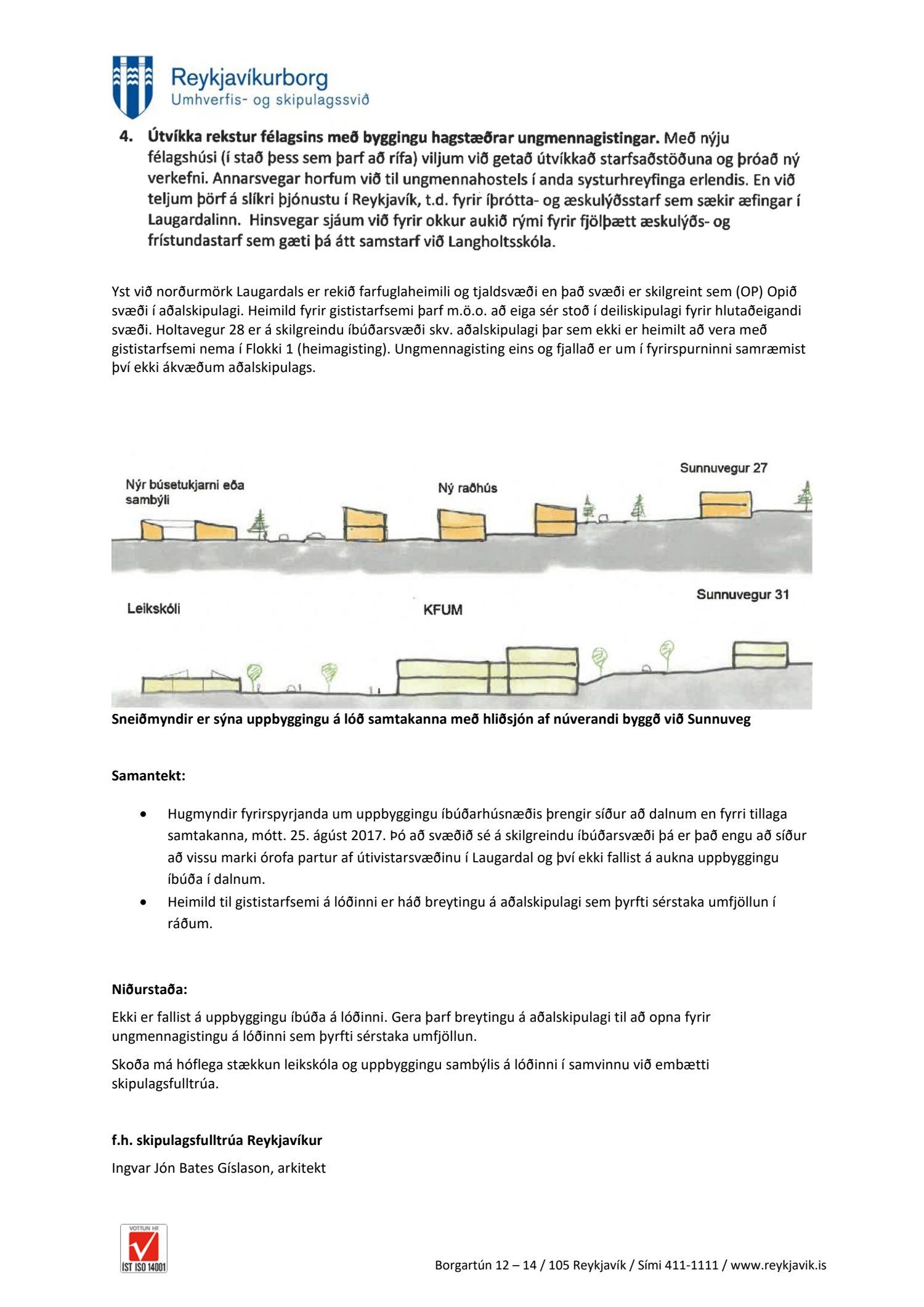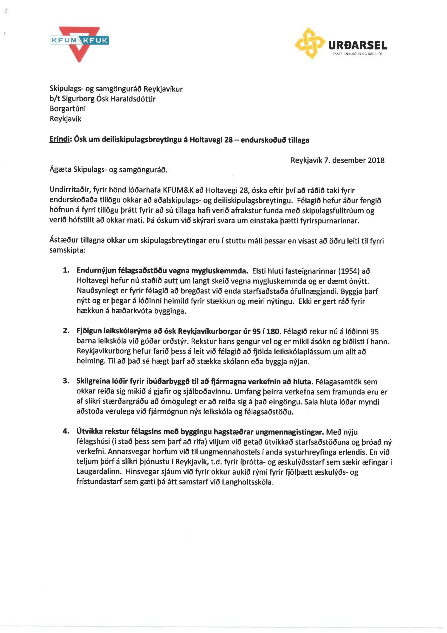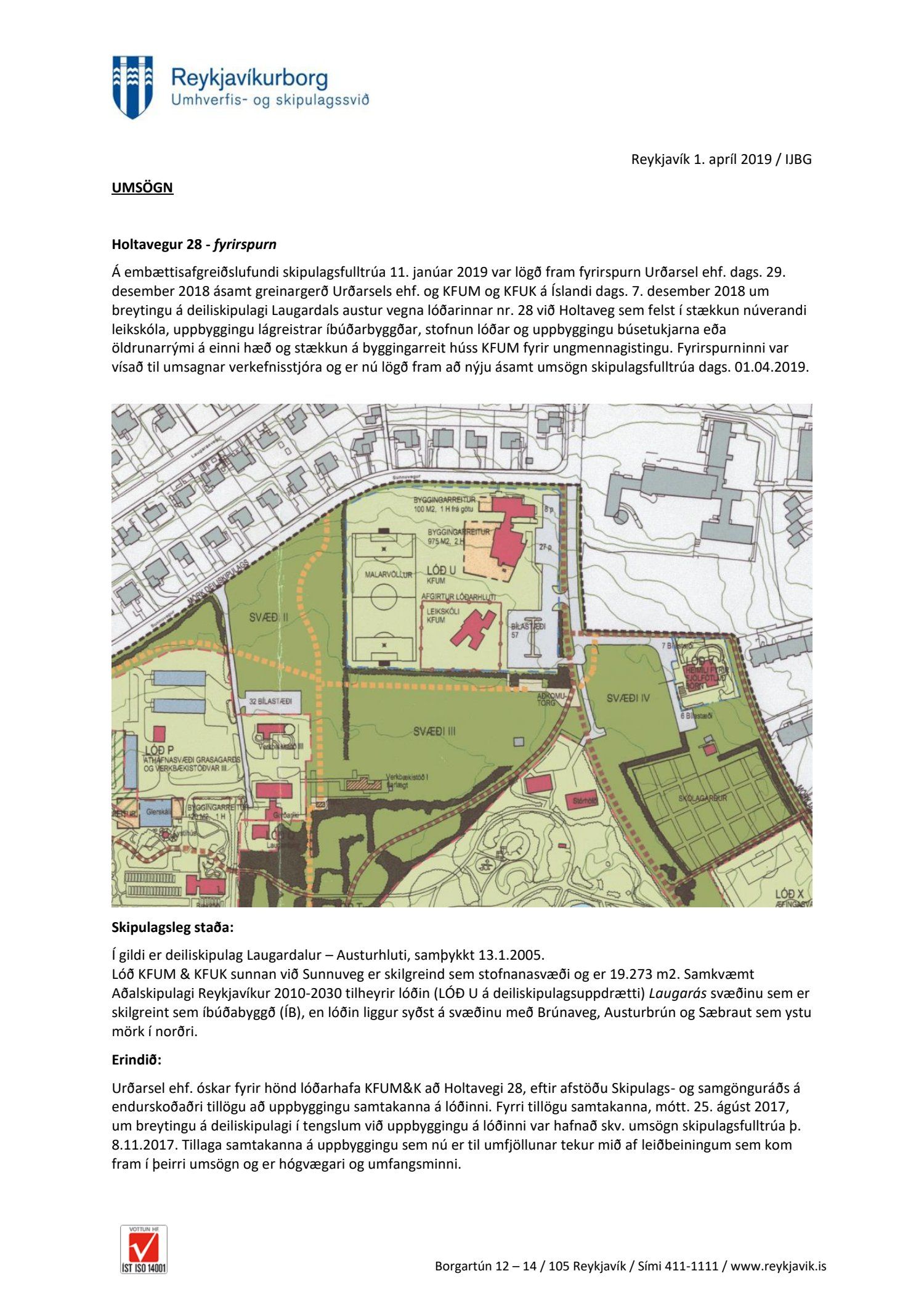 og KFUM og KFUK á Íslandi dags. 7. desember 2018 um breytingu á deiliskipulagi Laugardals austur vegna lóðarinnar nr. 28 við Holtaveg sem felst í stækkun núverandi leikskóla, uppbyggingu lágreistrar íbúðarbyggðar, stofnun lóðar og uppbyggingu búsetukjarna eða öldrunarrými á einni hæð og stækkun á byggingarreit húss KFUM fyrir ungmennagistingu. Fyrirspurninni var vísað til umsagnar verkefnisstjóra og er nú lögð fram að nýju ásamt umsögn skipulagsfulltrúa dags. 1.apríl 2019.