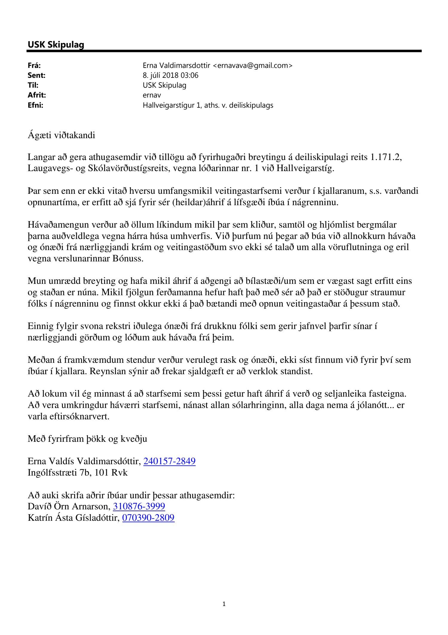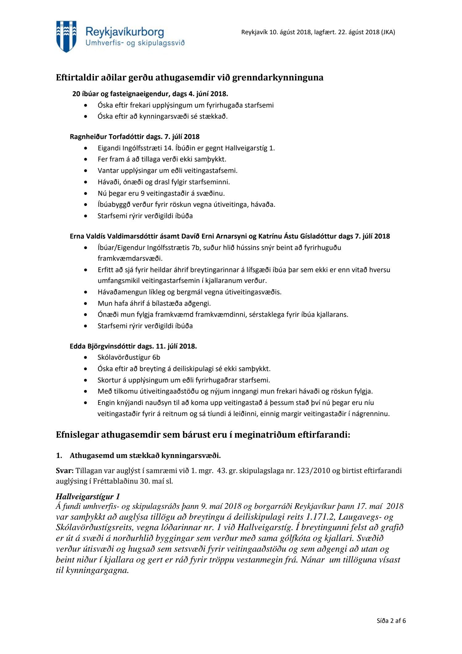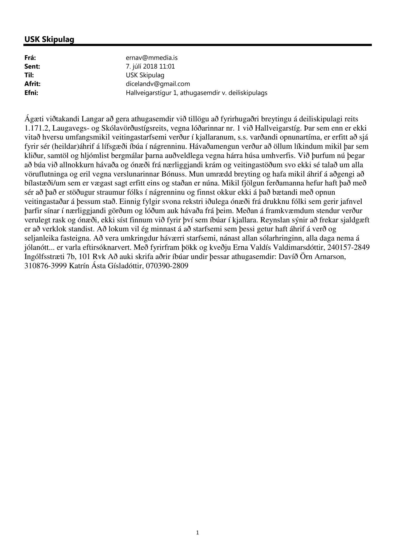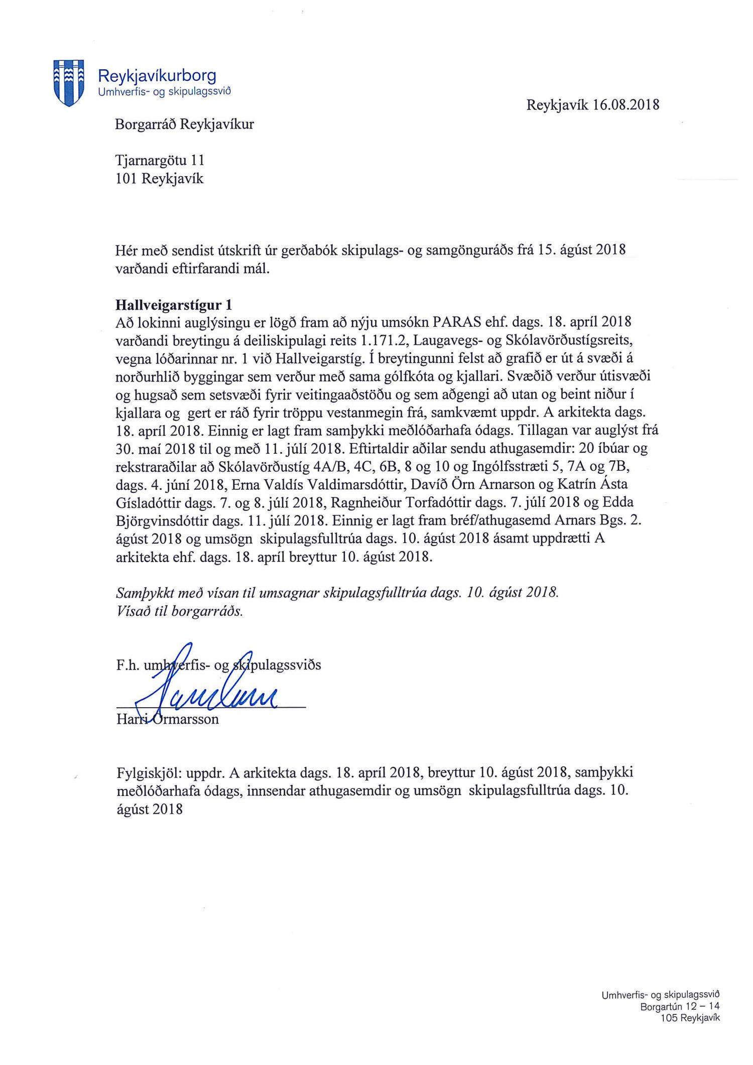 Lagt fram erindi úrskurðarnefndar umhverfis- og auðlindamála dags. 3. janúar 2019 ásamt kæru dags. 29. desember 2018 þar sem kærð er samþykkt borgarráðs frá 23. ágúst 2018 á breytingu á deiliskipulagi reits 1.171.2 vegna lóðarinnar nr. 1 við Hallveigarstíg.
