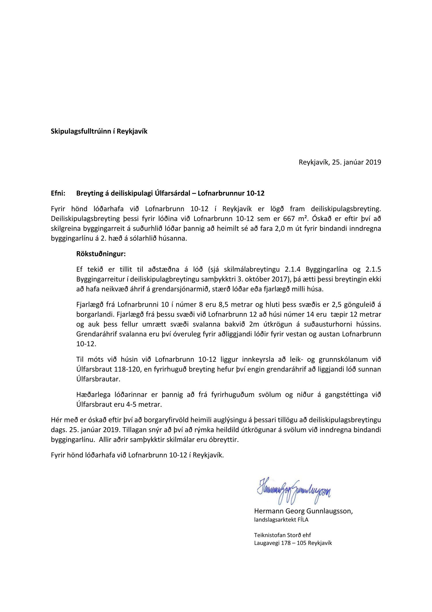 Lögð fram umsókn Hermanns Georgs Gunnlaugssonar dags. 30. janúar 2019 ásamt bréfi dags. 25. janúar 2019 varðandi breytingu á skilmálum deiliskipulags Úlfarsárdals vegna lóðarinnar nr. 10-12 við Lofnarbrunn. Í breytingunni felst að heimilt er að svalir á 2. hæð hússins skagi allt að 200 cm. út fyrir bindandi inndregna byggingarlínu, samkvæmt tillögu Teiknistofunnar Storð ehf. dags. 25. janúar 2019.