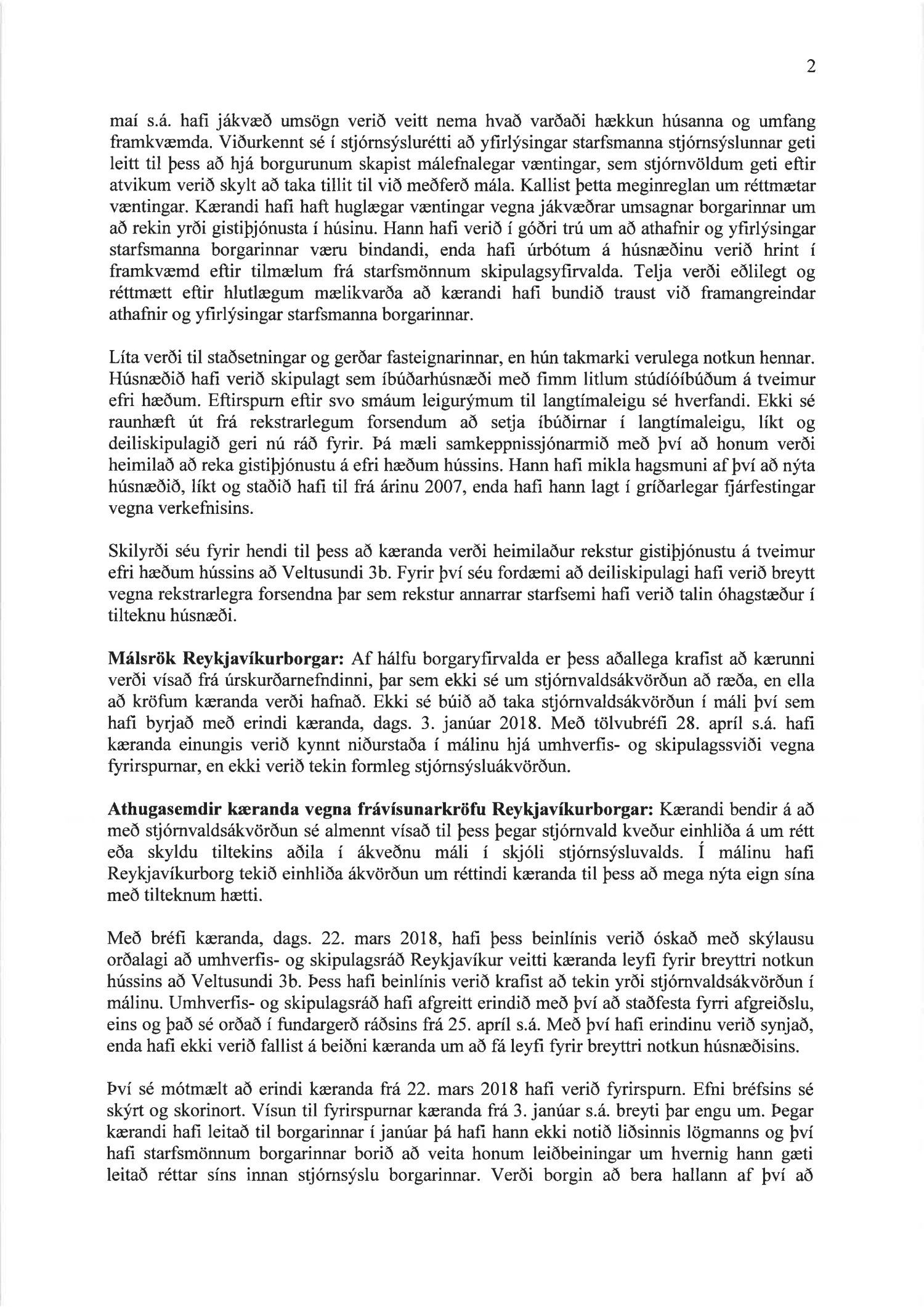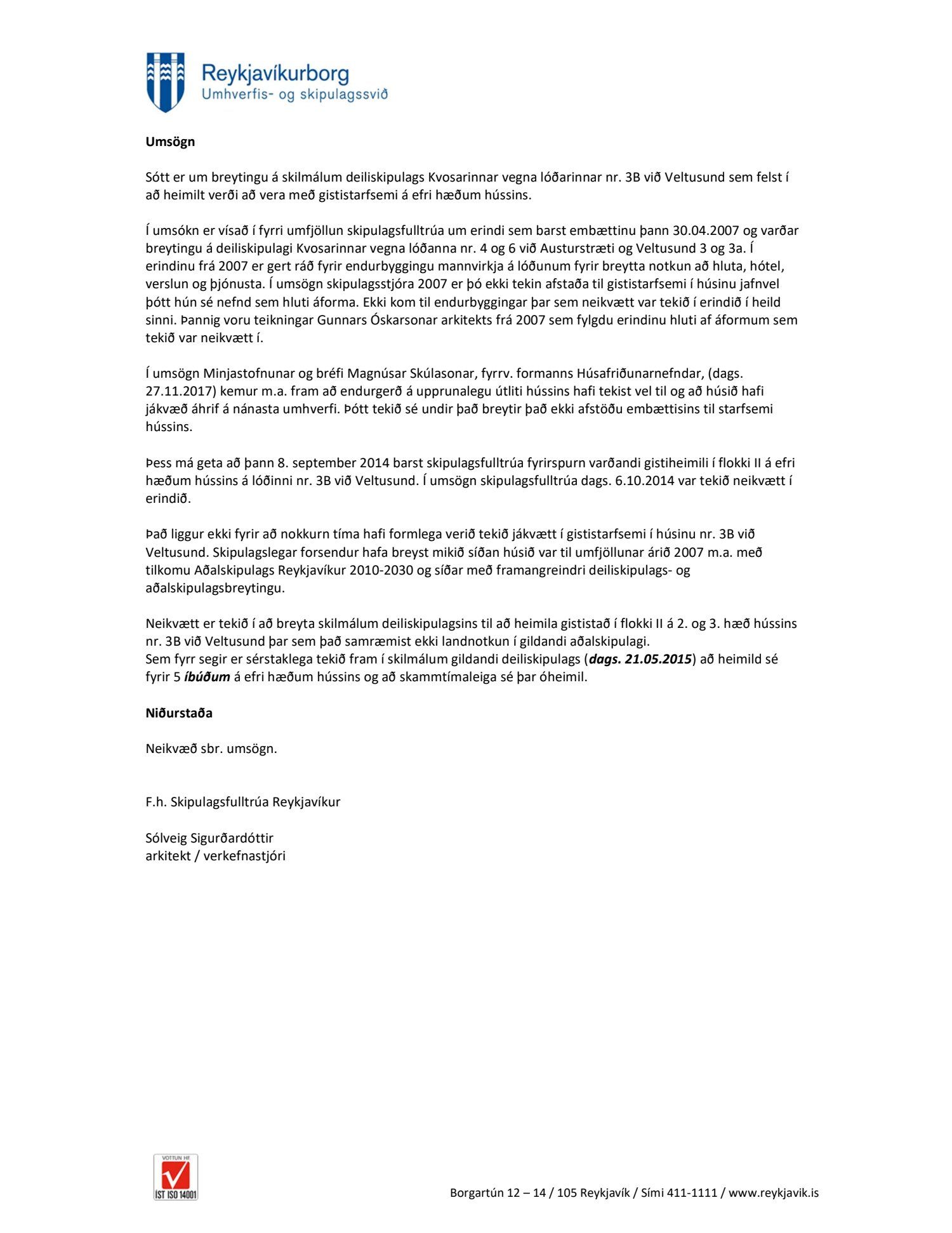 Áheyrnarfulltrúi Miðflokksins bókar: Miðflokkurinn telur að teknu tilliti til bæði forsögu málsins samkvæmt bréfi lögmanns og sanngirnissjónarmiða að rétt sé að samþykkja umsókn Lögmanna Sundagörðum dags. 22. mars 2018, f.h. lóðarhafa, varðandi breytingu á skilmálum deiliskipulags Kvosarinnar vegna lóðarinnar nr. 3B við Veltusund, samkvæmt beiðni um endurupptöku frá 22. mars 2018.