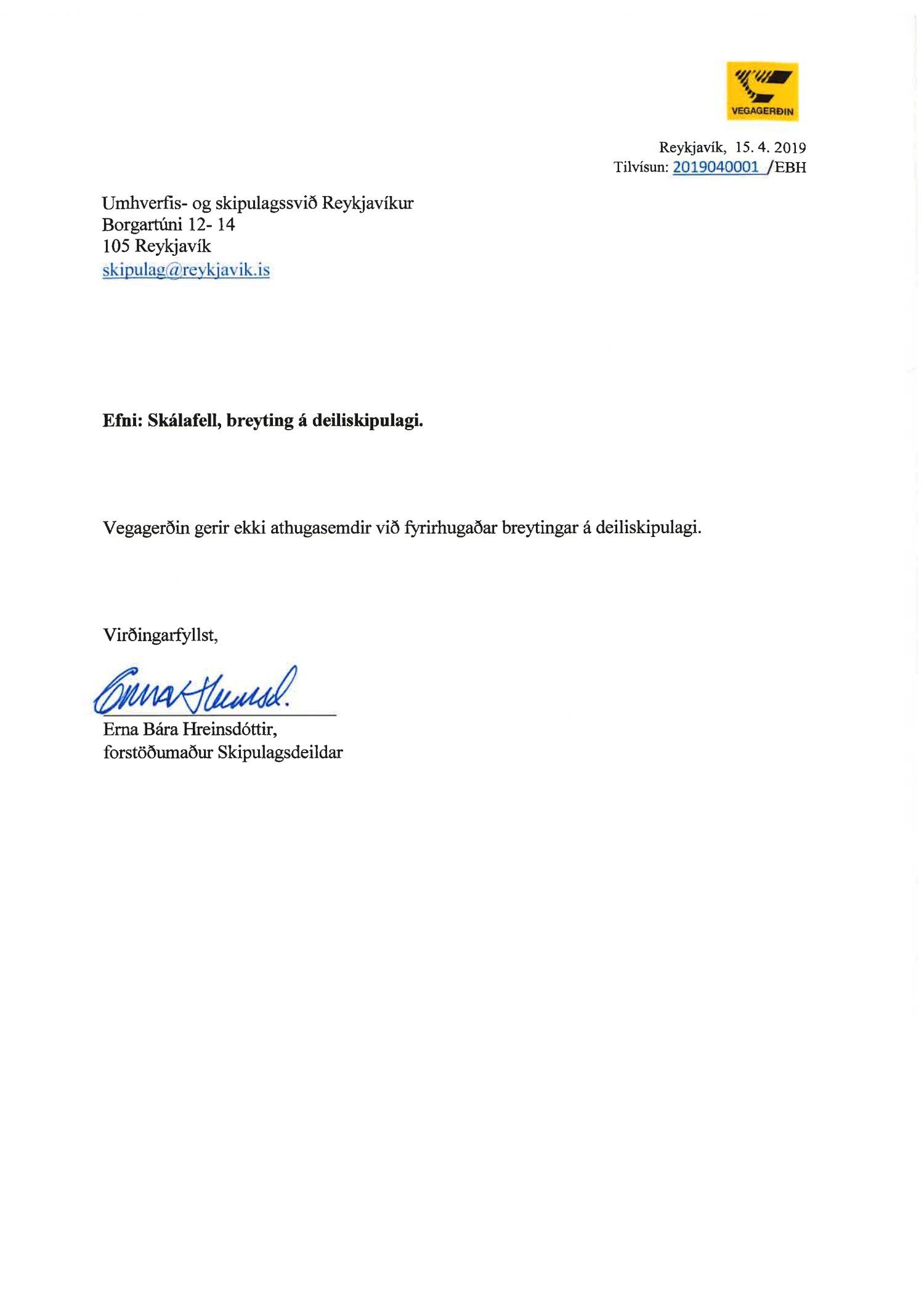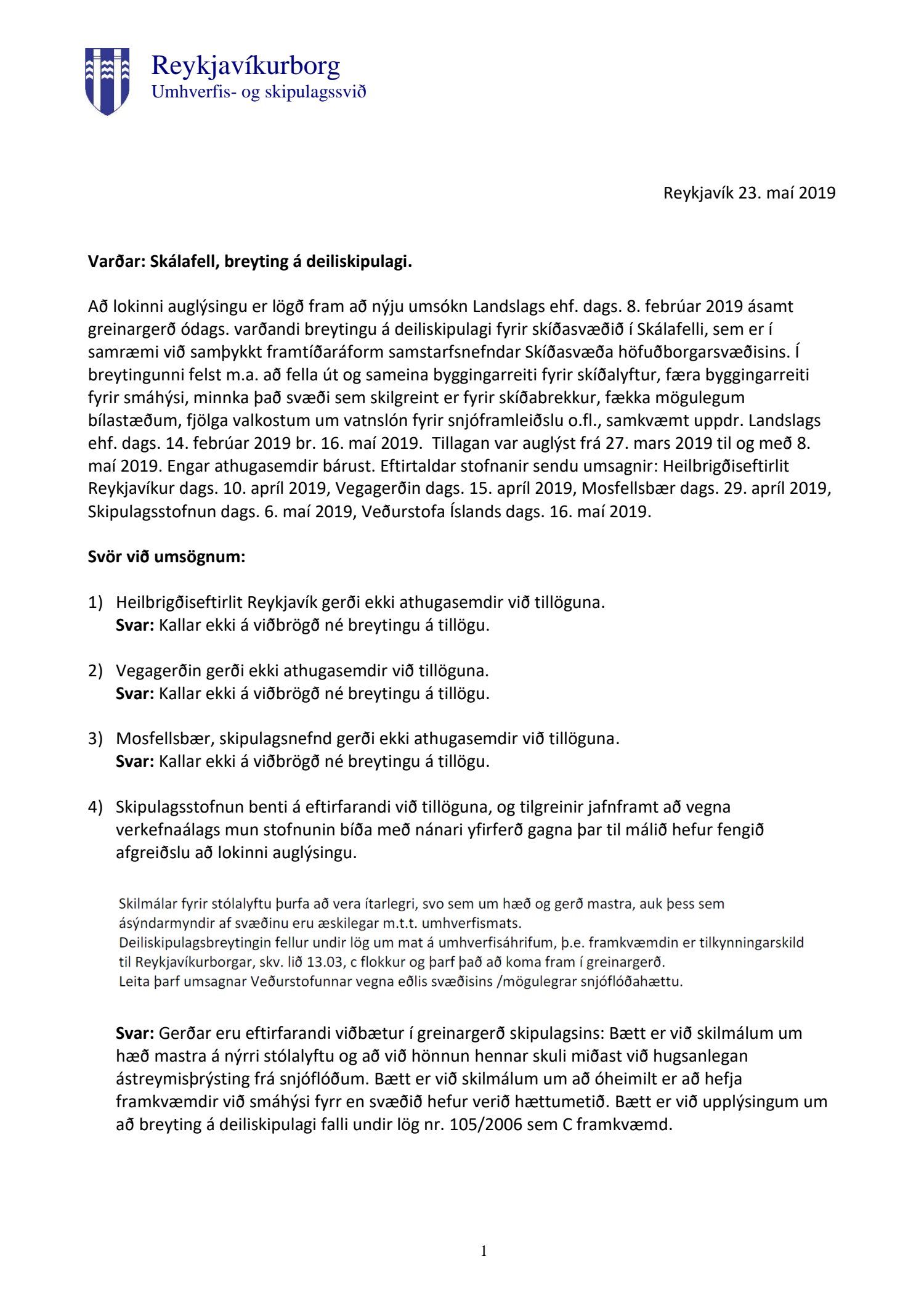 dags. 14. febrúar 2019 br. 16. maí 2019. Tillagan var auglýst frá 27. mars 2019 til og með 8. maí 2019. Engar athugasemdir bárust. Eftirtaldar stofnanir sendu umsagnir: Heilbrigðiseftirlit Reykjavíkur dags. 10. apríl 2019, Vegagerðin dags. 15. apríl 2019, Mosfellsbær dags. 29. apríl 2019, Skipulagsstofnun dags. 6. maí 2019 og Veðurstofa Íslands dags. 16. maí 2019. Erindinu var vísað til umsagnar verkefnisstjóra á embættisafgreiðslufundi skipulagsfulltrúa 17. maí 2019 og er nú lagt fram að nýju ásamt umsögn skipulagsfulltrúa dags. 23. maí 2019.