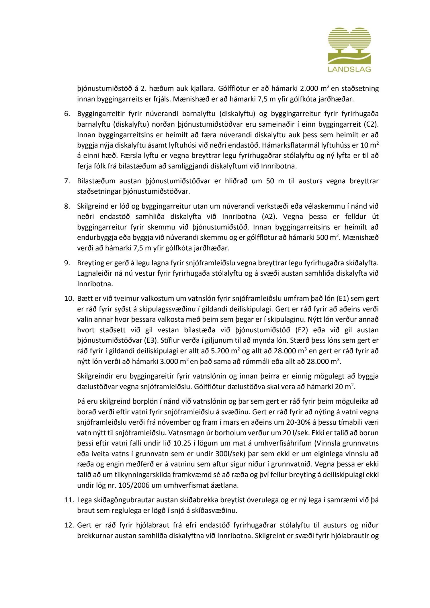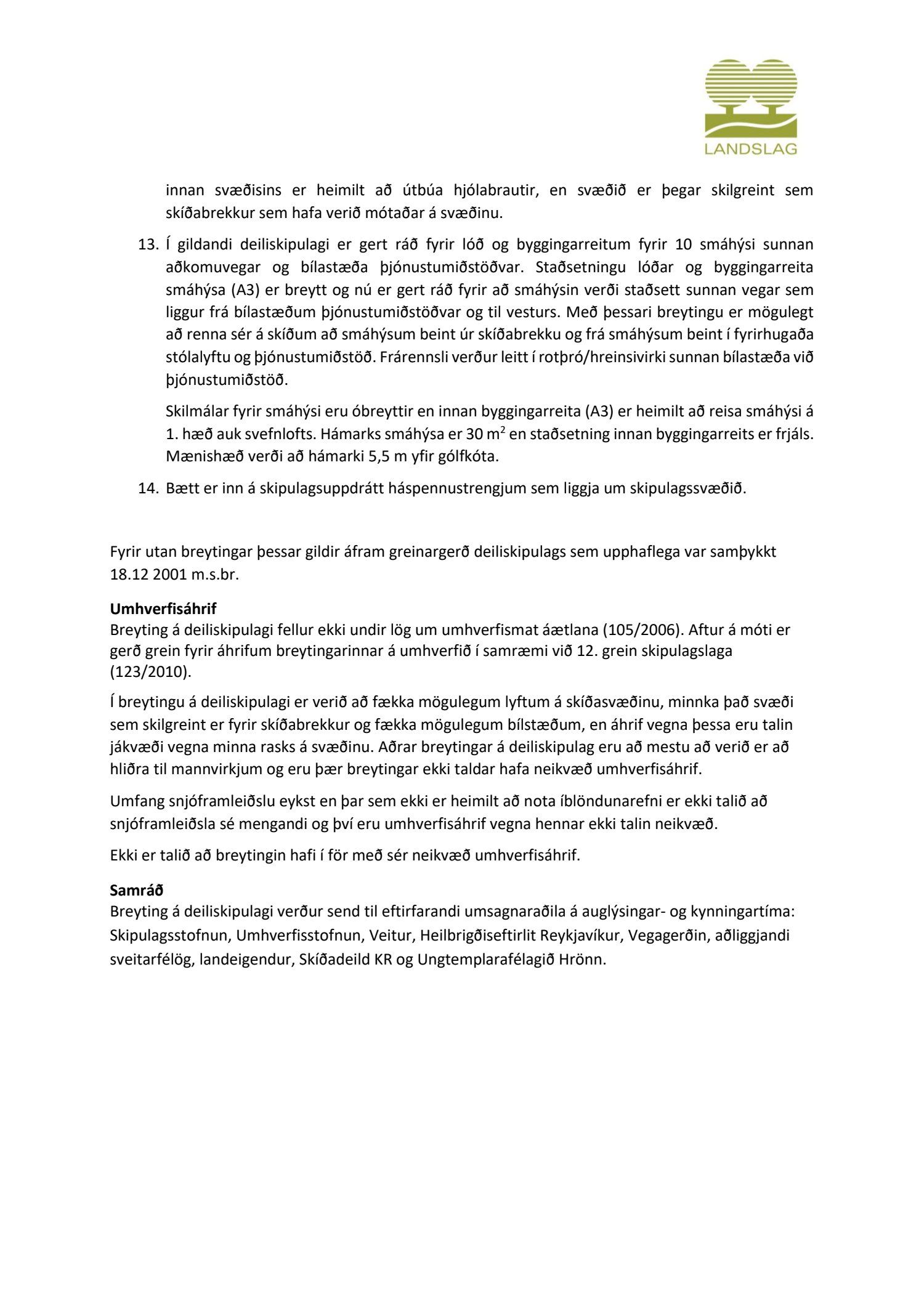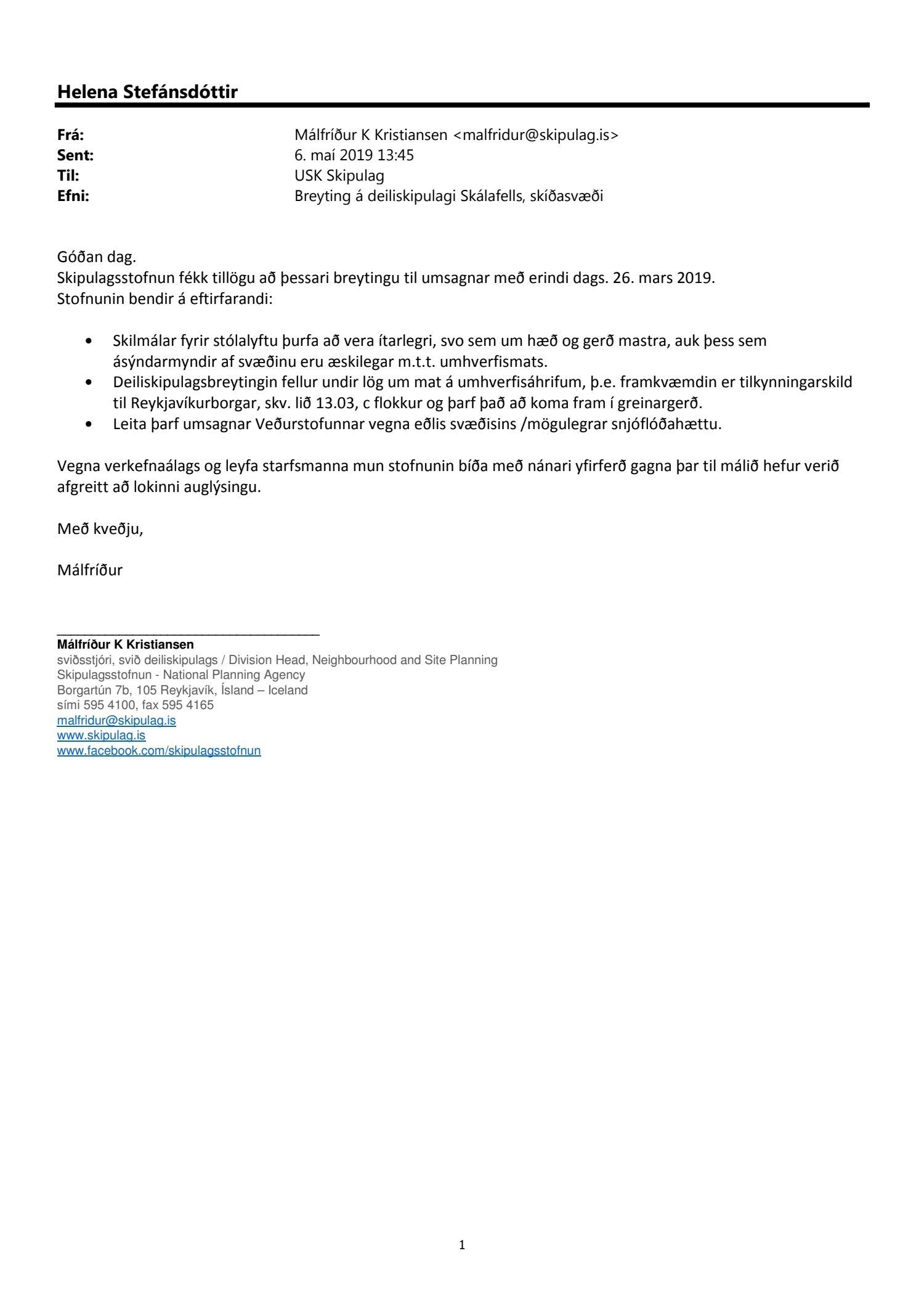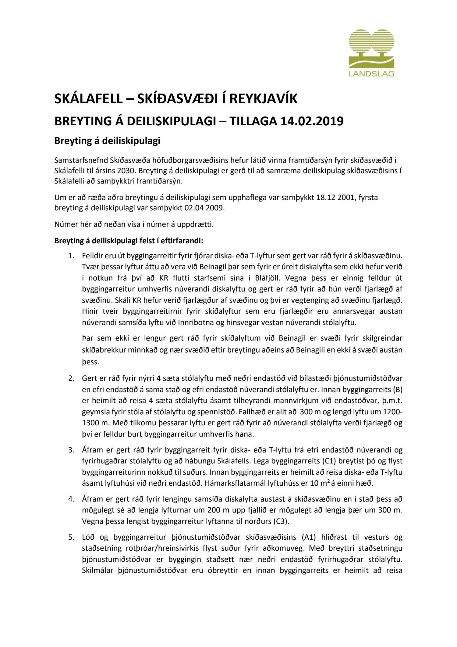 dags. 8. febrúar 2019 ásamt greinargerð ódags. varðandi breytingu á deiliskipulagi fyrir skíðasvæðið í Skálafelli, sem er í samræmi við samþykkt framtíðaráform samstarfsnefndar Skíðasvæða höfuðborgarsvæðisins. Í breytingunni felst m.a. að fella út og sameina byggingarreiti fyrir skíðalyftur, færa byggingarreiti fyrir smáhýsi, minnka það svæði sem skilgreint er fyrir skíðabrekkur, fækka mögulegum bílastæðum, fjölga valkostum um vatnslón fyrir snjóframleiðslu o.fl., samkvæmt uppdr.